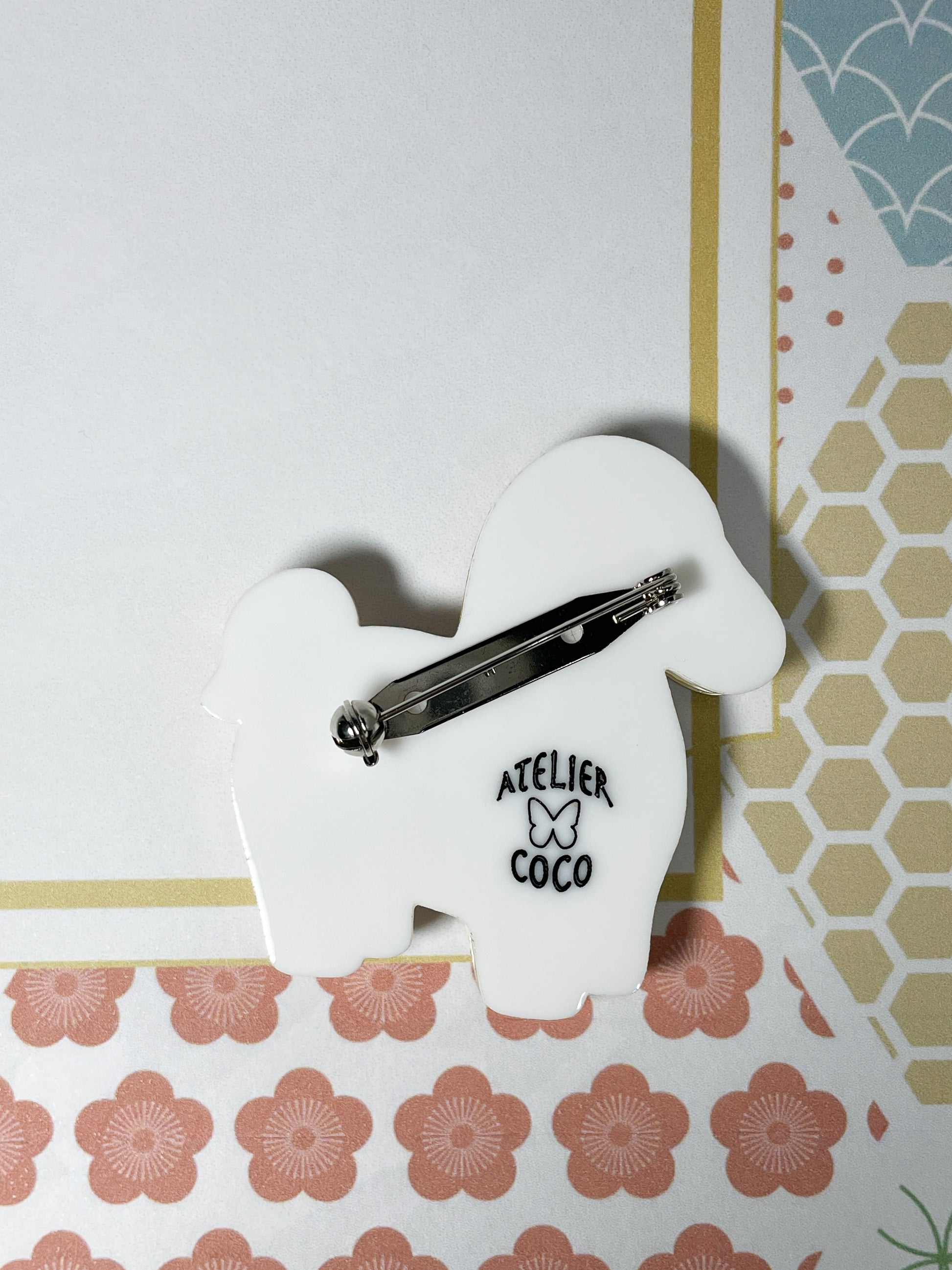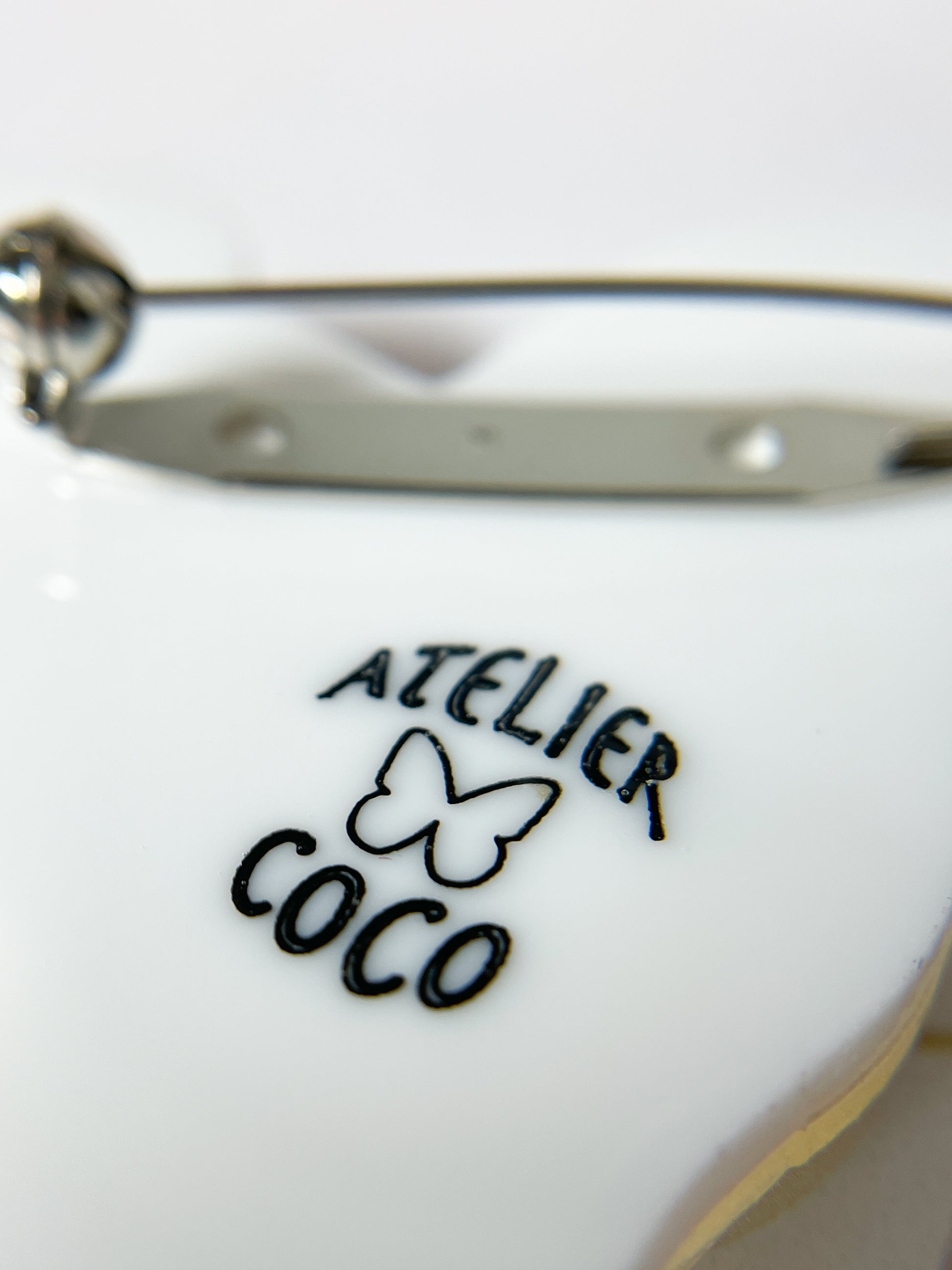 Das Originaldesign stammt von der japanischen Accessoire-Künstlerin Coco, und jede Brosche trägt auf der Rückseite das Logo „ATELIER COCO“.