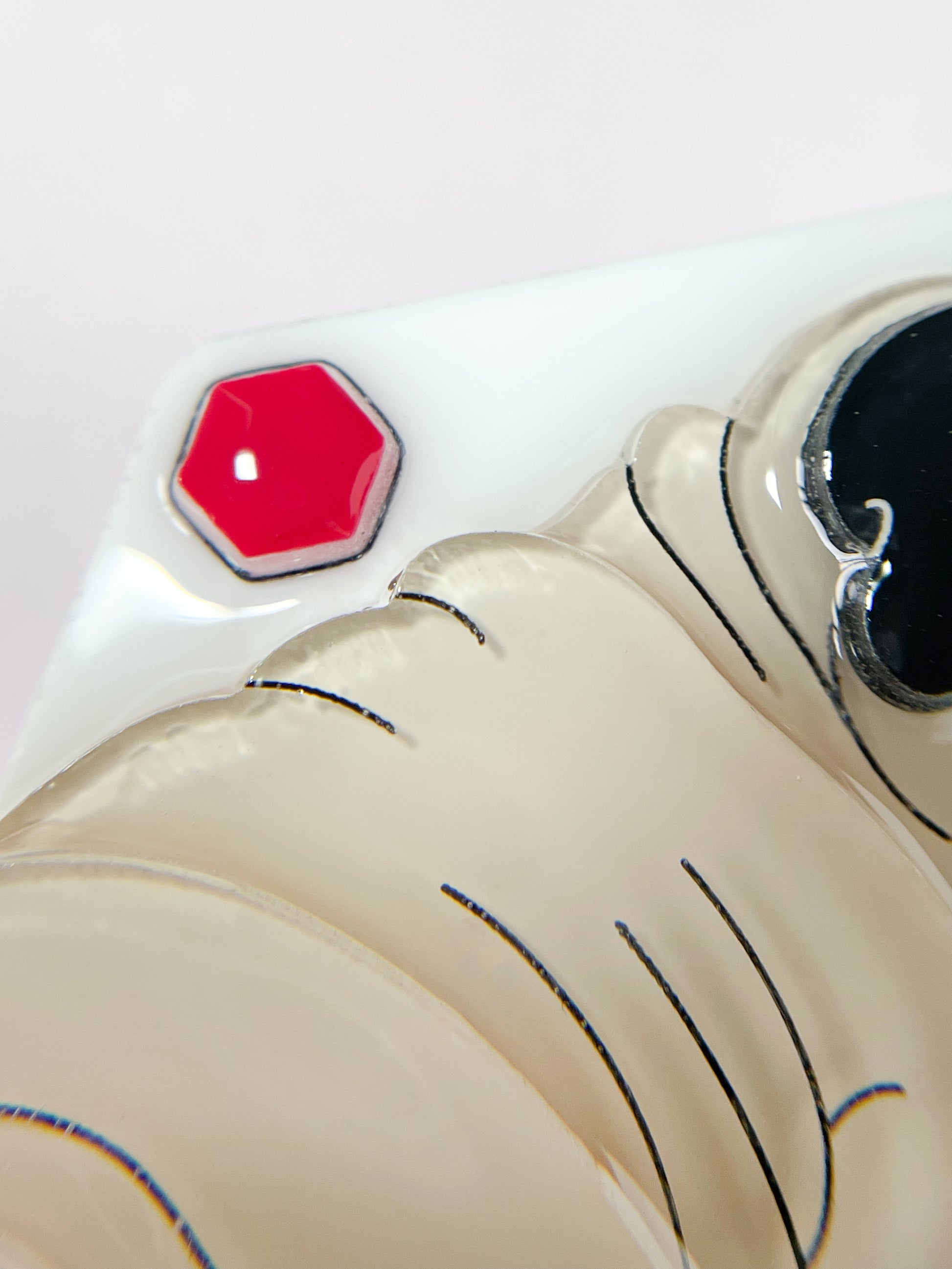 This brooch is made from 11 pieces of hand-painted acrylic plates, assembled and coated with acrylic UV/LED resin and backed with a silver brooch pin.