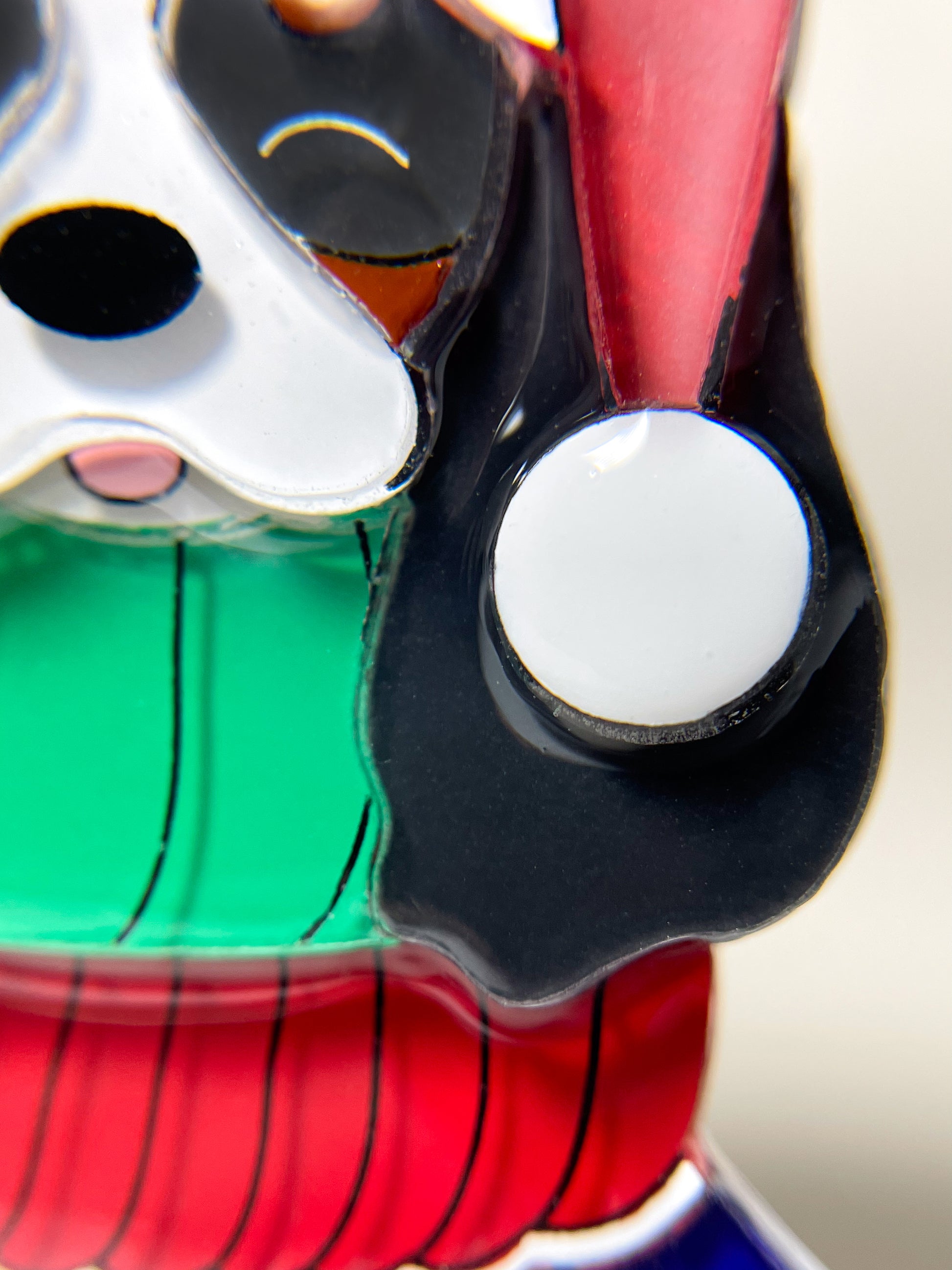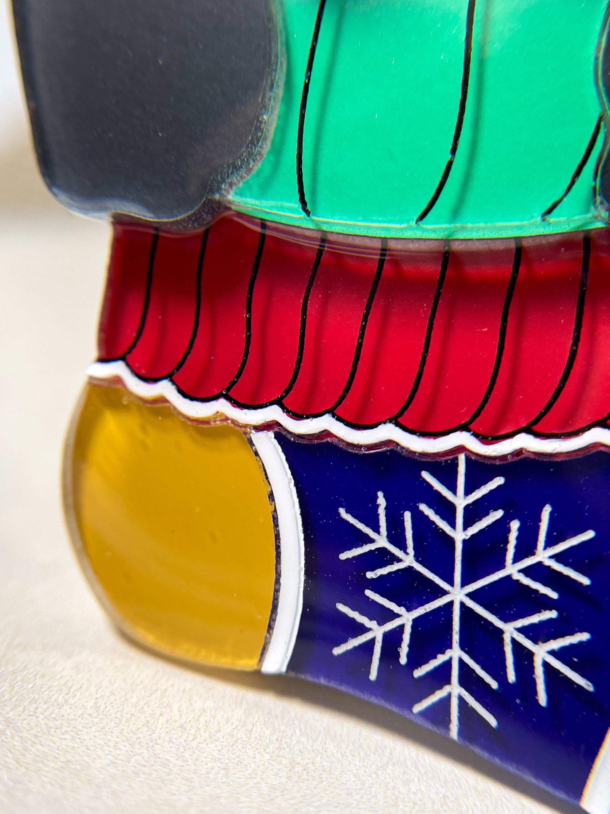 This brooch is made from 13 pieces of hand-painted acrylic plates, assembled and coated with acrylic UV/LED resin and backed with a silver brooch pin.