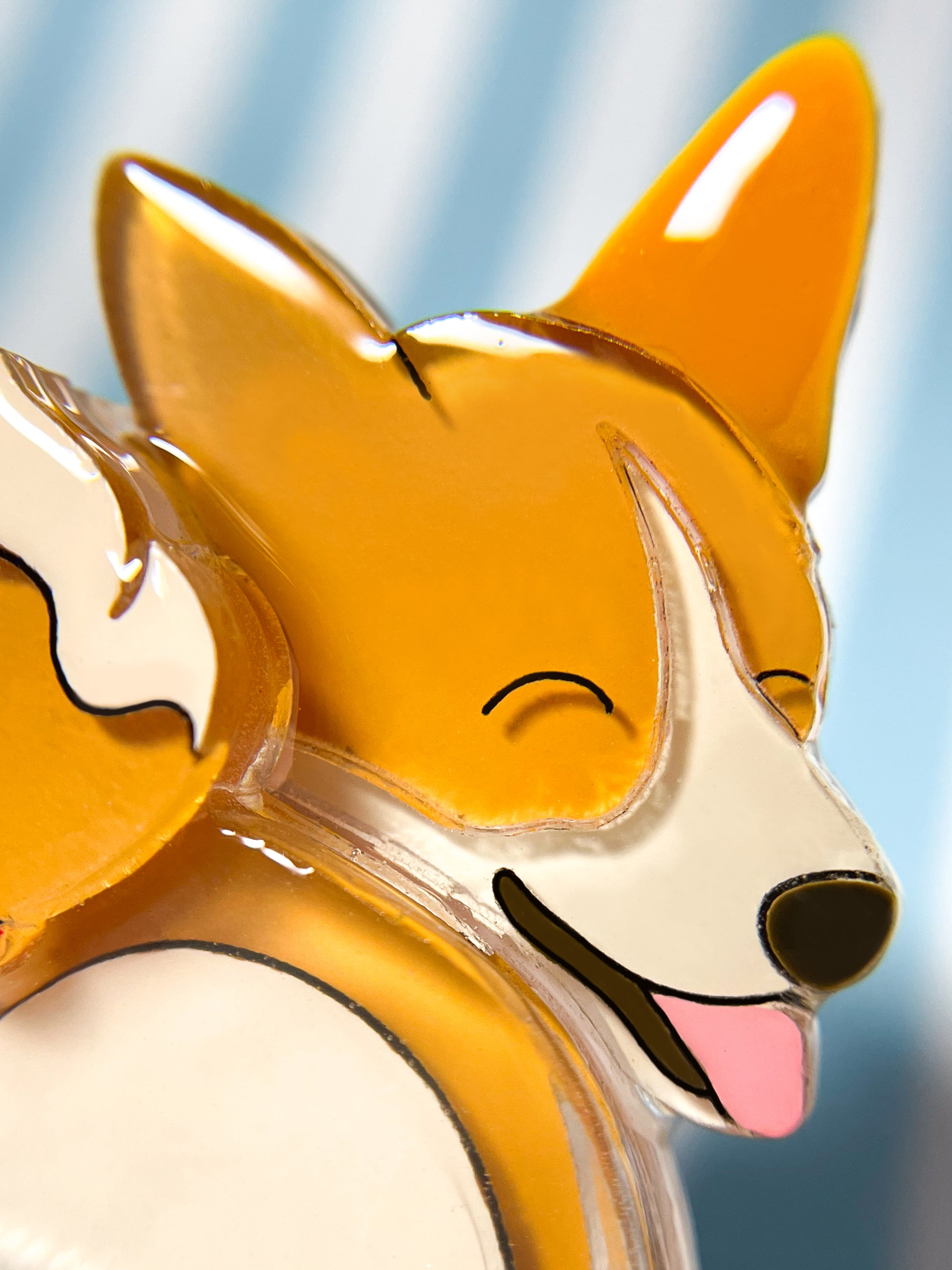 This brooch is made from 9 pieces of hand-painted acrylic plates, assembled and coated with acrylic UV/LED resin and backed with a silver brooch pin.