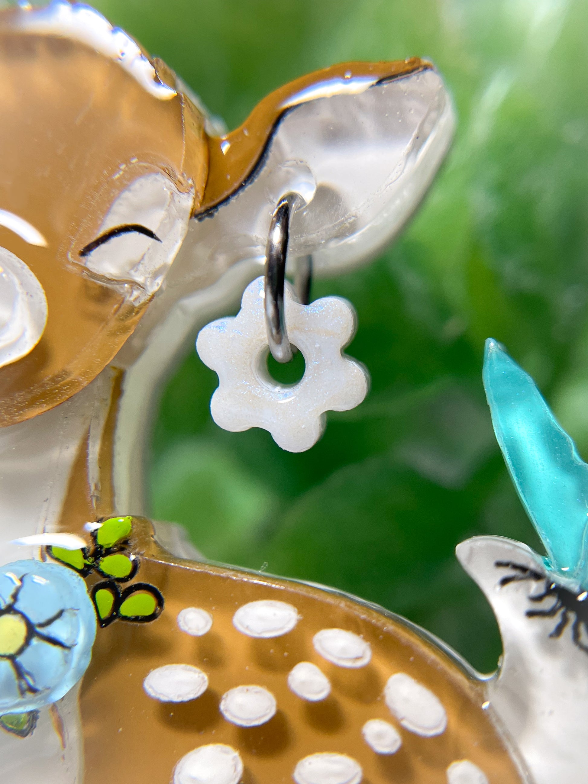 This brooch is made from 11 pieces of hand-painted acrylic plates, assembled and coated with acrylic UV/LED resin and backed with a silver brooch pin.