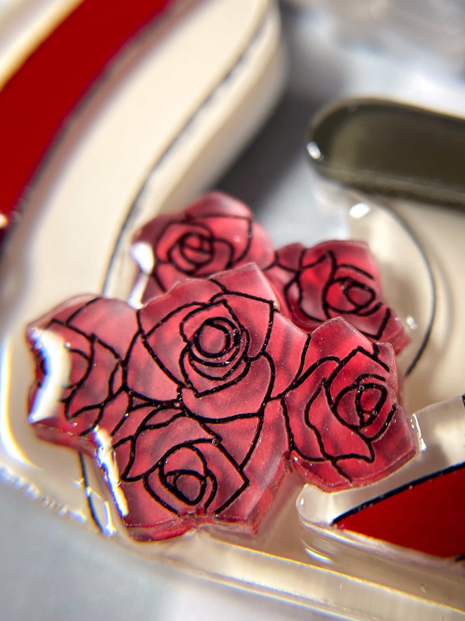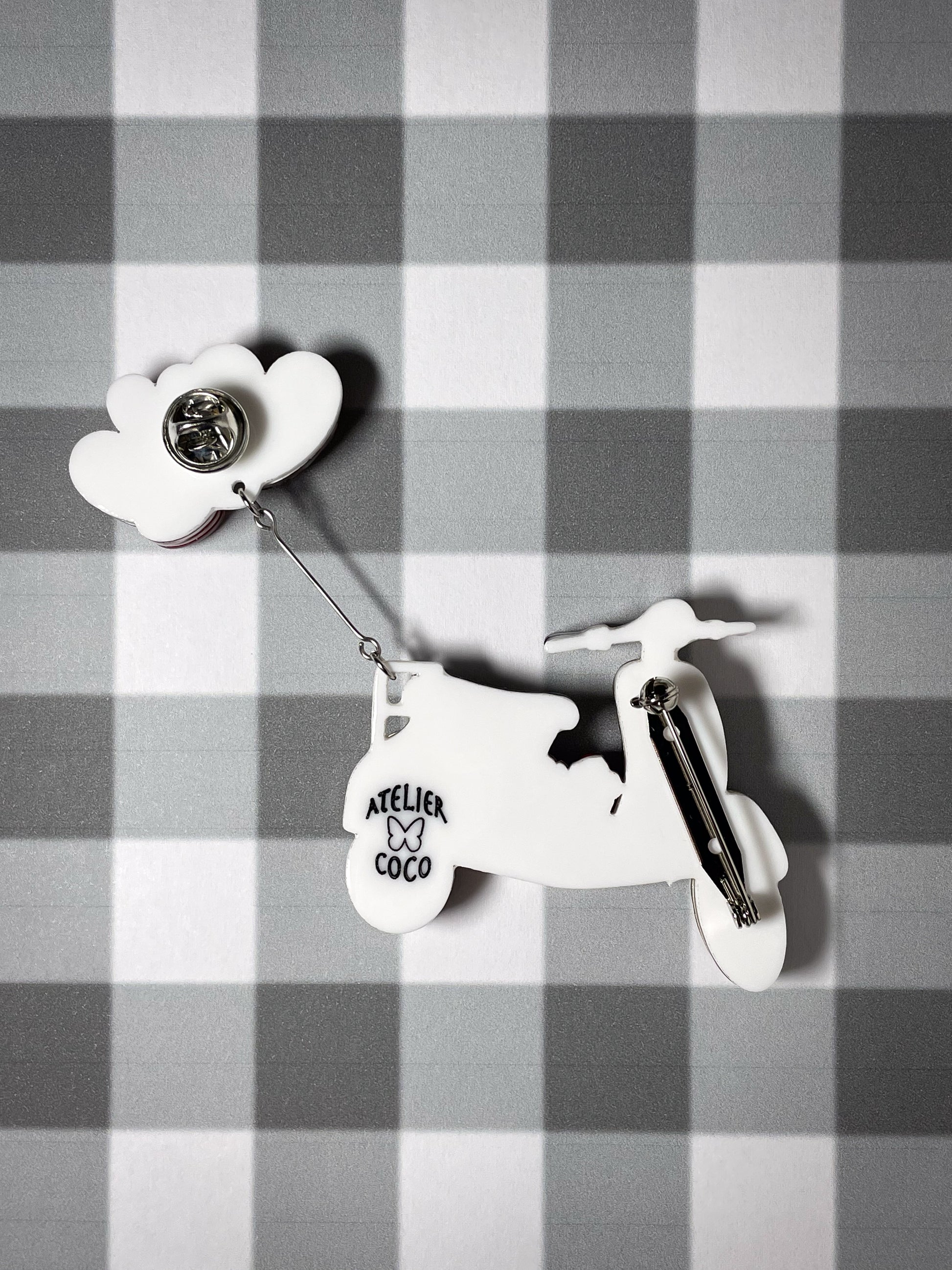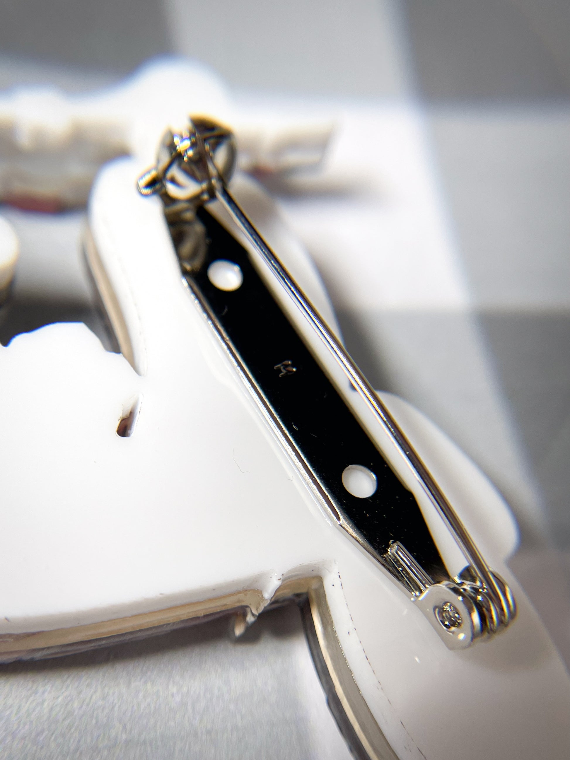 This brooch is made from 18 pieces of hand-painted acrylic plates and 2 pieces of OHP films, assembled and coated with acrylic UV/LED resin and backed with a silver brooch pin and a butterfly tack pin.
