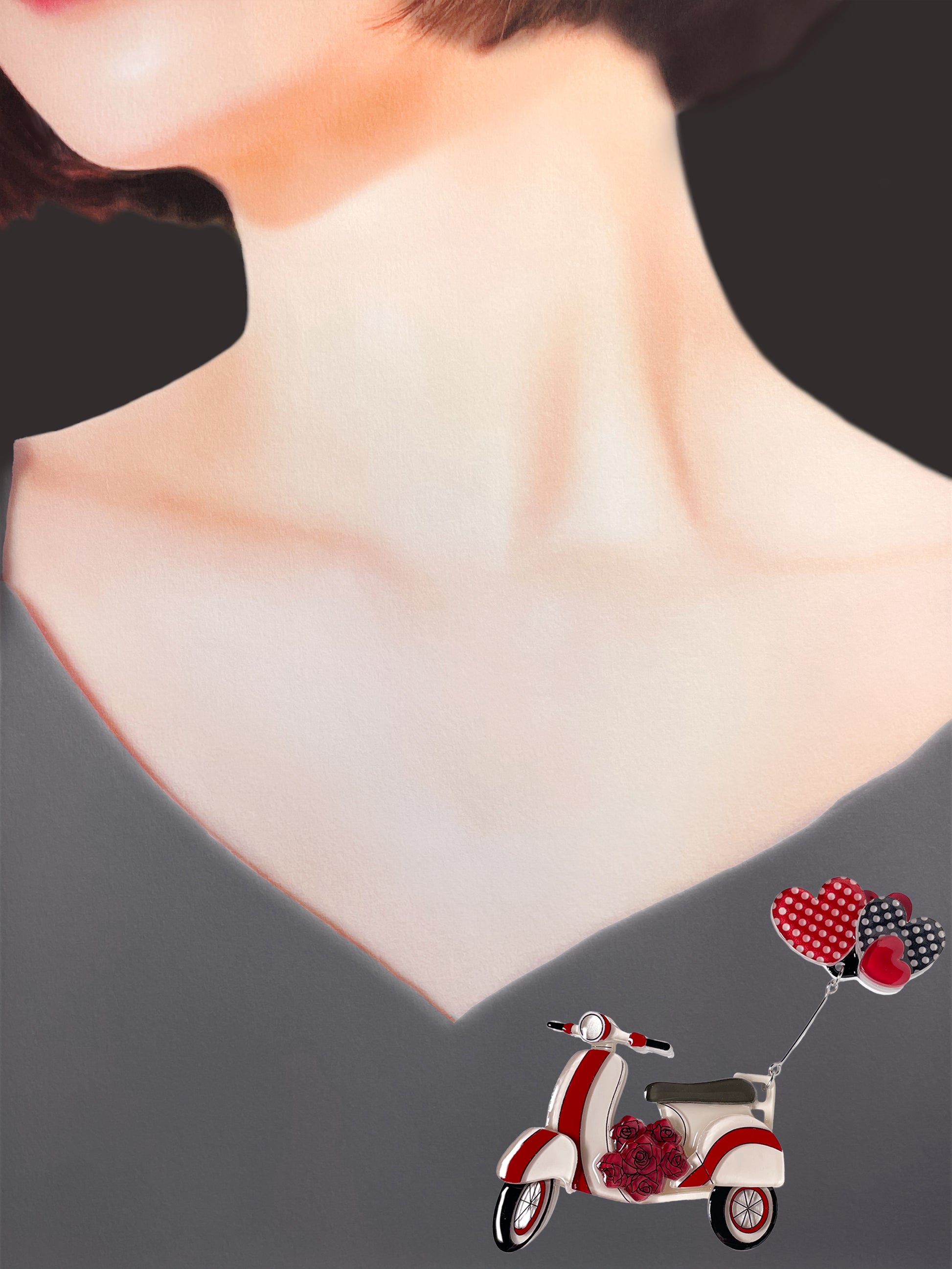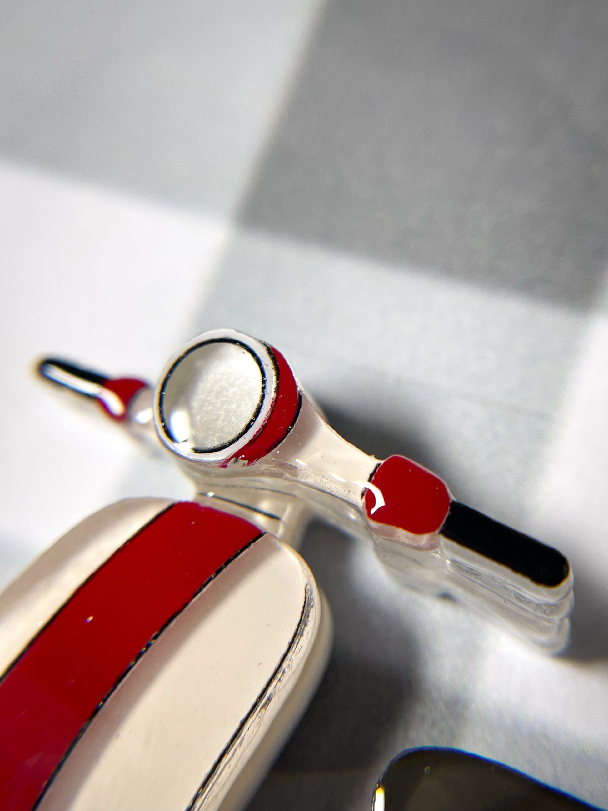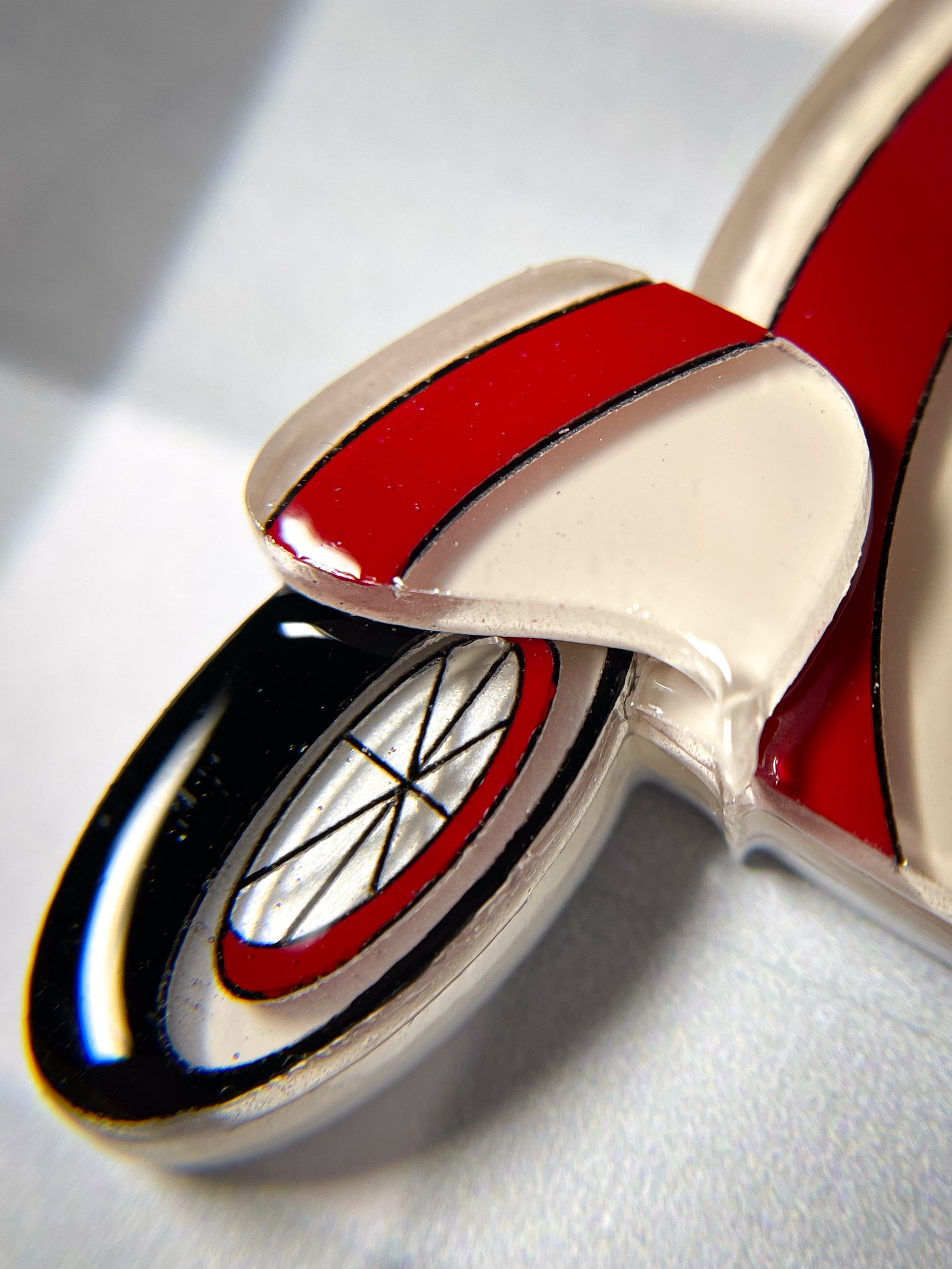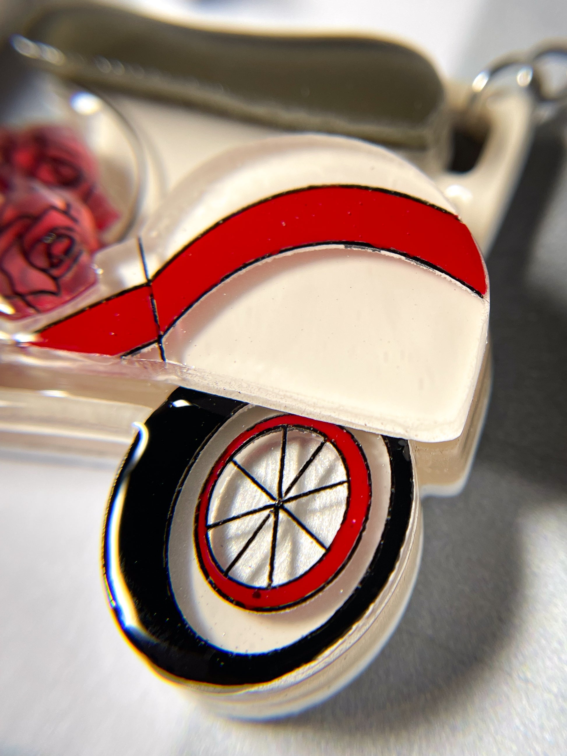 This brooch is made from 18 pieces of hand-painted acrylic plates and 2 pieces of OHP films, assembled and coated with acrylic UV/LED resin and backed with a silver brooch pin and a butterfly tack pin.