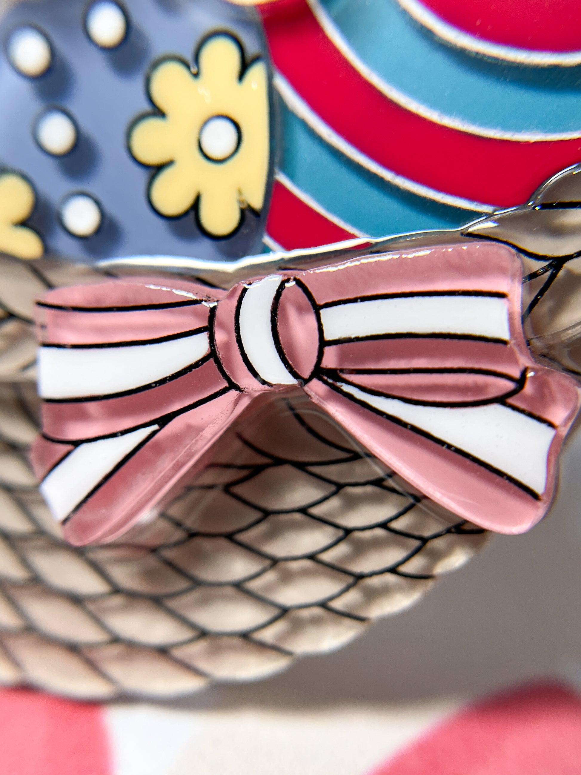 This brooch is made from 14 pieces of hand-painted acrylic plates, assembled and coated with acrylic UV/LED resin and backed with a silver brooch pin.