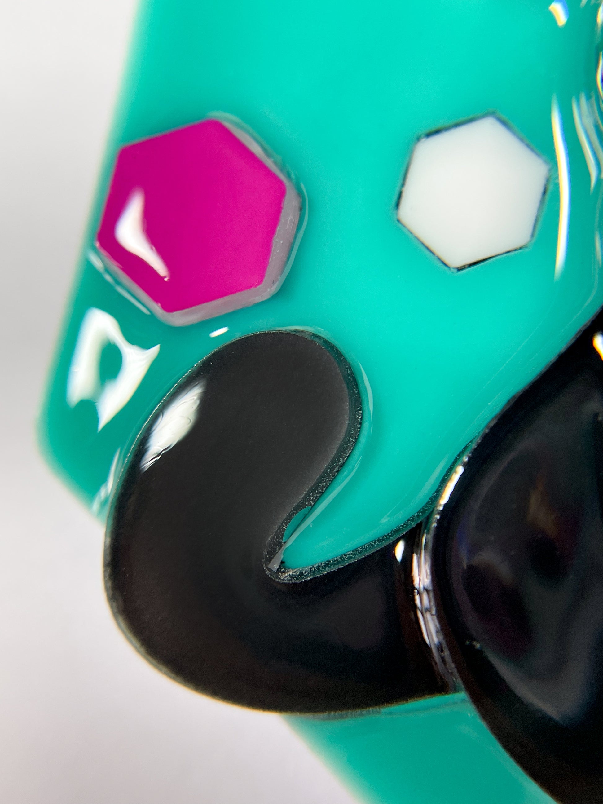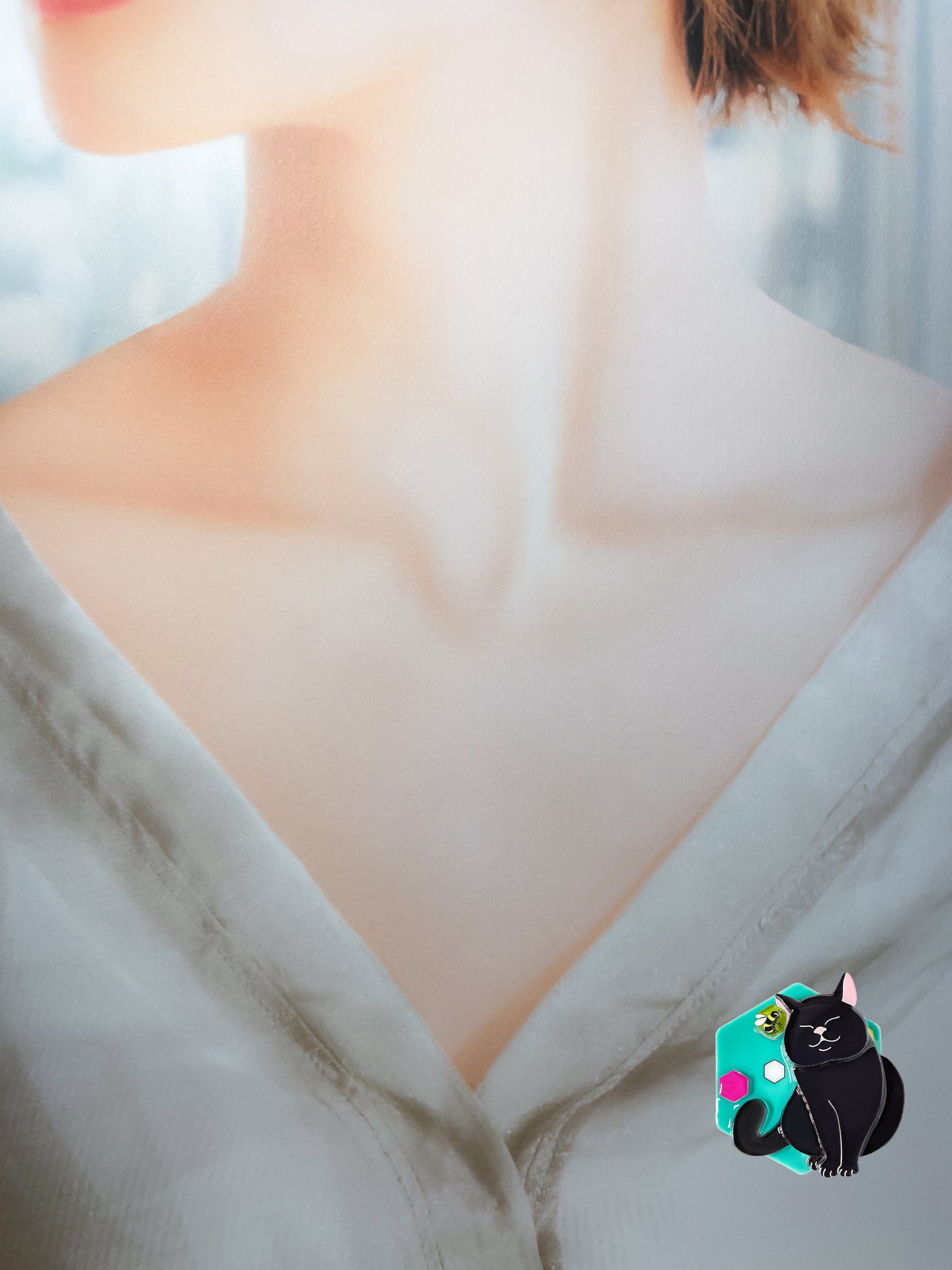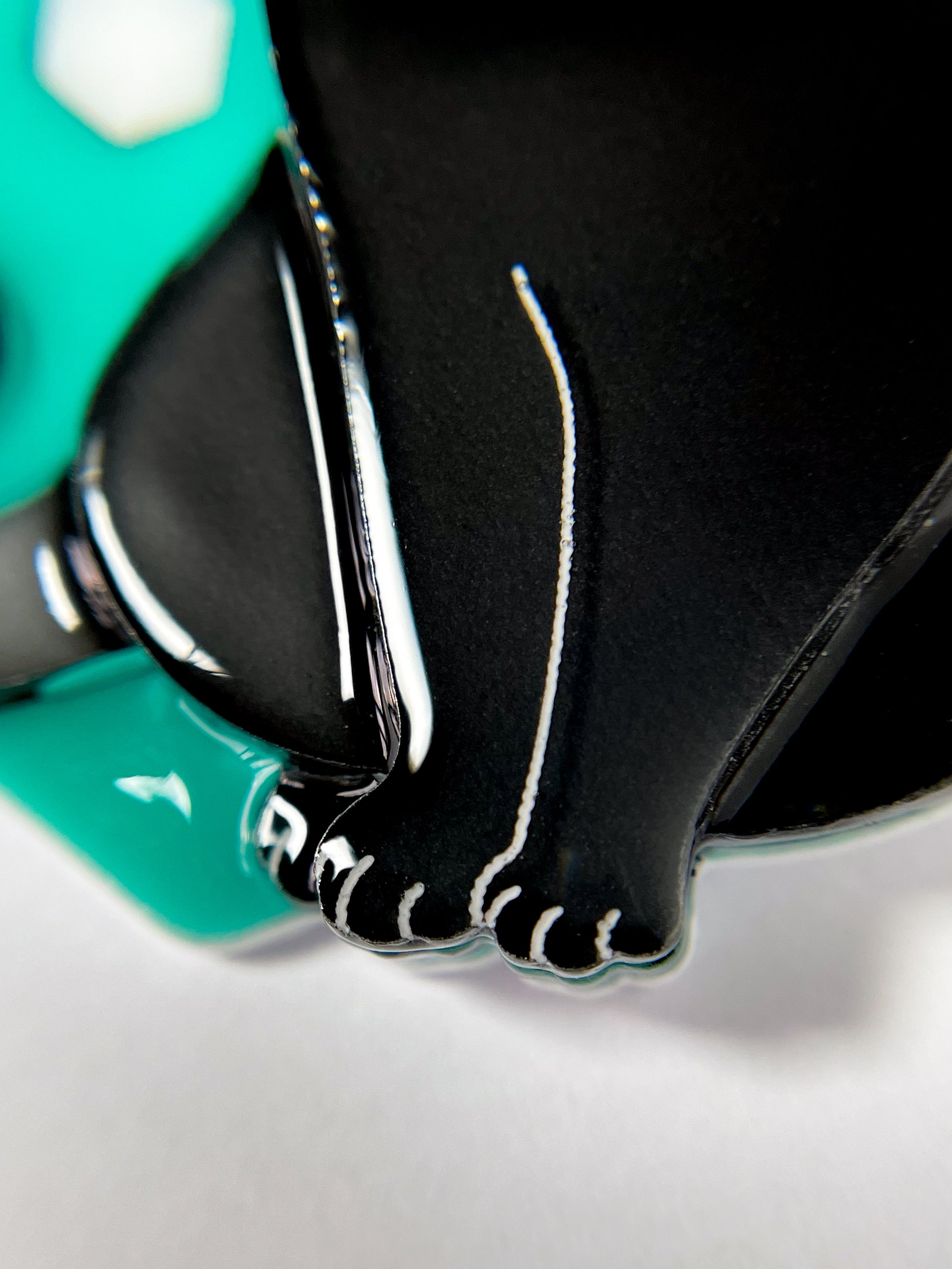 このブローチは、手描きで色を塗った 8ピースのアクリル板から出来ており、組み立て後は UV/LED アクリル樹脂でコーティングし、シルバーのブローチピンで仕上げられています。