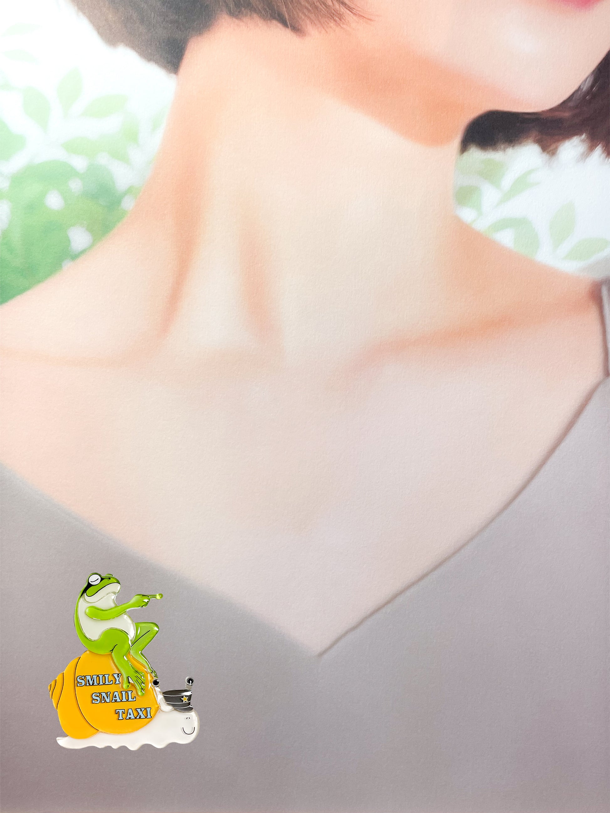スマイリーカタツムリタクシーに乗ったカエルのブローチ