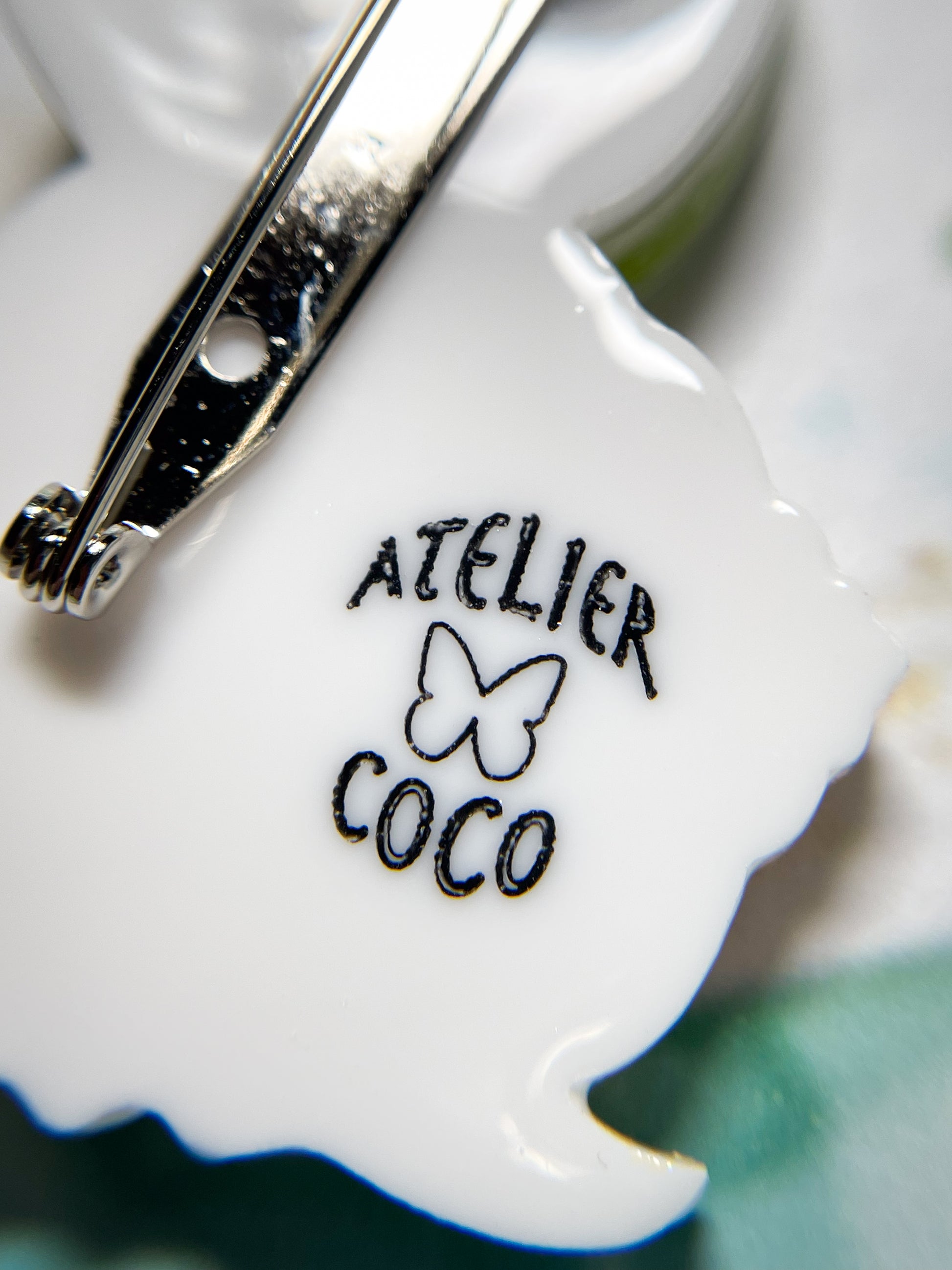 アクセサリーアーティストCocoによるオリジナルデザインで、ブローチの裏側には「ATELIER COCO」のロゴが入っています。