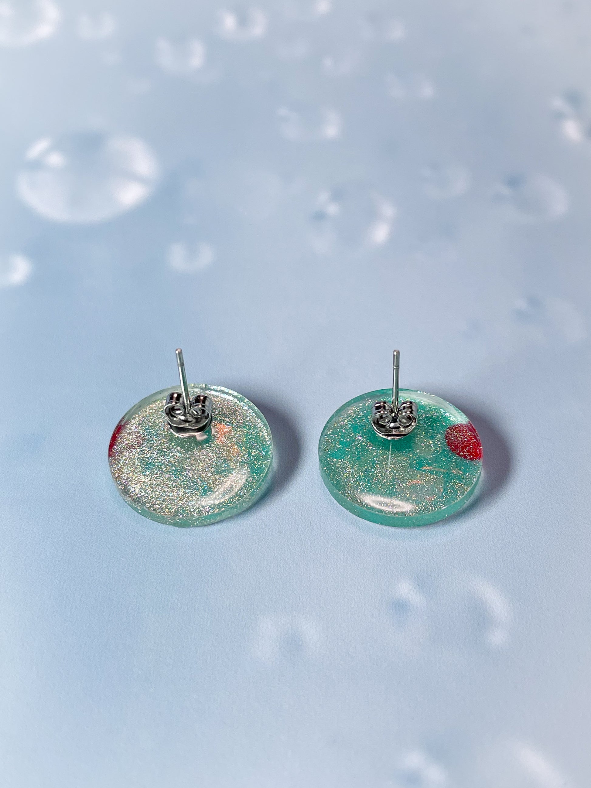 このピアスは、2 ピースのアクリル板を手塗りで色を塗り、組み立て後は UV/LED アクリル樹脂でコーティングし、シルバーのサージカルステンレススタッドで仕上げられています。
