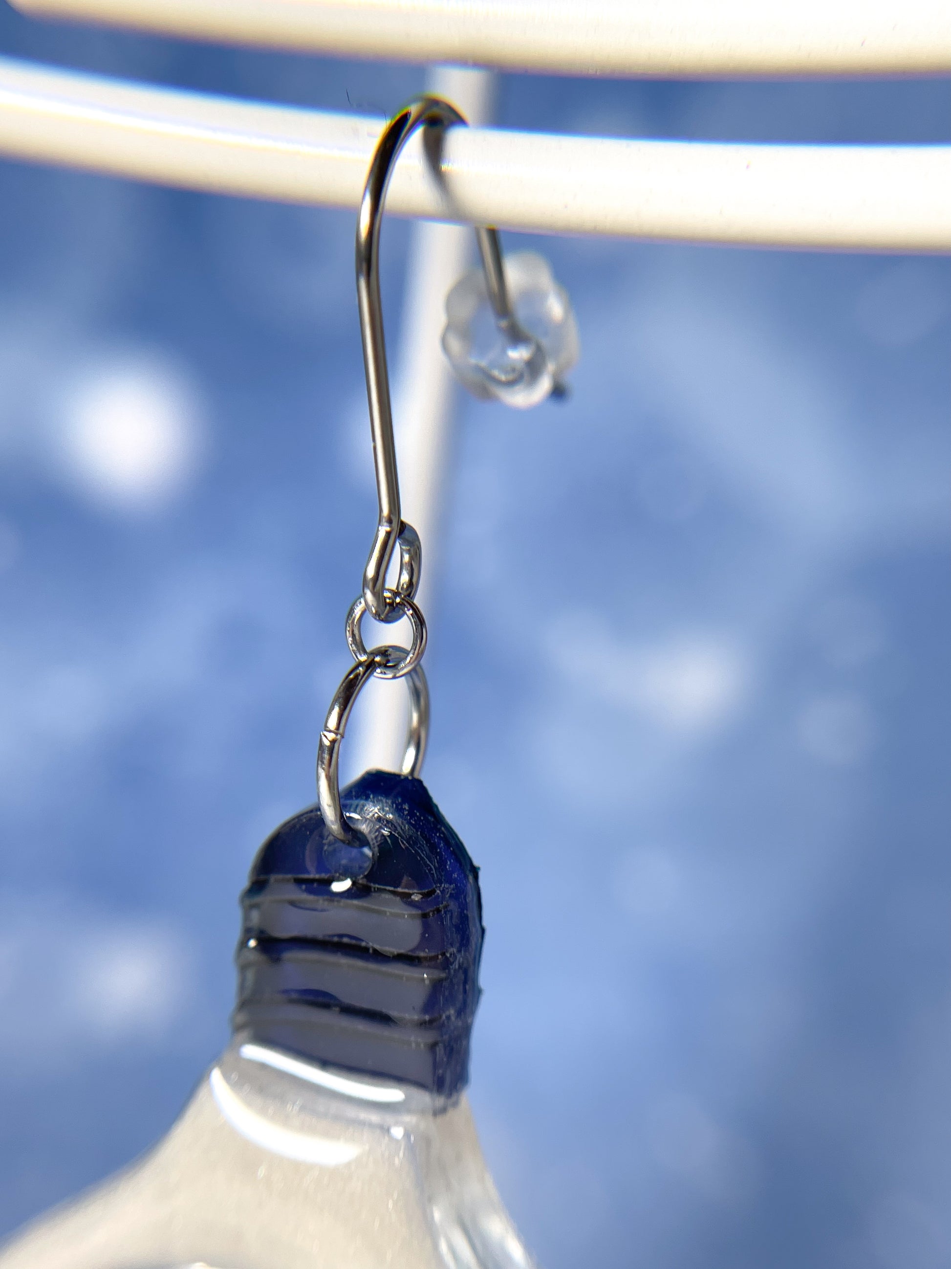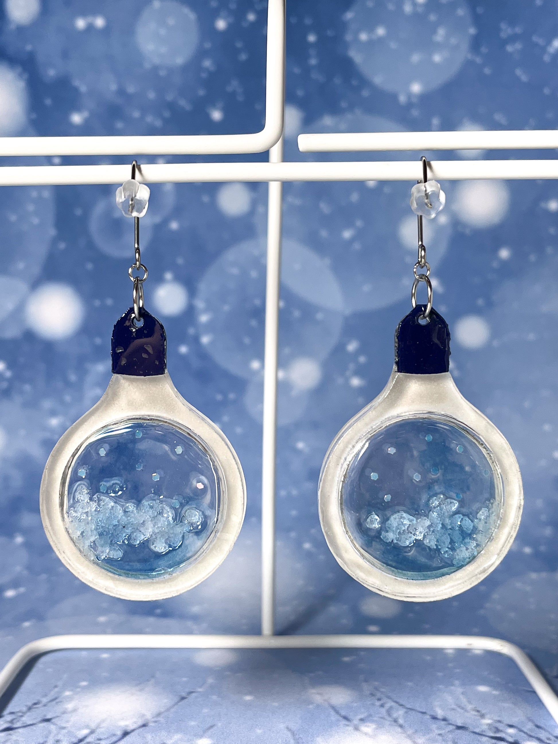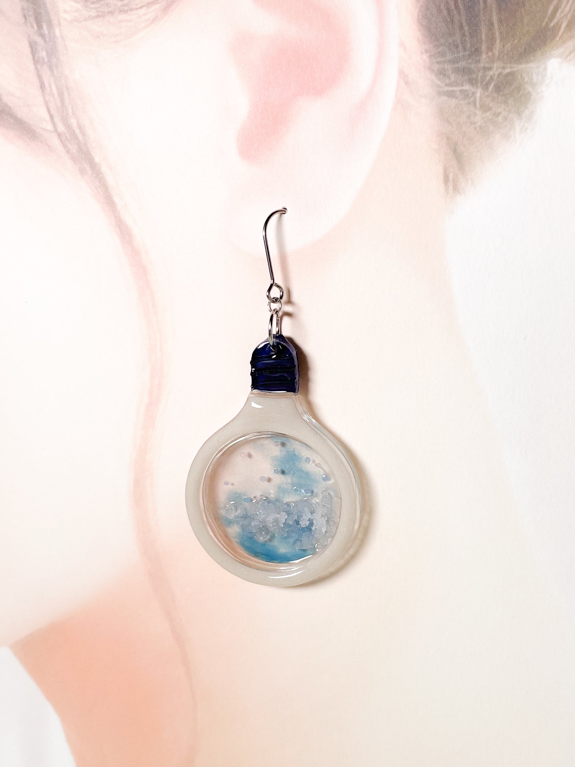 このピアスは、手描きで色を塗った 6ピースのアクリル板、4枚の透明シート、蓄光ホログラム、マジックスノーパウダーから出来ており、組み立て後は UV/LED アクリル樹脂でコーティングし、サージカルステンレスのシルバーフックで仕上げられています。