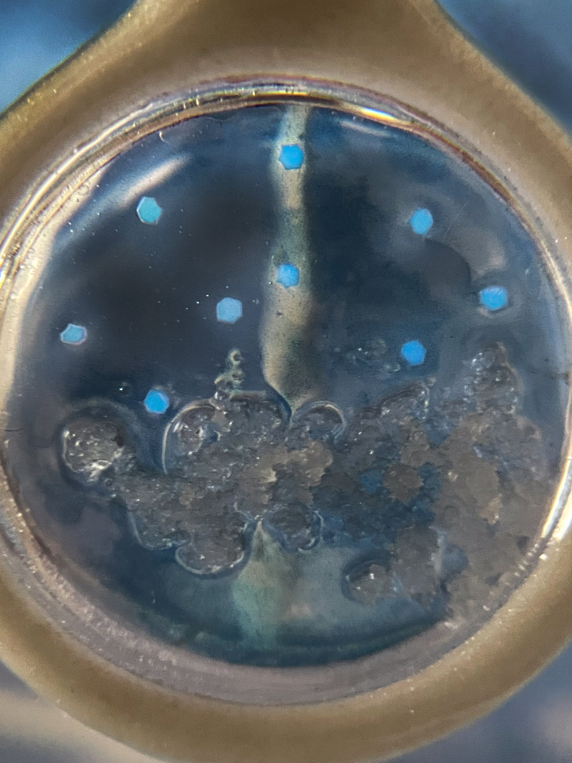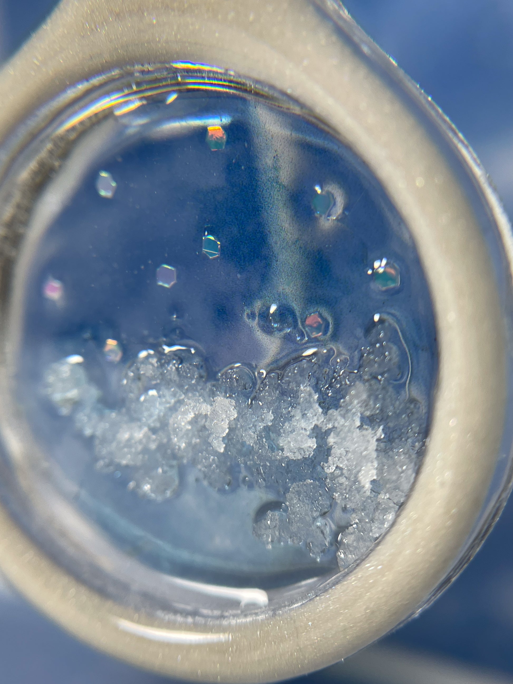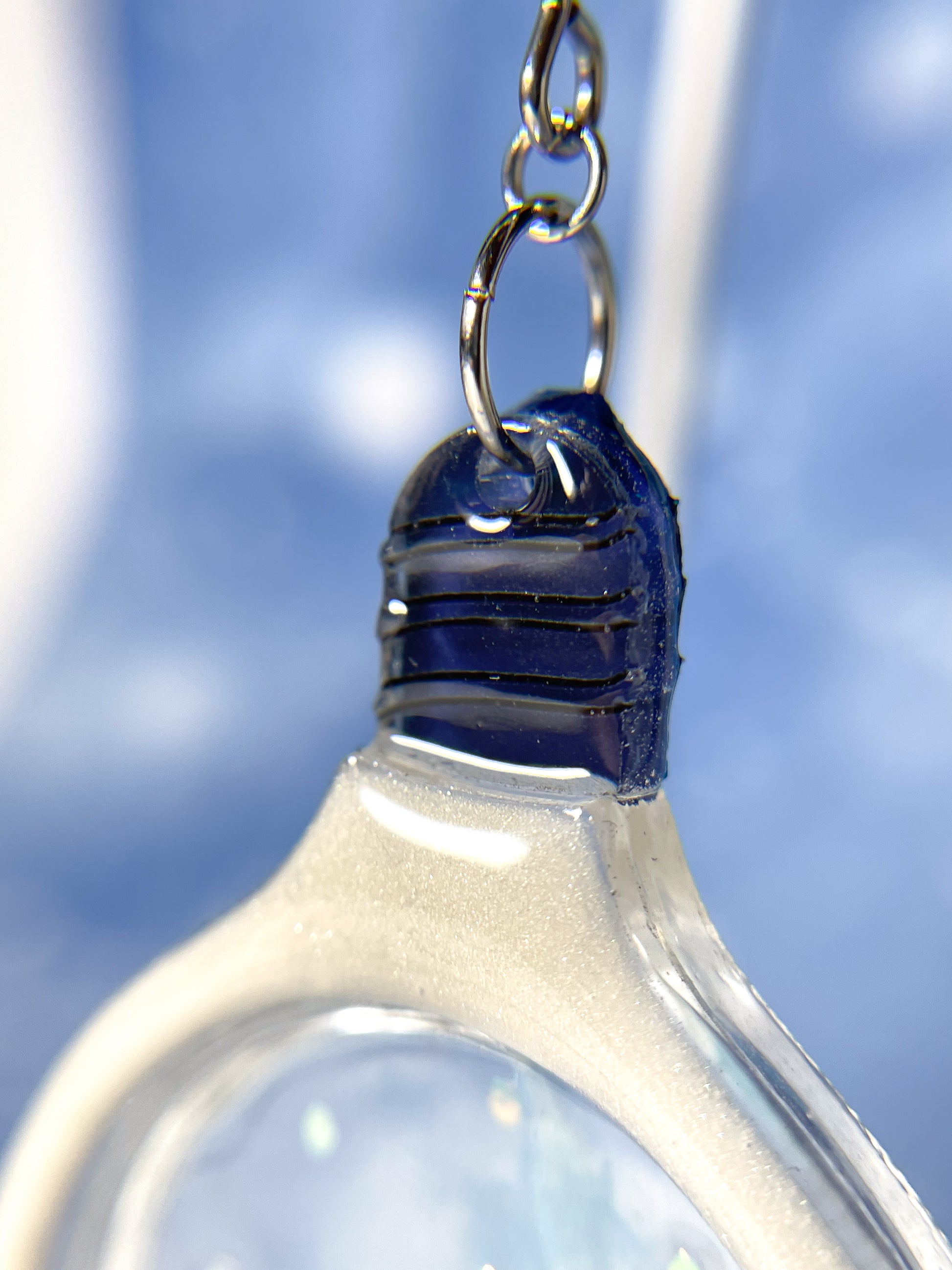 このピアスは、手描きで色を塗った 6ピースのアクリル板、4枚の透明シート、蓄光ホログラム、マジックスノーパウダーから出来ており、組み立て後は UV/LED アクリル樹脂でコーティングし、サージカルステンレスのシルバーフックで仕上げられています。