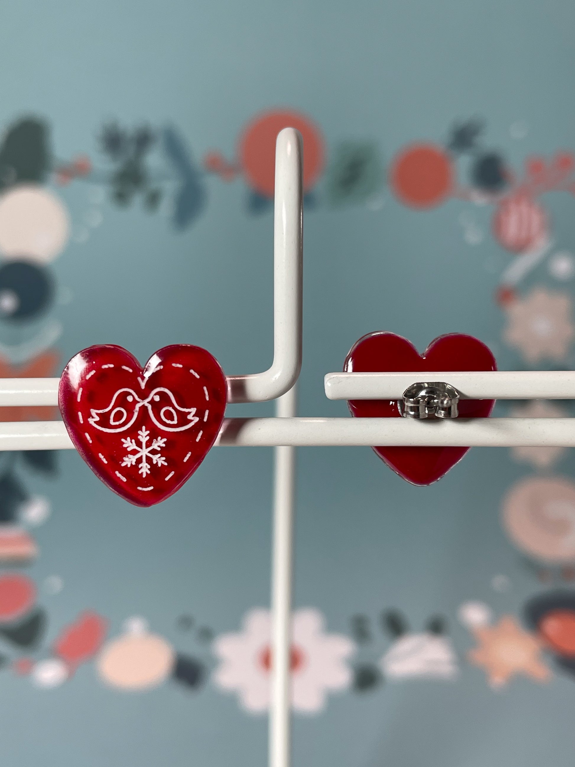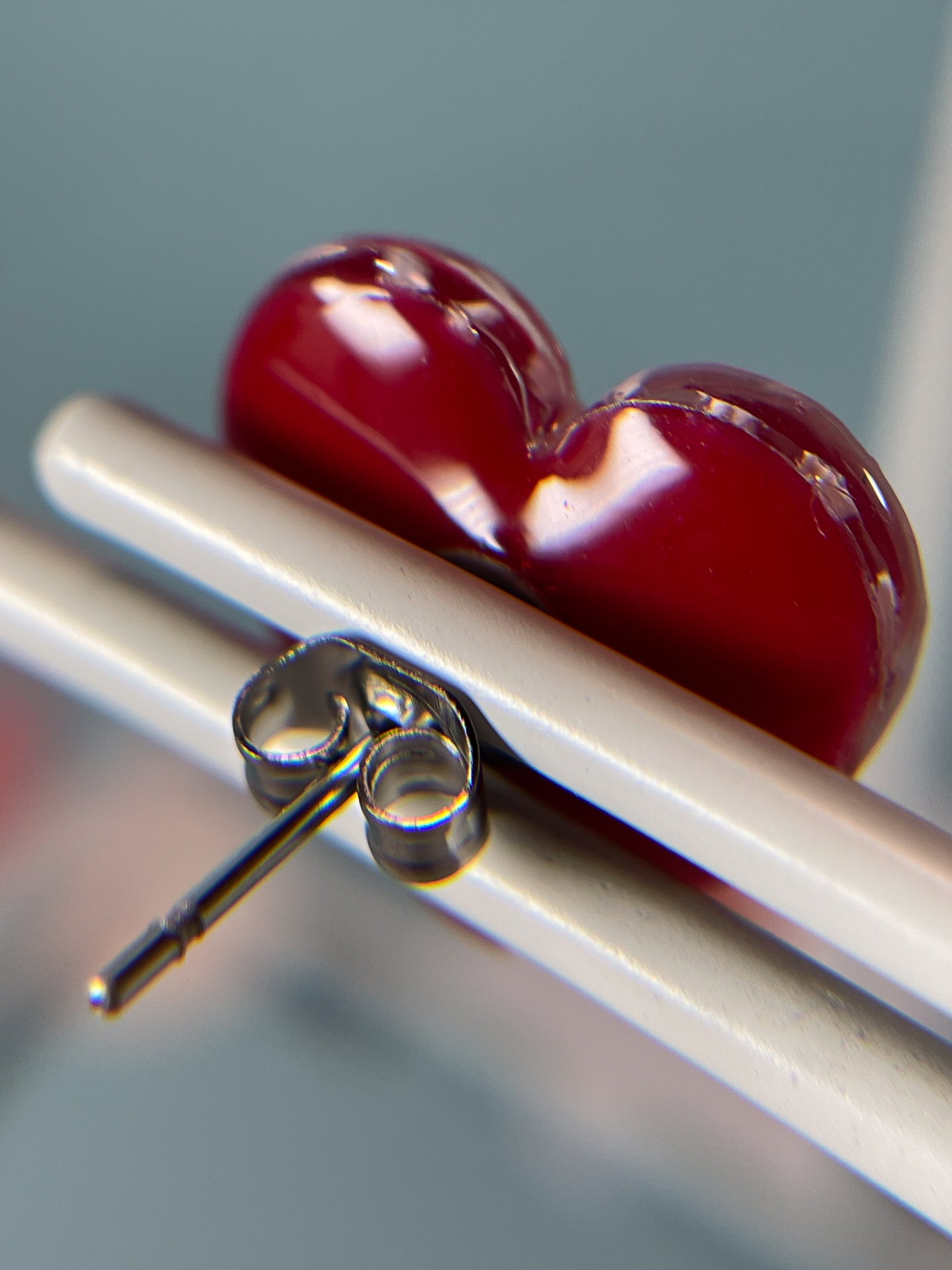 このピアスは、手描きで色を塗った 2ピースのアクリル板から出来ており、組み立て後は UV/LED アクリル樹脂でコーティングし、サージカルステンレスのシルバースタッドで仕上げられています。