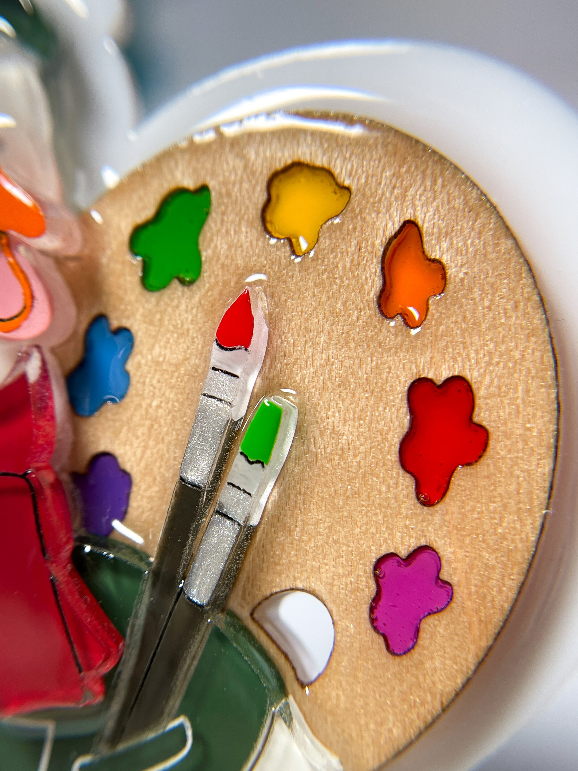 This brooch is made from 12 pieces of hand-painted acrylic plates, assembled and coated with acrylic UV/LED resin and backed with a silver brooch pin.