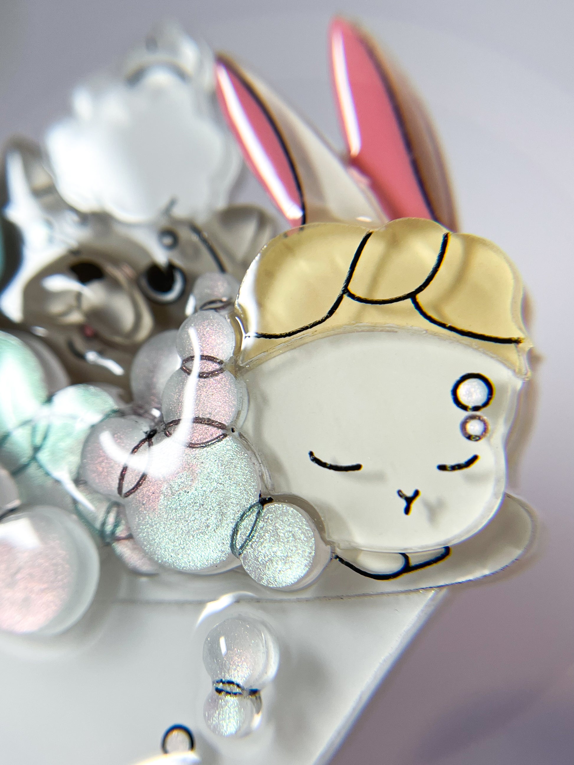 This brooch is made from 24 pieces of hand-painted acrylic plates, assembled and coated with acrylic UV/LED resin and backed with a silver brooch pin.