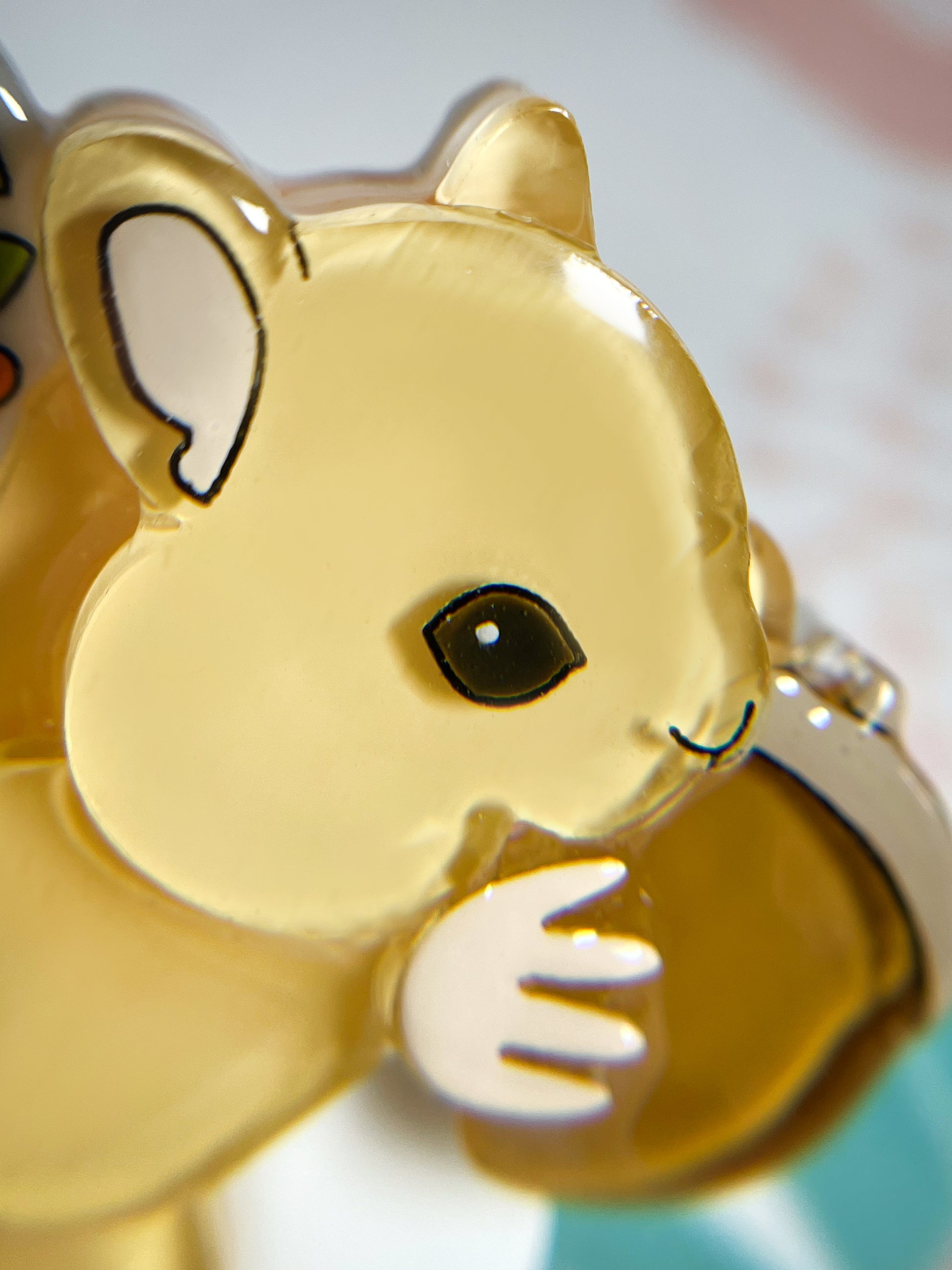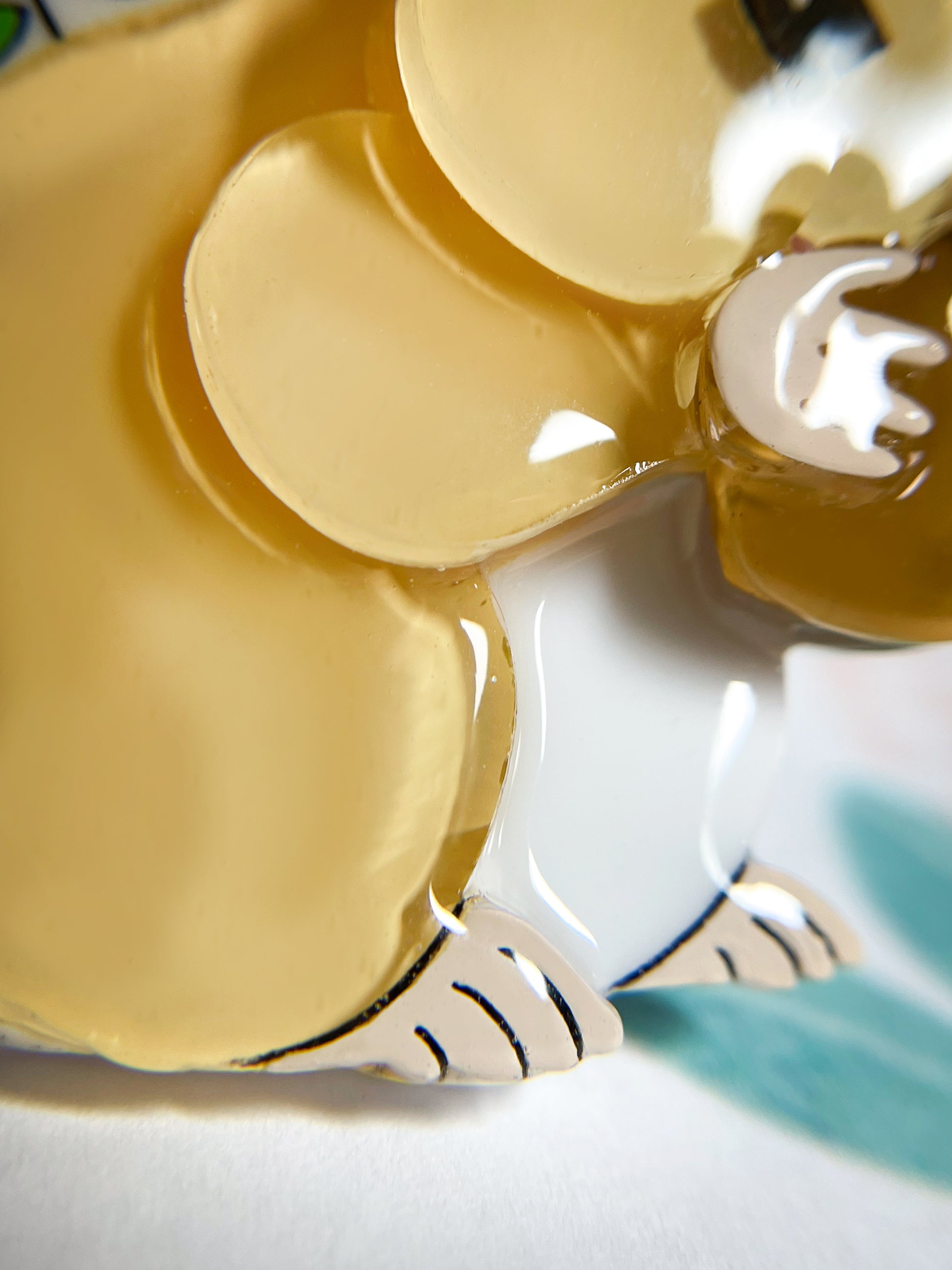 This brooch is made from 6 pieces of hand-painted acrylic plates, assembled and coated with acrylic UV/LED resin and backed with a silver brooch pin.