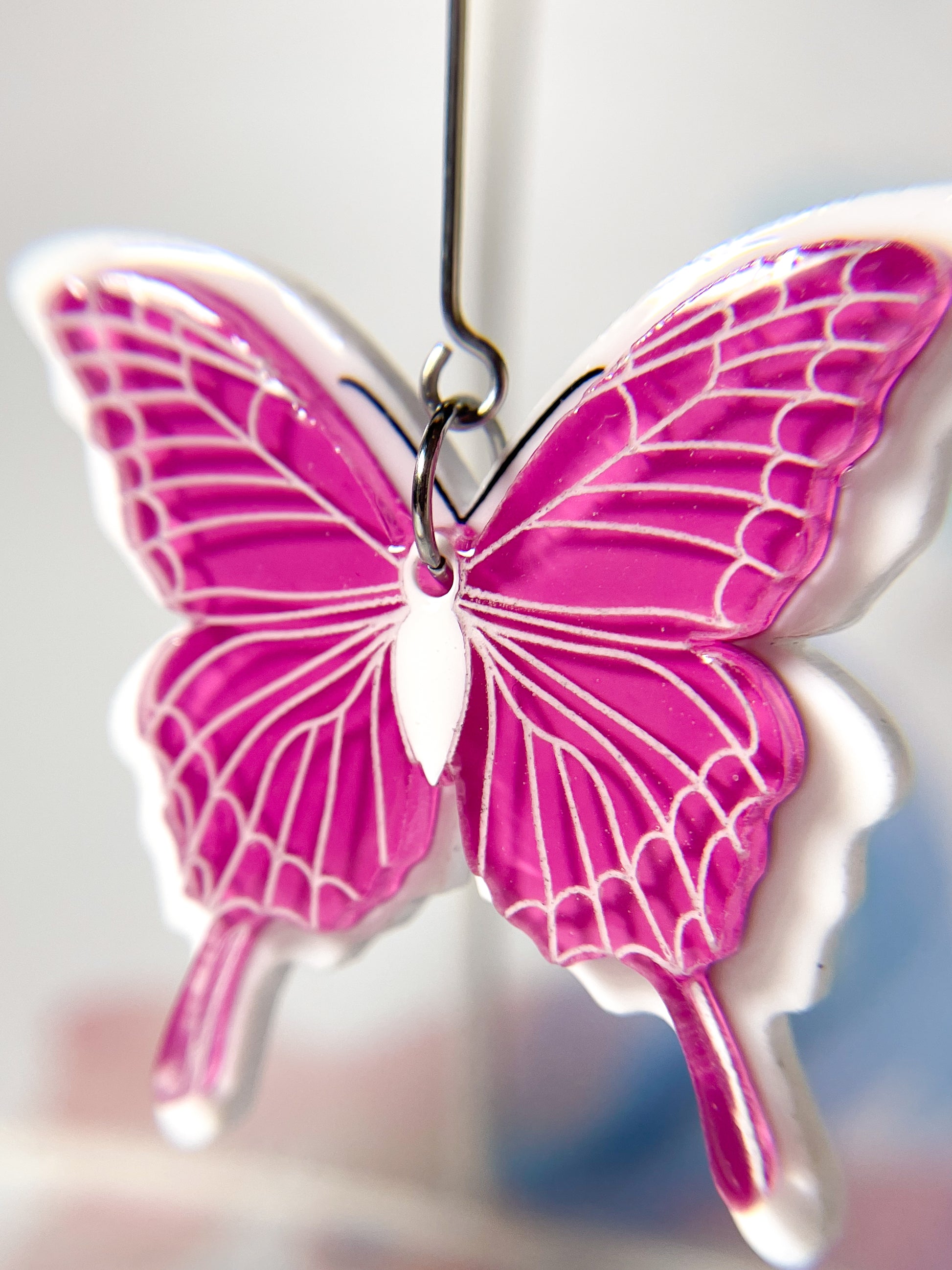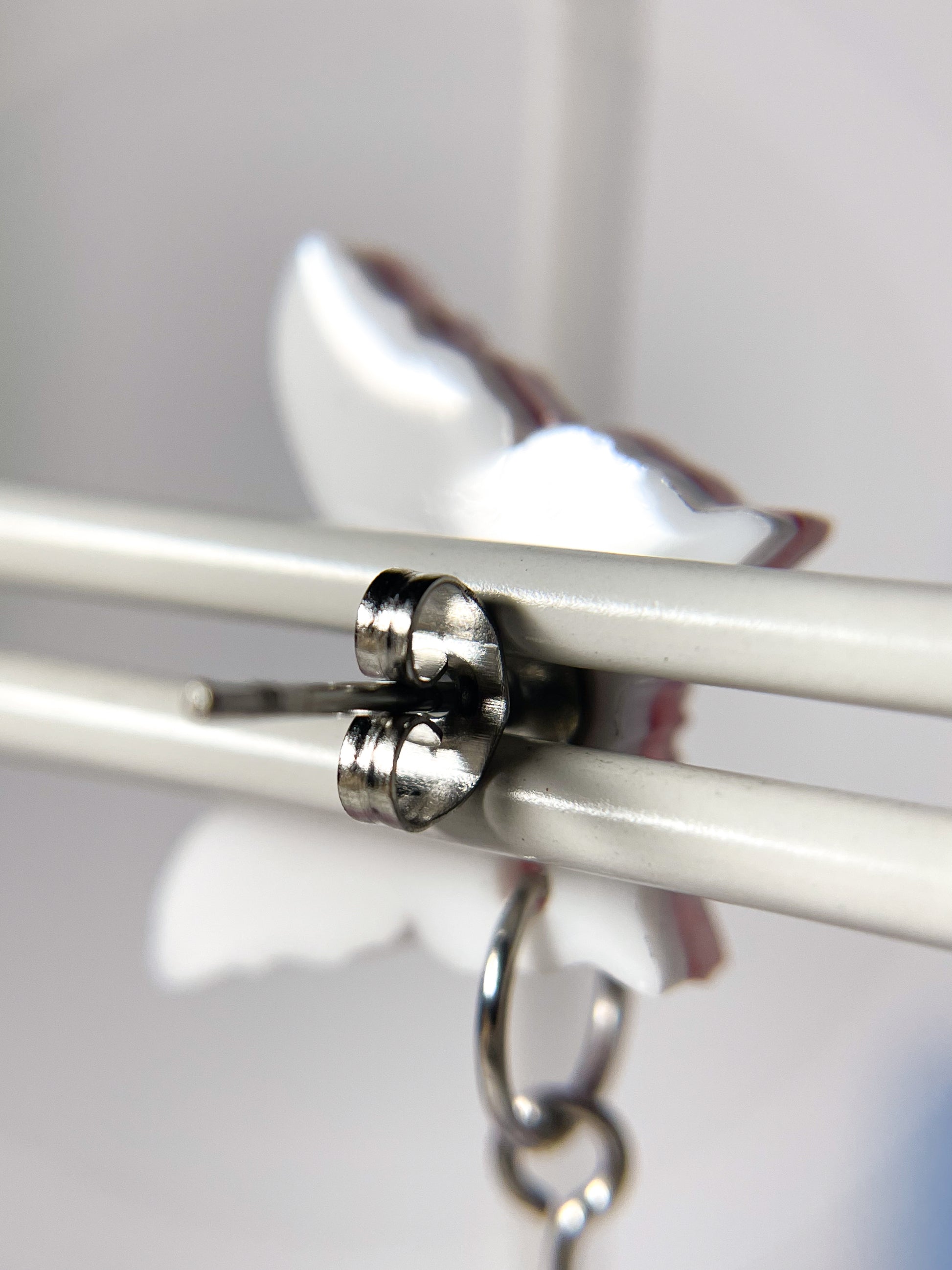 These earrings are made from 8 pieces of acrylic plates, hand-painted and coated with acrylic UV/LED resin and finished with silver-plated surgical stainless steel studs.