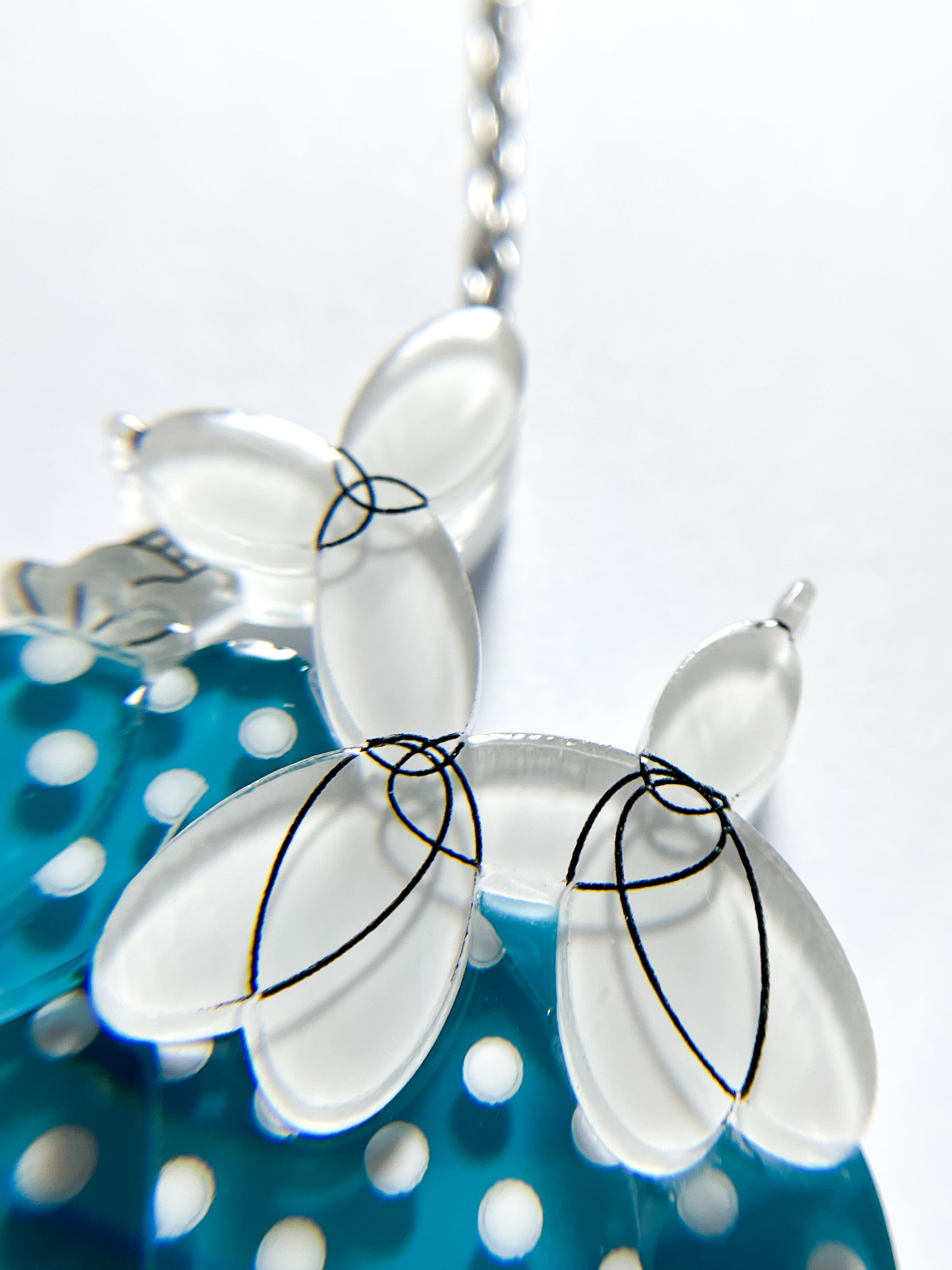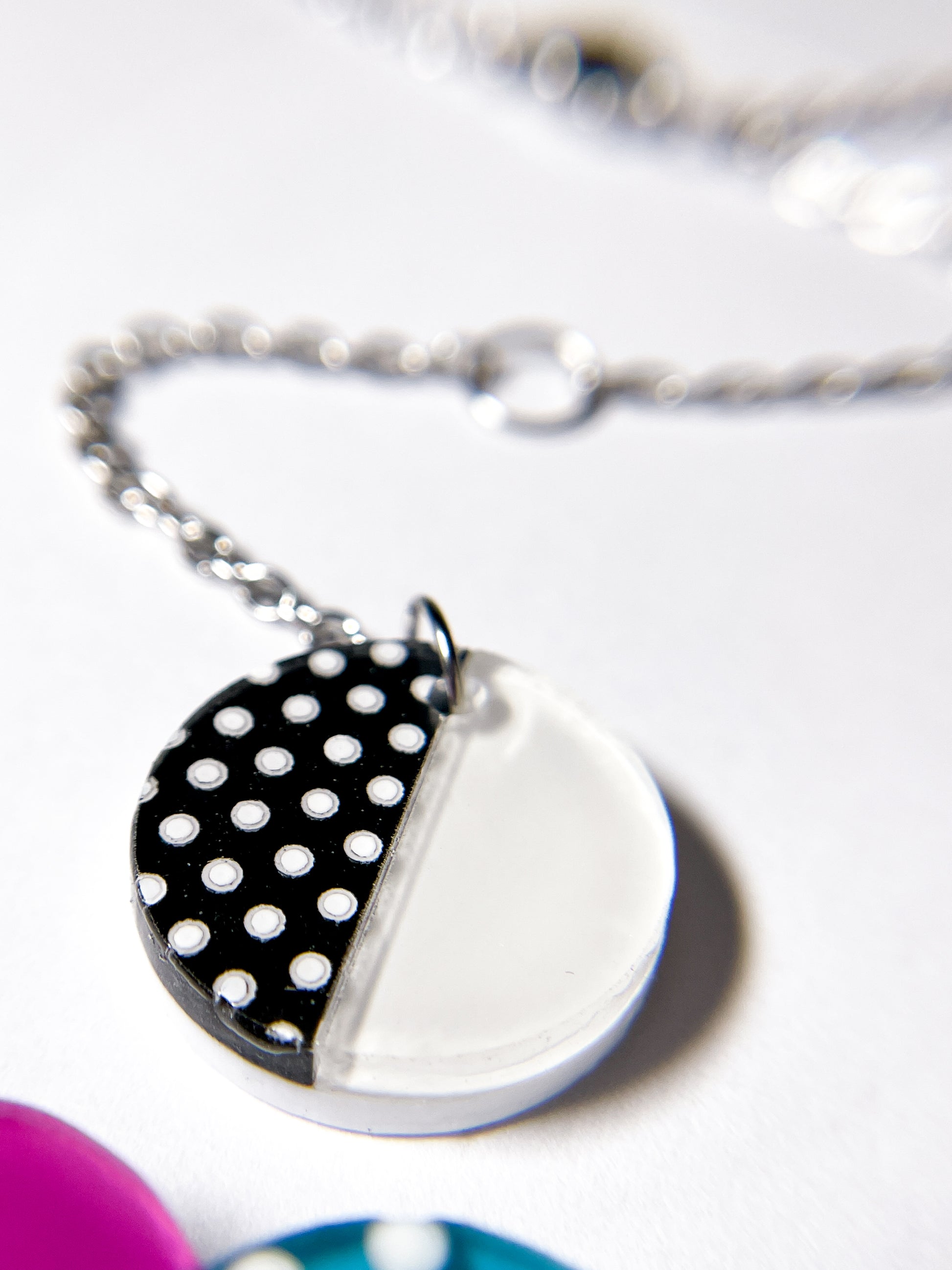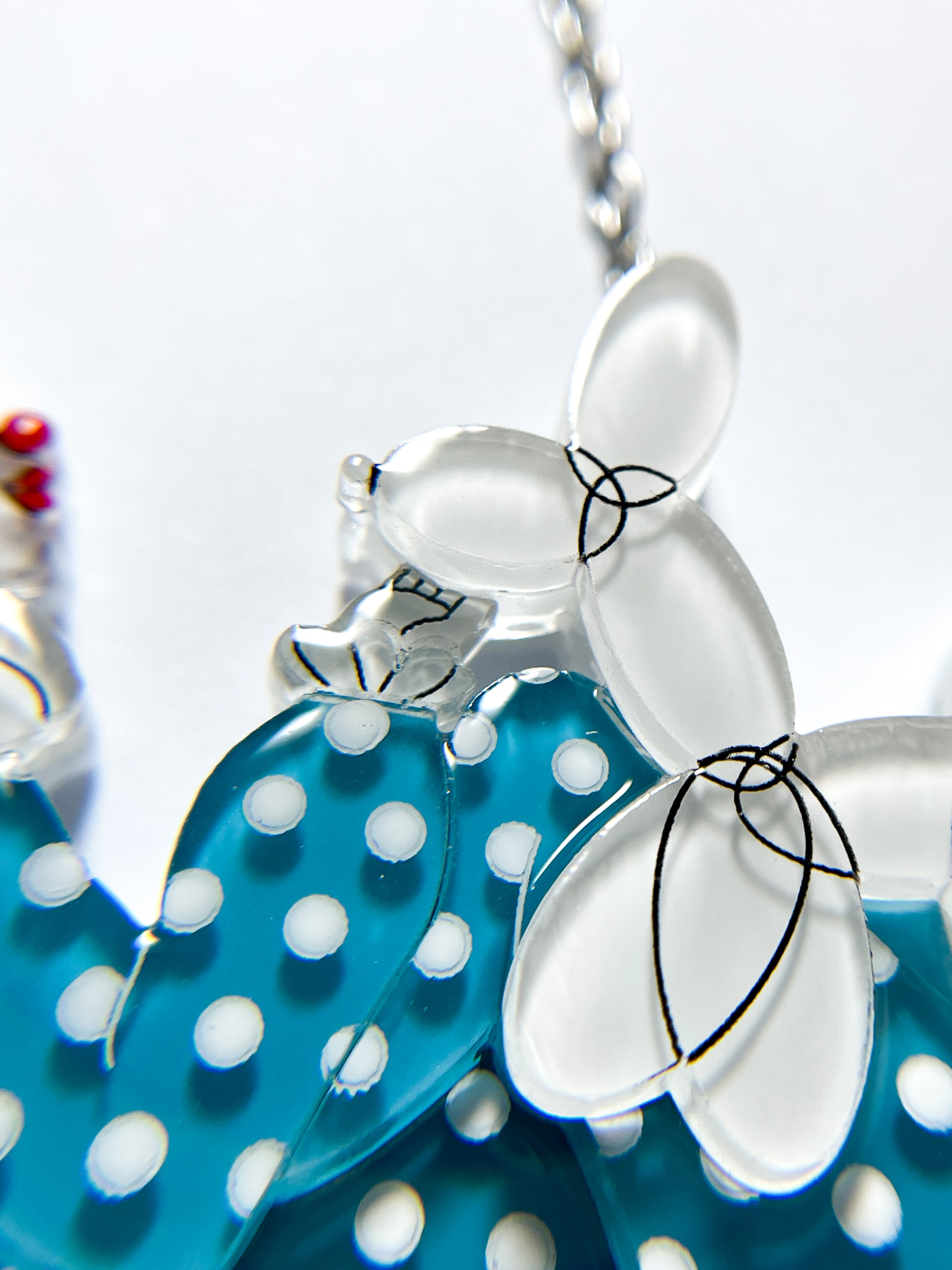 This necklace is made from 24 pieces of hand-painted acrylic plates, assembled and coated with acrylic UV/LED resin and finished with a silver surgical stainless steel chain with an extender.
