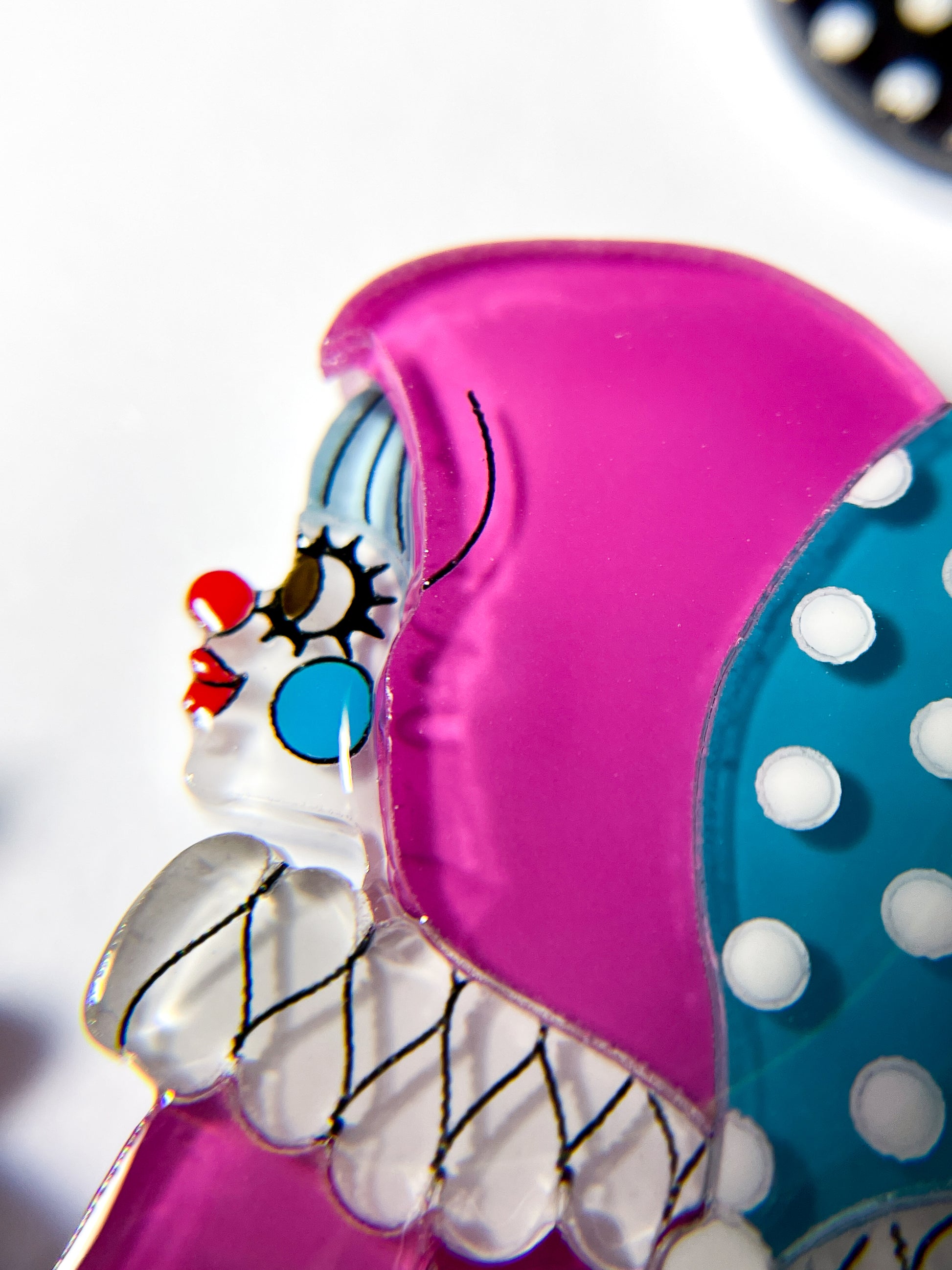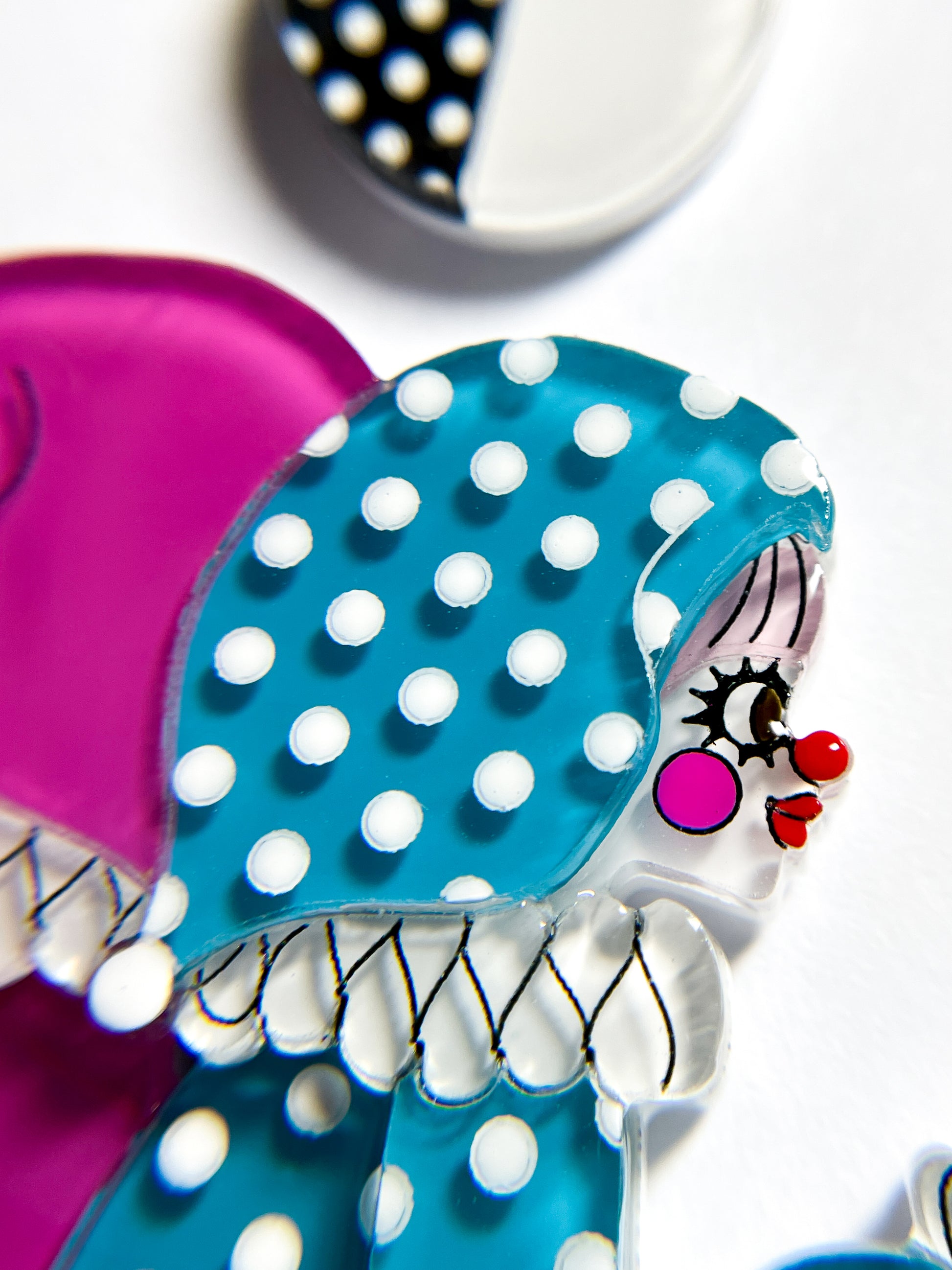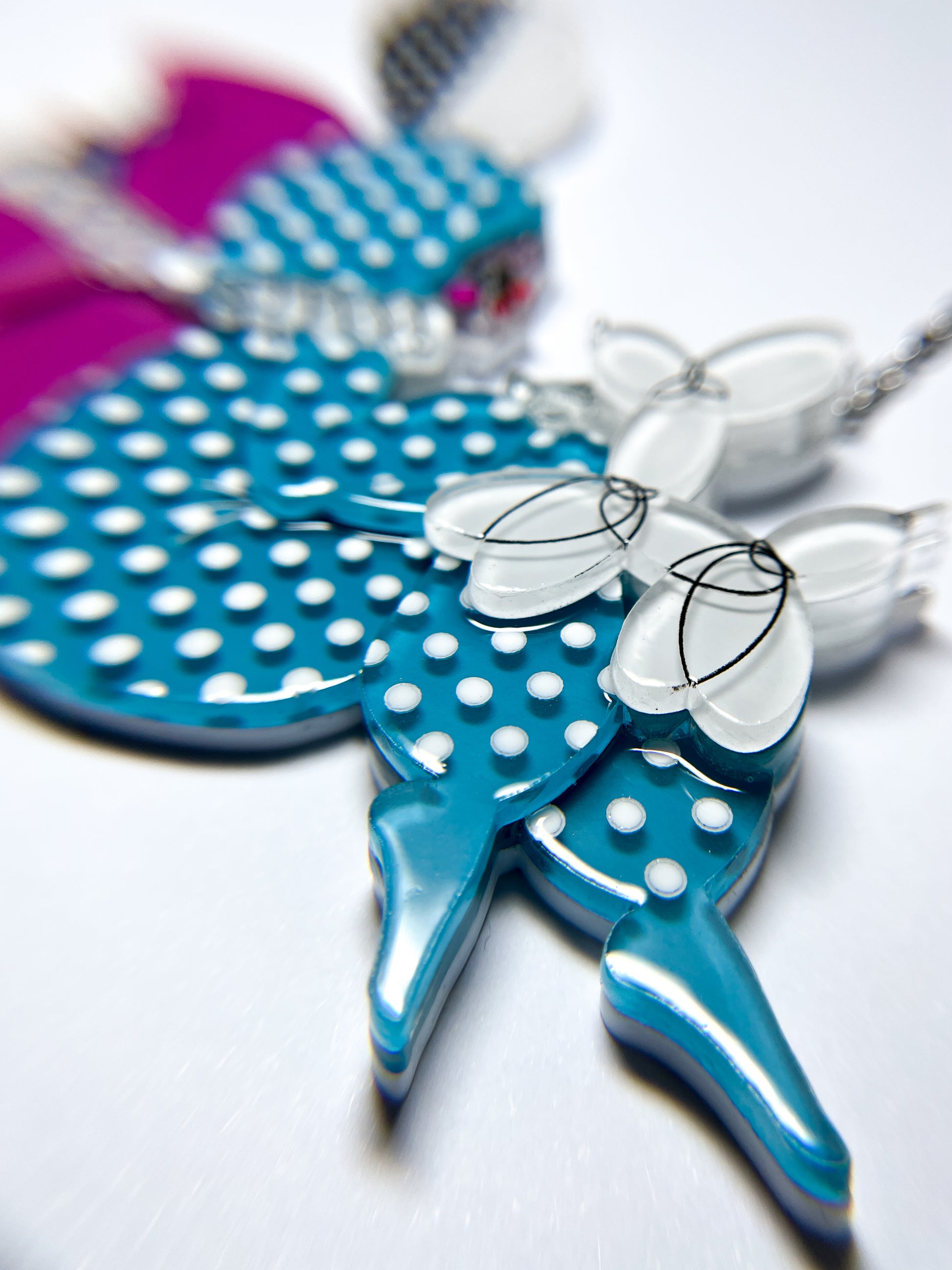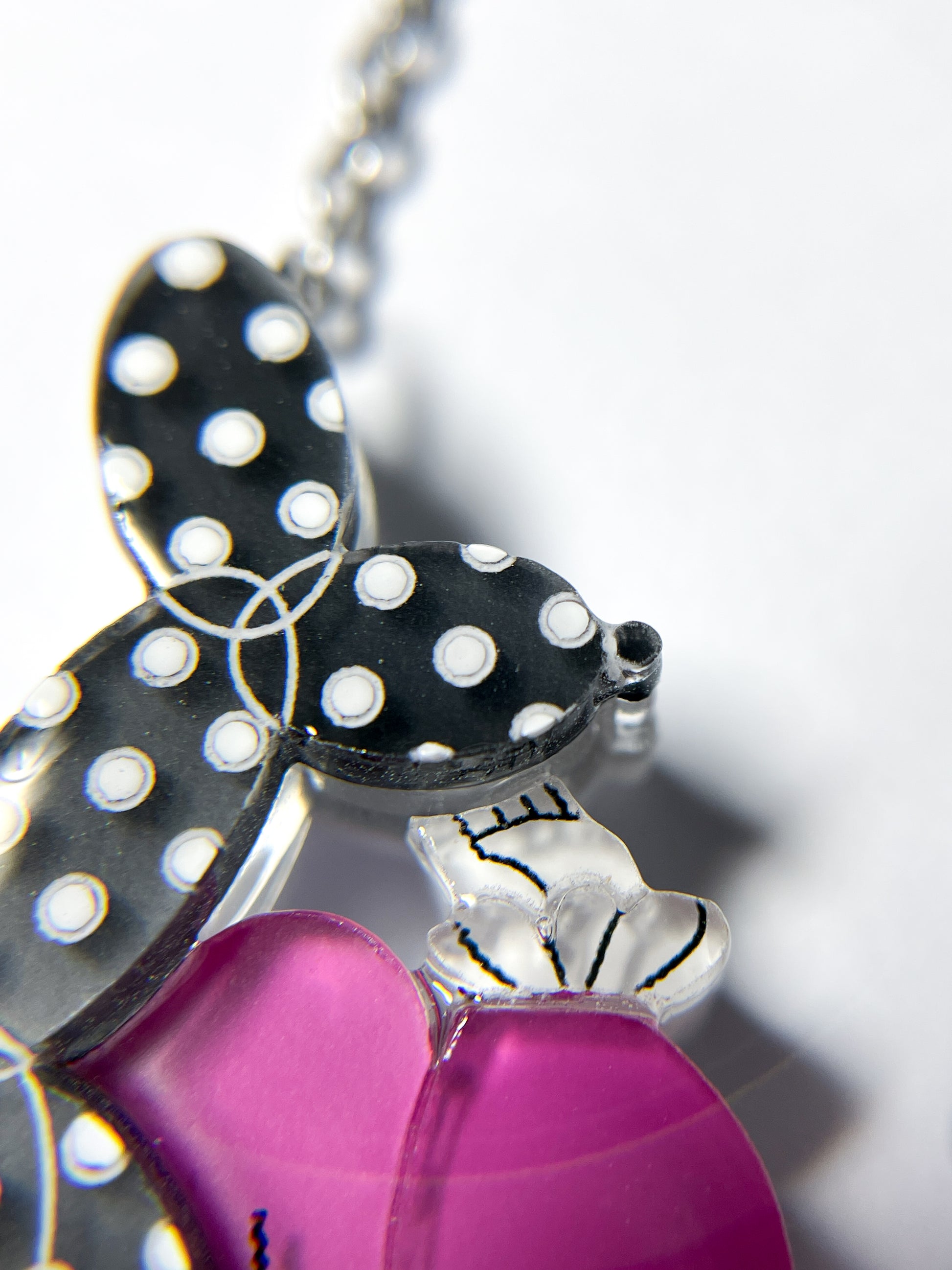 This necklace is made from 24 pieces of hand-painted acrylic plates, assembled and coated with acrylic UV/LED resin and finished with a silver surgical stainless steel chain with an extender.