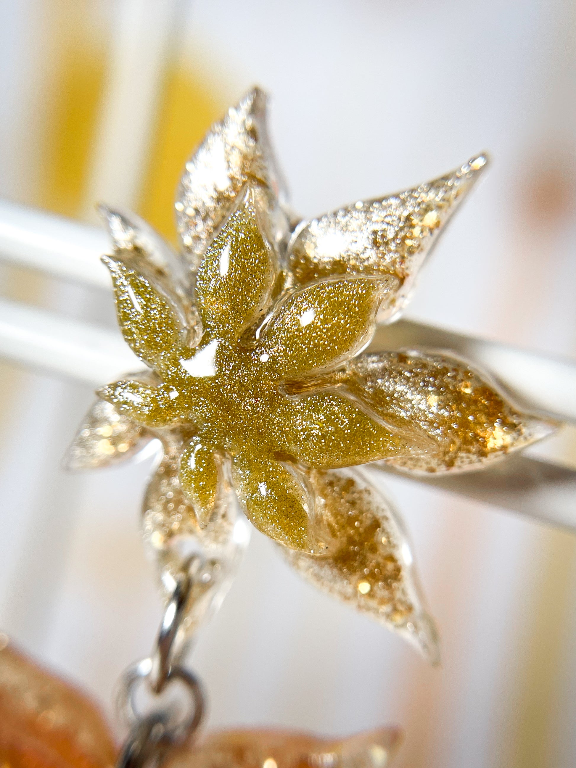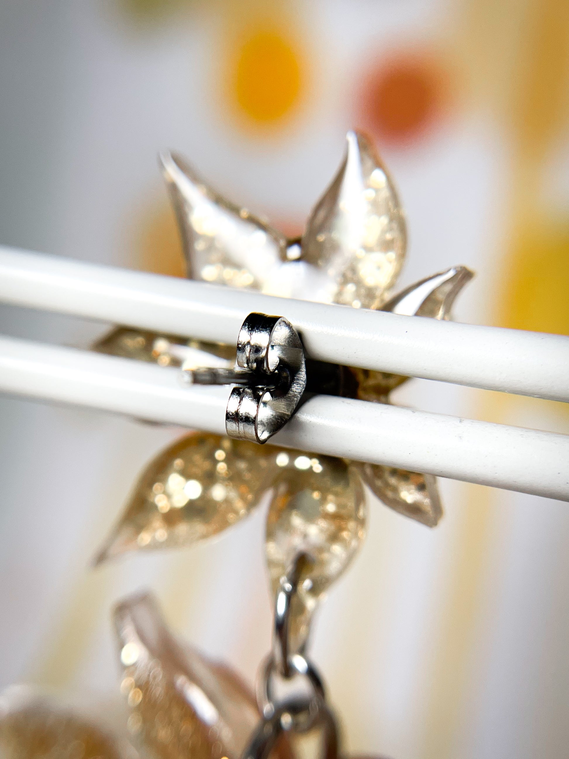 These earrings are made from 8 pieces of acrylic plates, hand-painted and coated with acrylic UV/LED resin and finished with silver-plated surgical stainless steel studs.