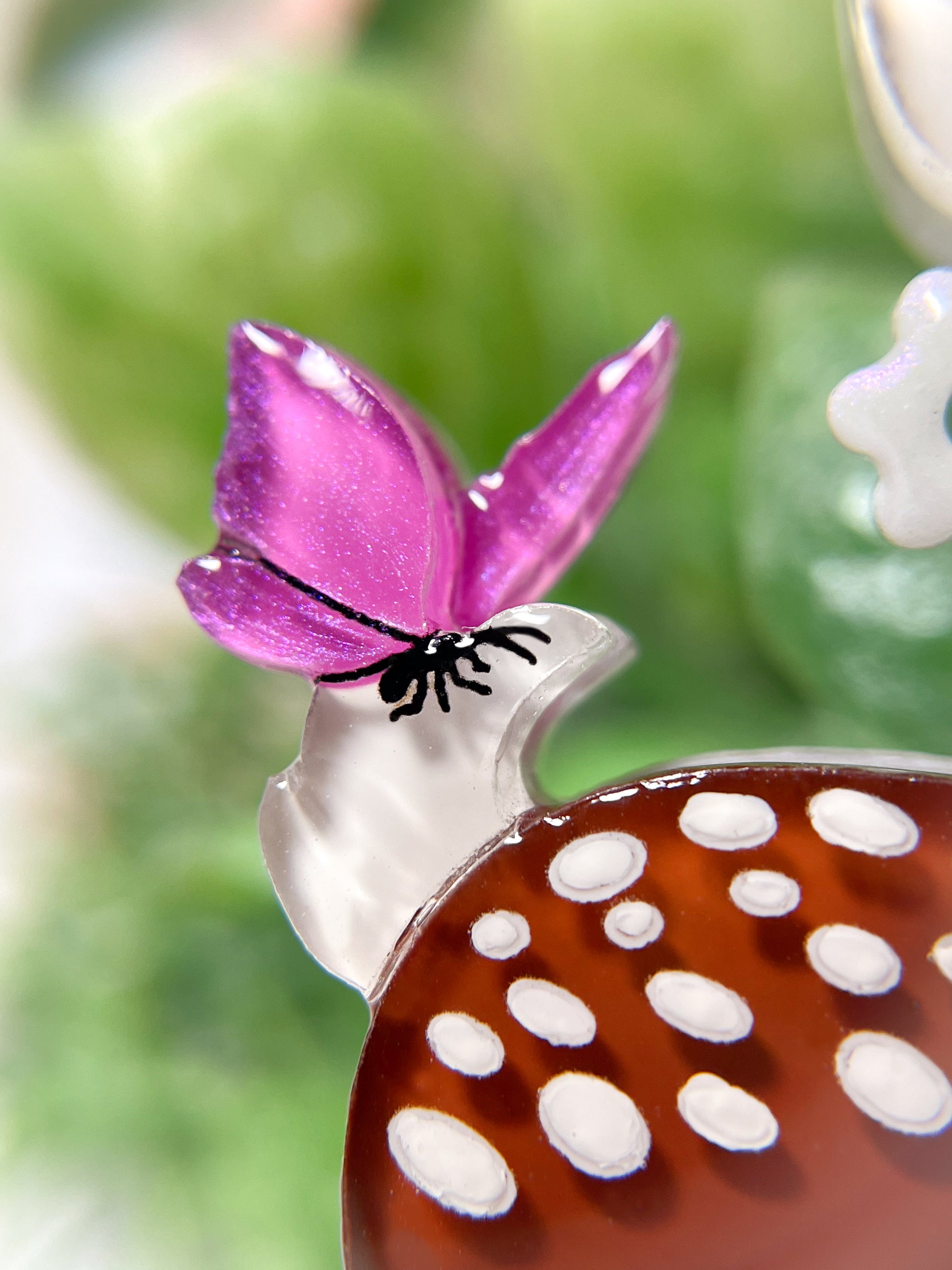 This brooch is made from 11 pieces of hand-painted acrylic plates, assembled and coated with acrylic UV/LED resin and backed with a silver brooch pin.
