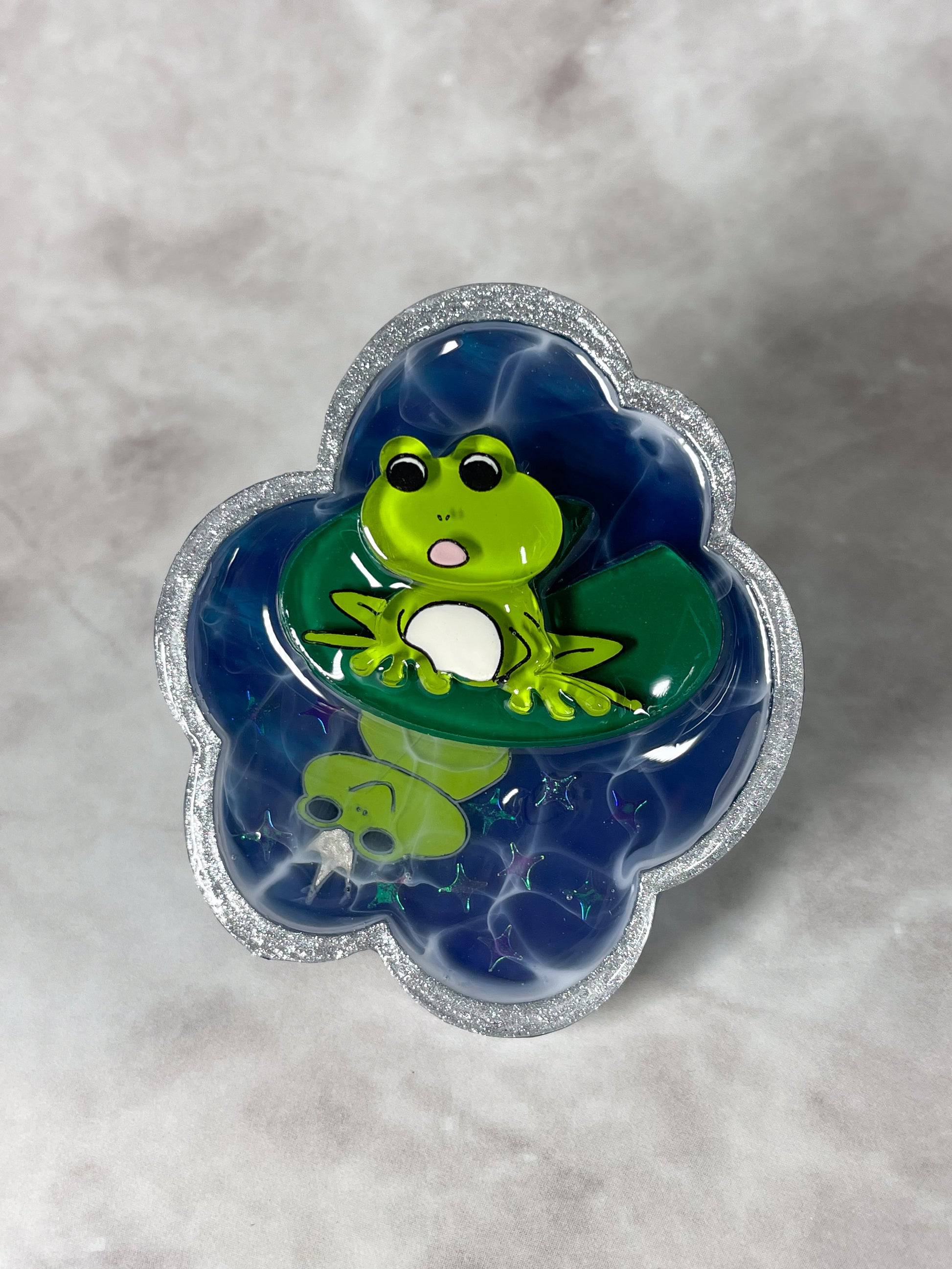 This brooch is made from 5 pieces of hand-painted acrylic plates and shiny glitters, assembled and coated with acrylic UV/LED resin and backed with a silver brooch pin.