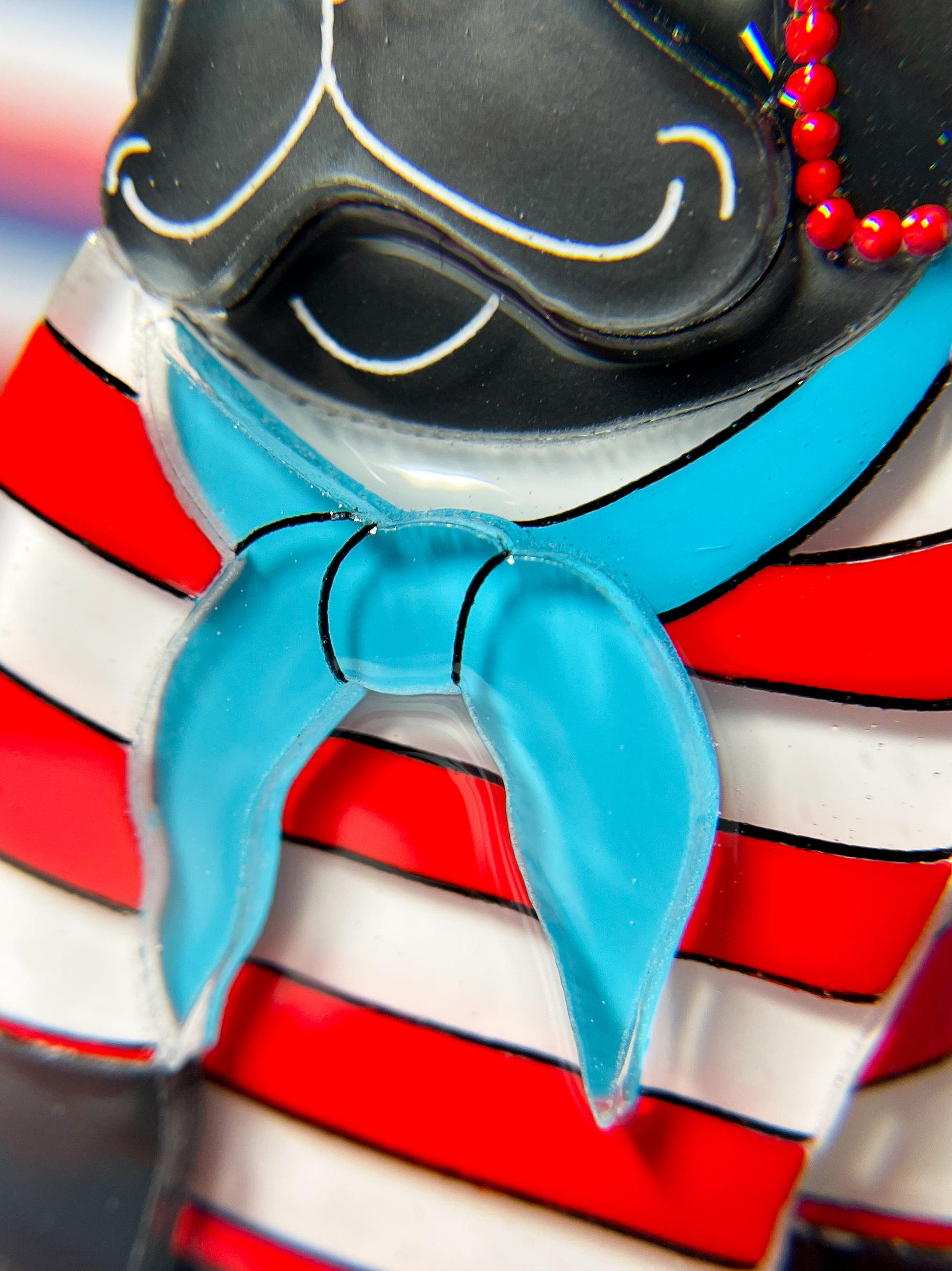 This brooch is made from 14 pieces of hand-painted acrylic plates, red nail bullions and a red jump ring, and assembled and coated with acrylic UV/LED resin and backed with a silver brooch pin.