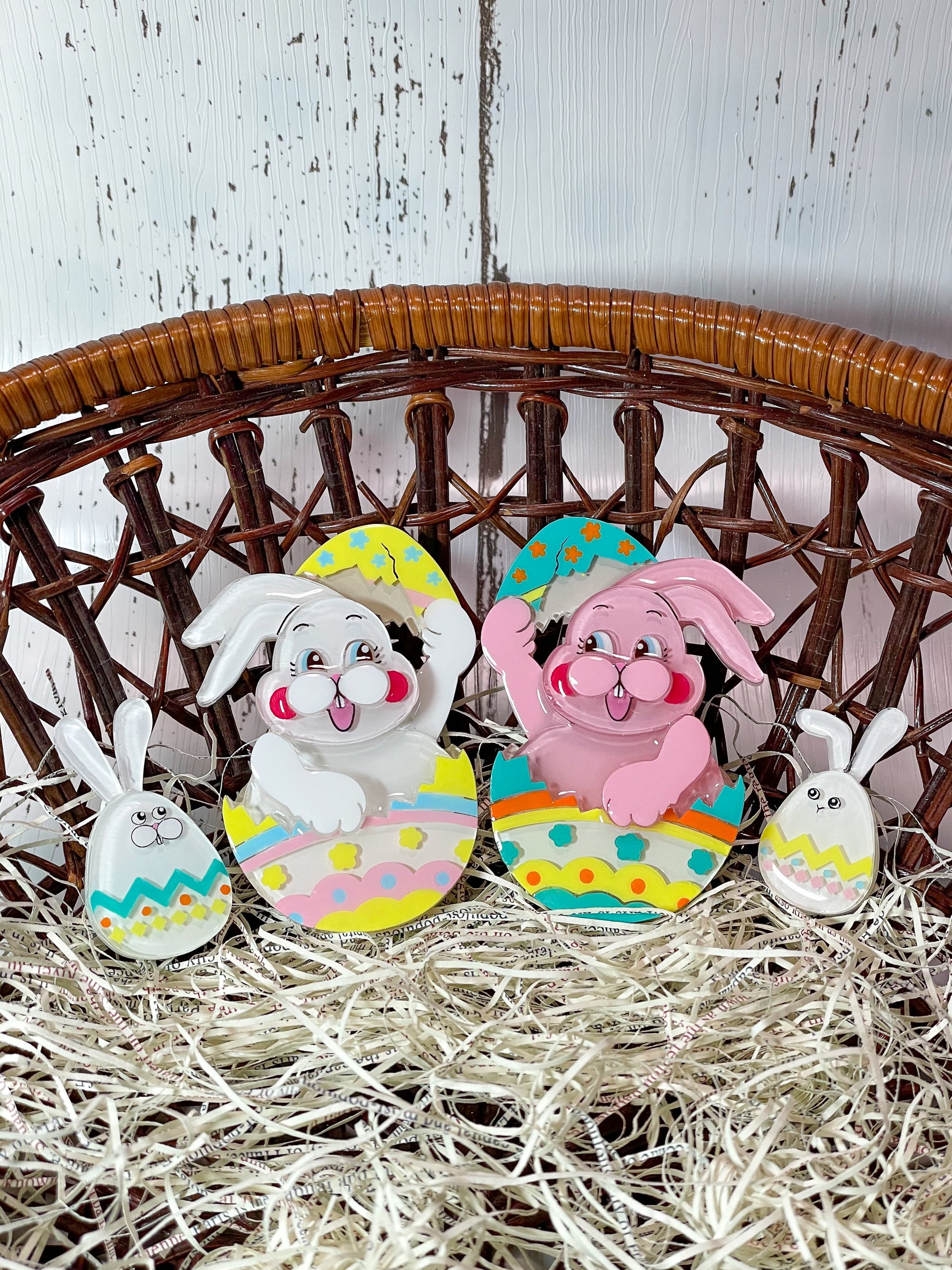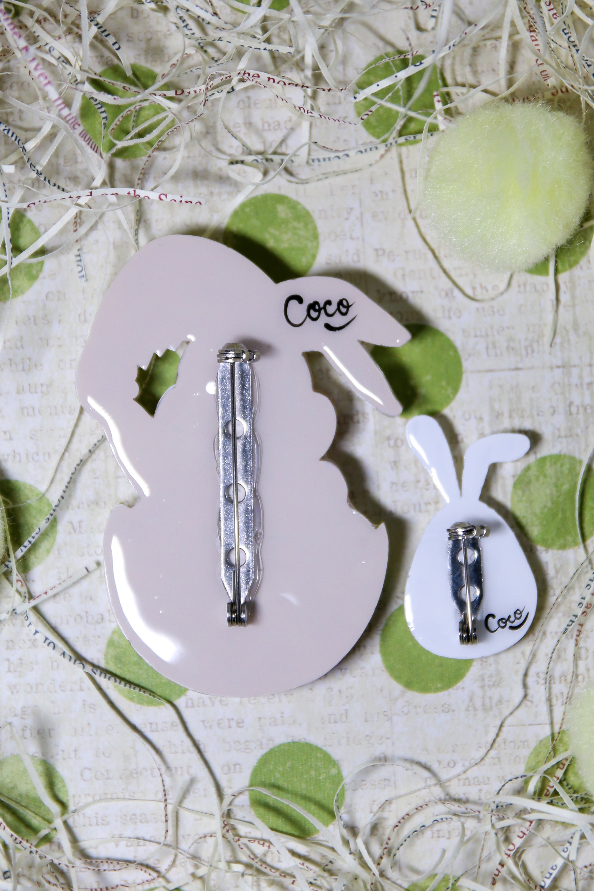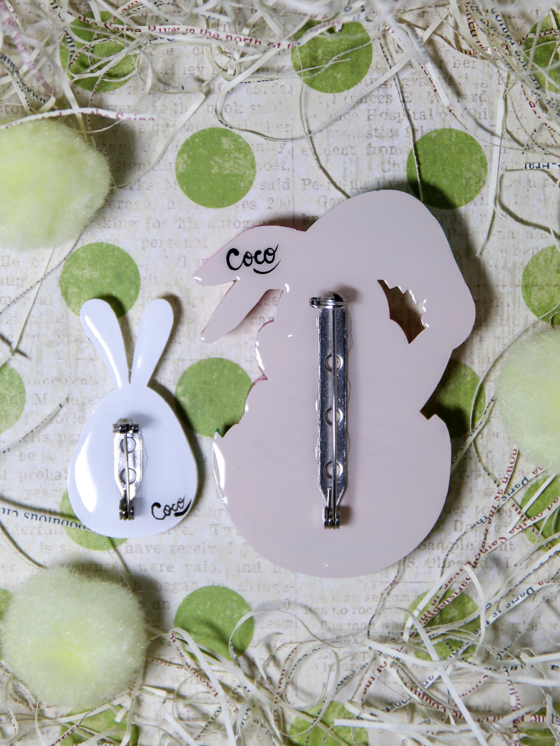 Those brooches are made from 2 pieces(for small and medium egg bunnies) and 7 pieces(for big egg bunnies) of hand-painted acrylic plates, assembled and coated with acrylic UV/LED resin and backed with a silver brooch pin.