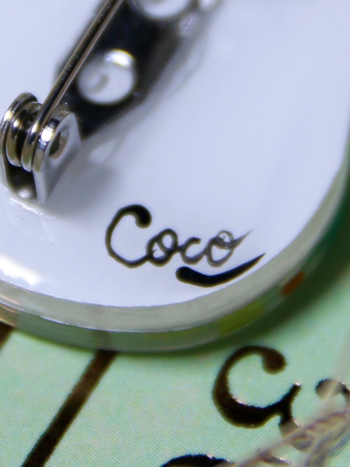 This brooch is made from 2 pieces of hand-painted acrylic plates, assembled and coated with acrylic UV/LED resin and backed with a silver brooch pin.