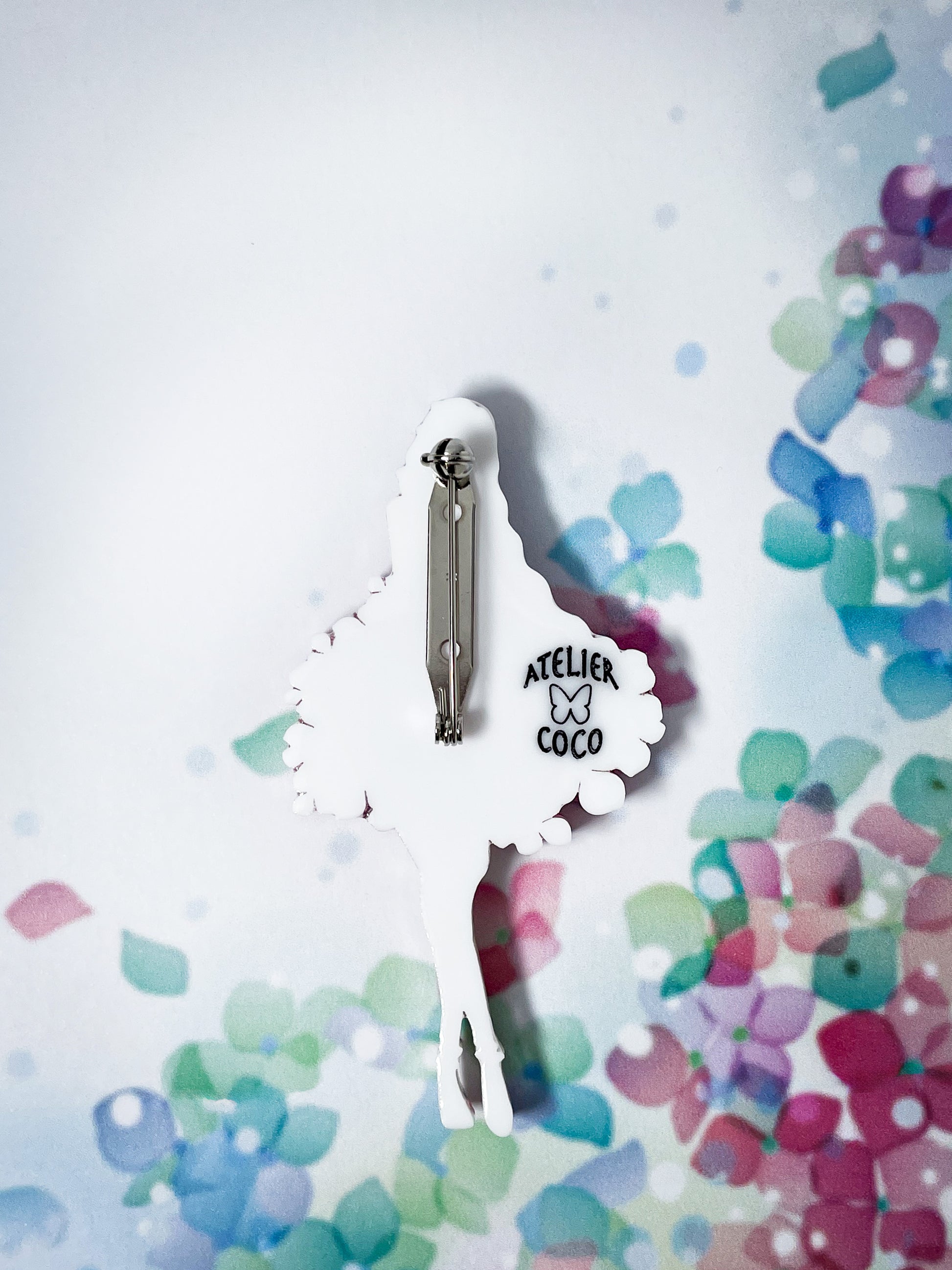 This brooch is made from 8 pieces of hand-painted acrylic plates, dry hydrangeas and silver nail bullions,assembled and coated with acrylic UV/LED resin and backed with a silver brooch pin.