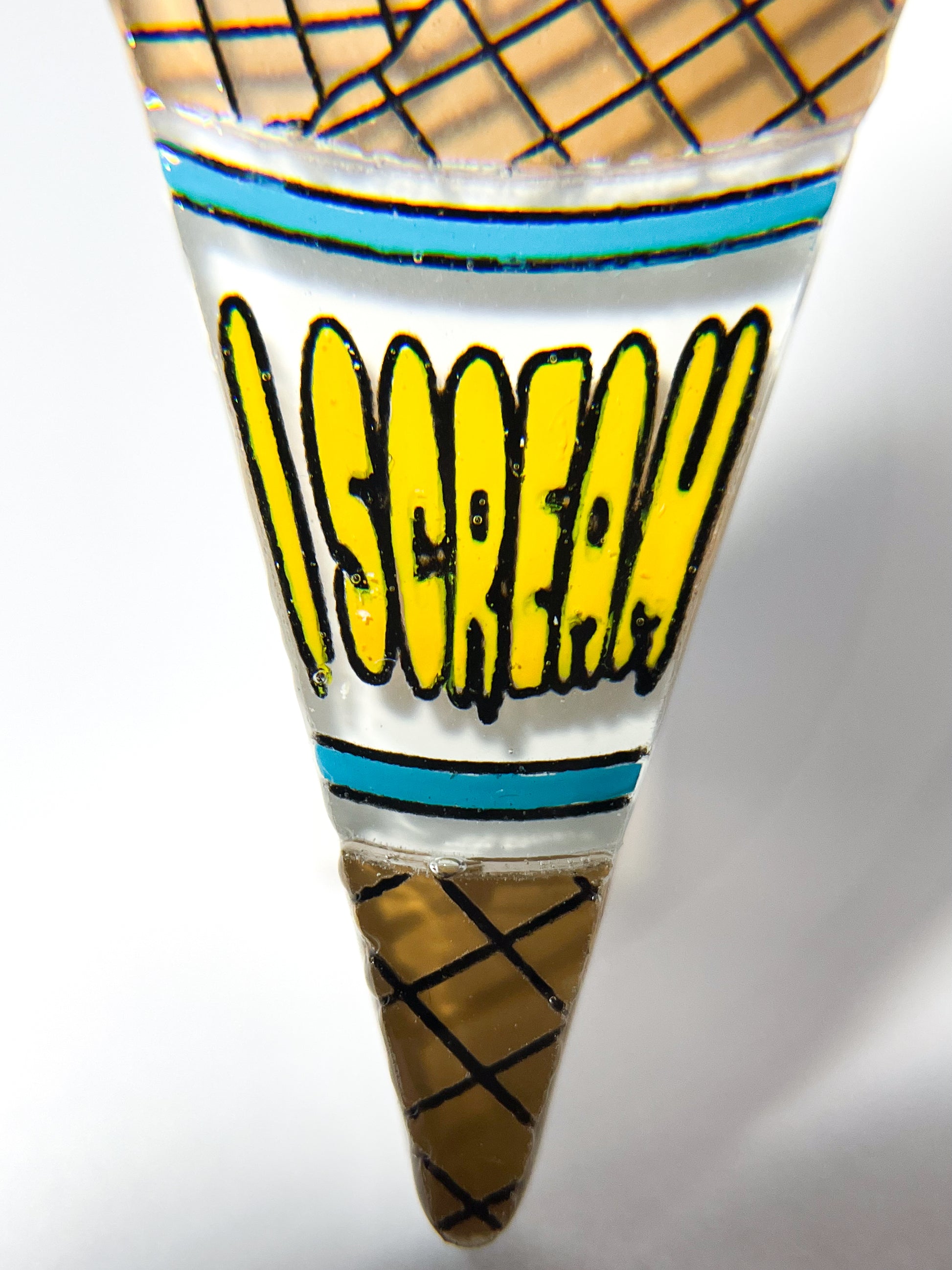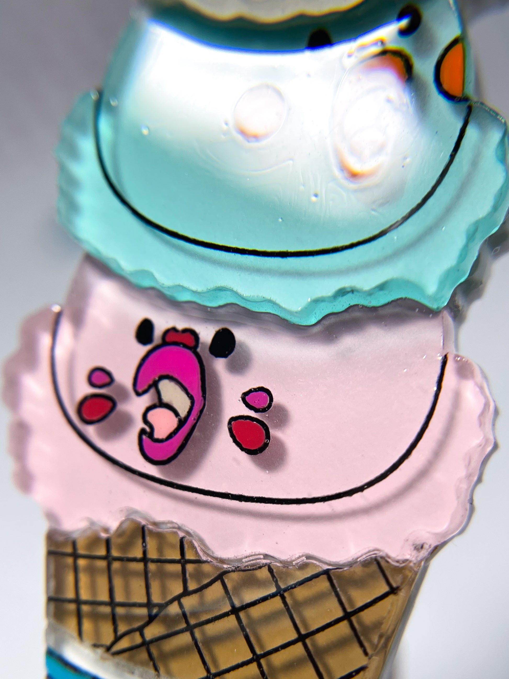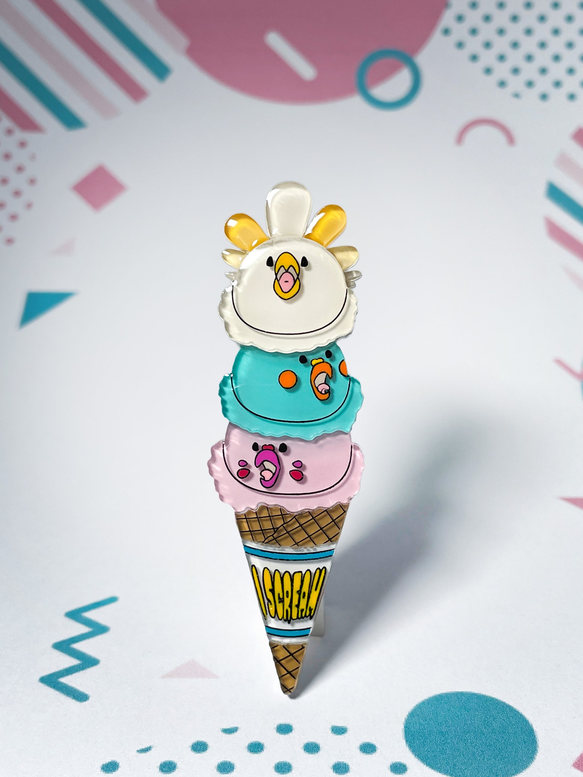 This brooch is made from 10 pieces of hand-painted acrylic plates, assembled and coated with acrylic UV/LED resin and backed with a silver brooch pin.