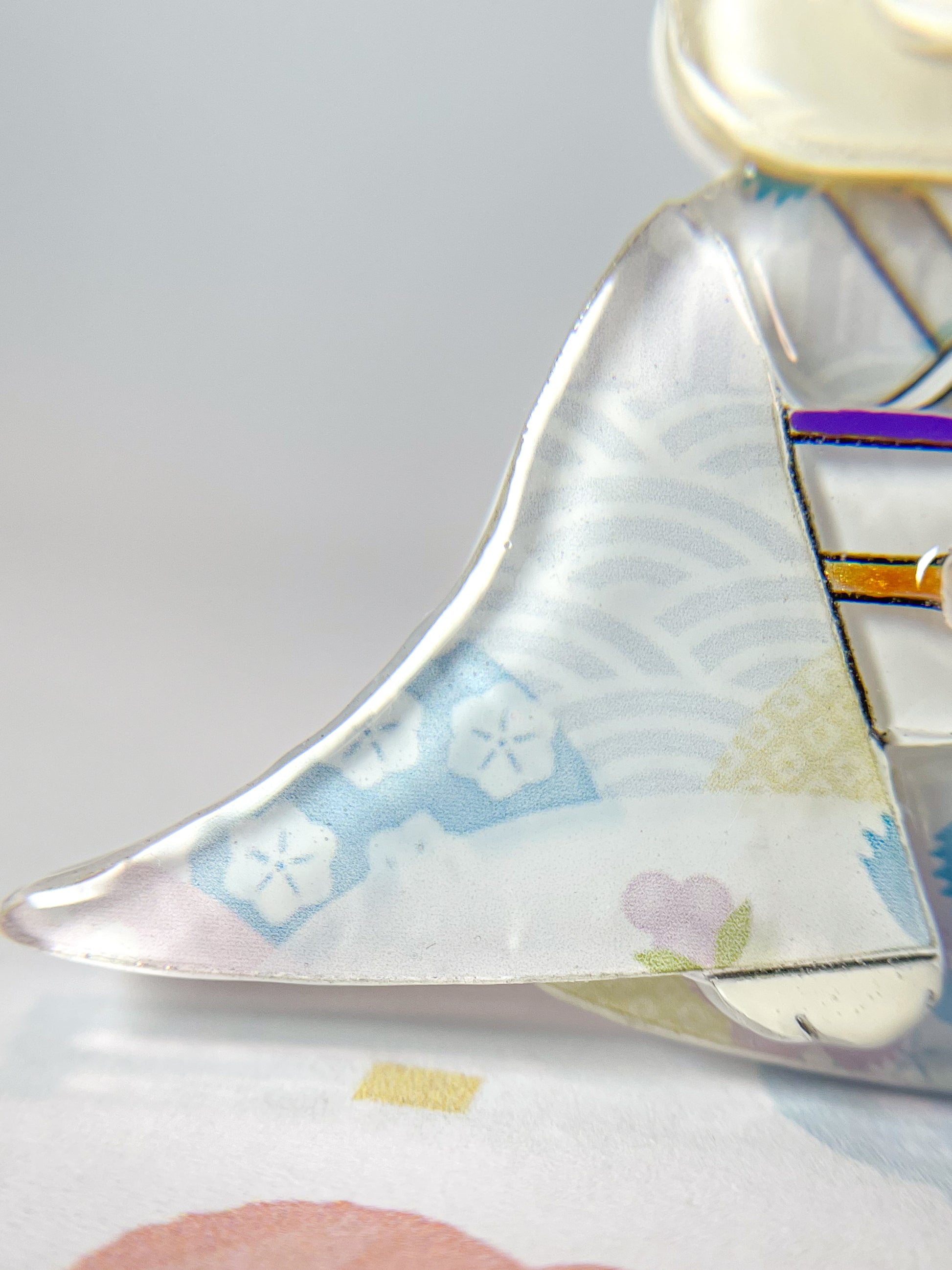 This brooch is made from 9 pieces of hand-painted acrylic plates, assembled and coated with acrylic UV/LED resin and backed with a silver brooch pin.