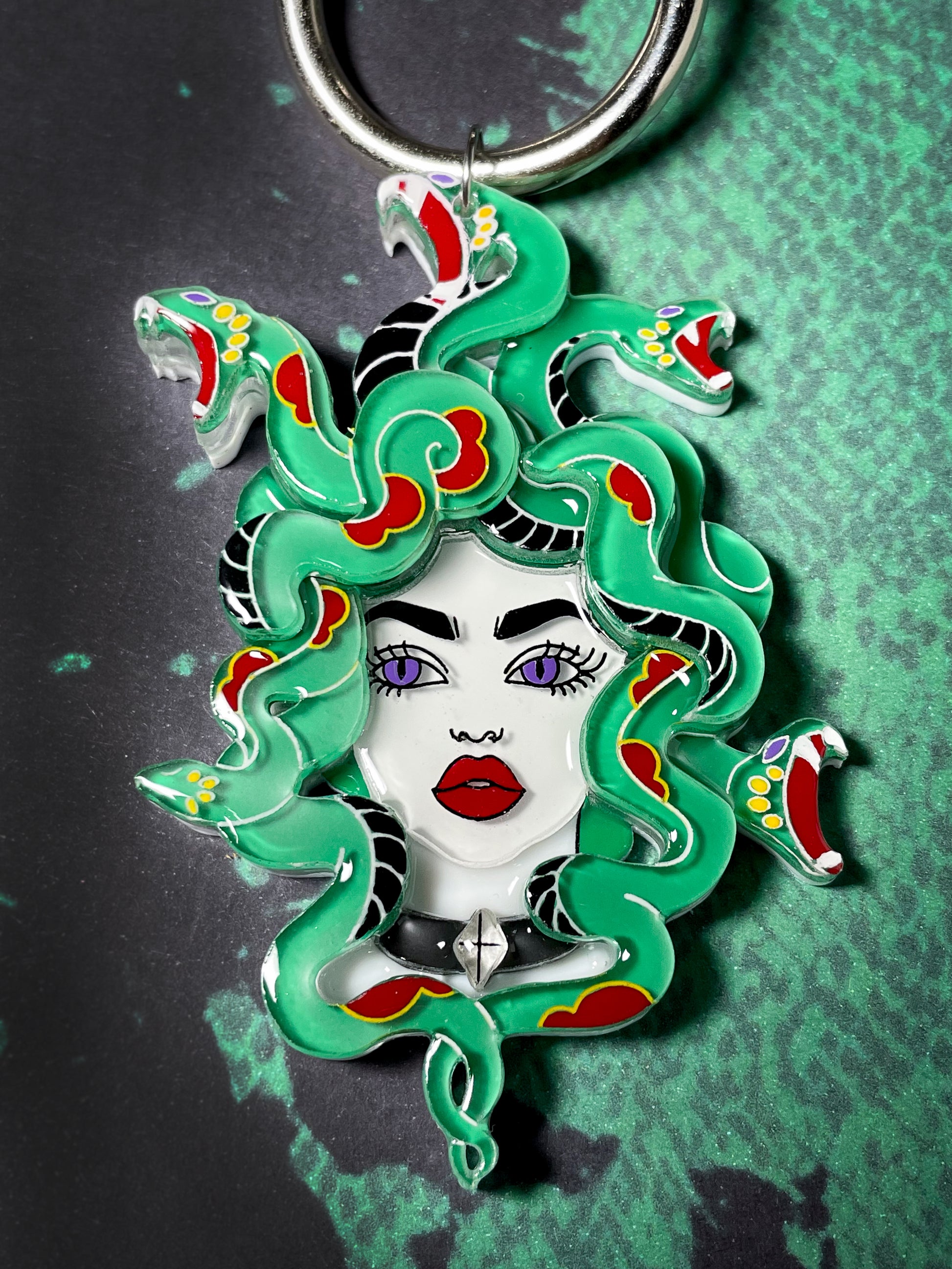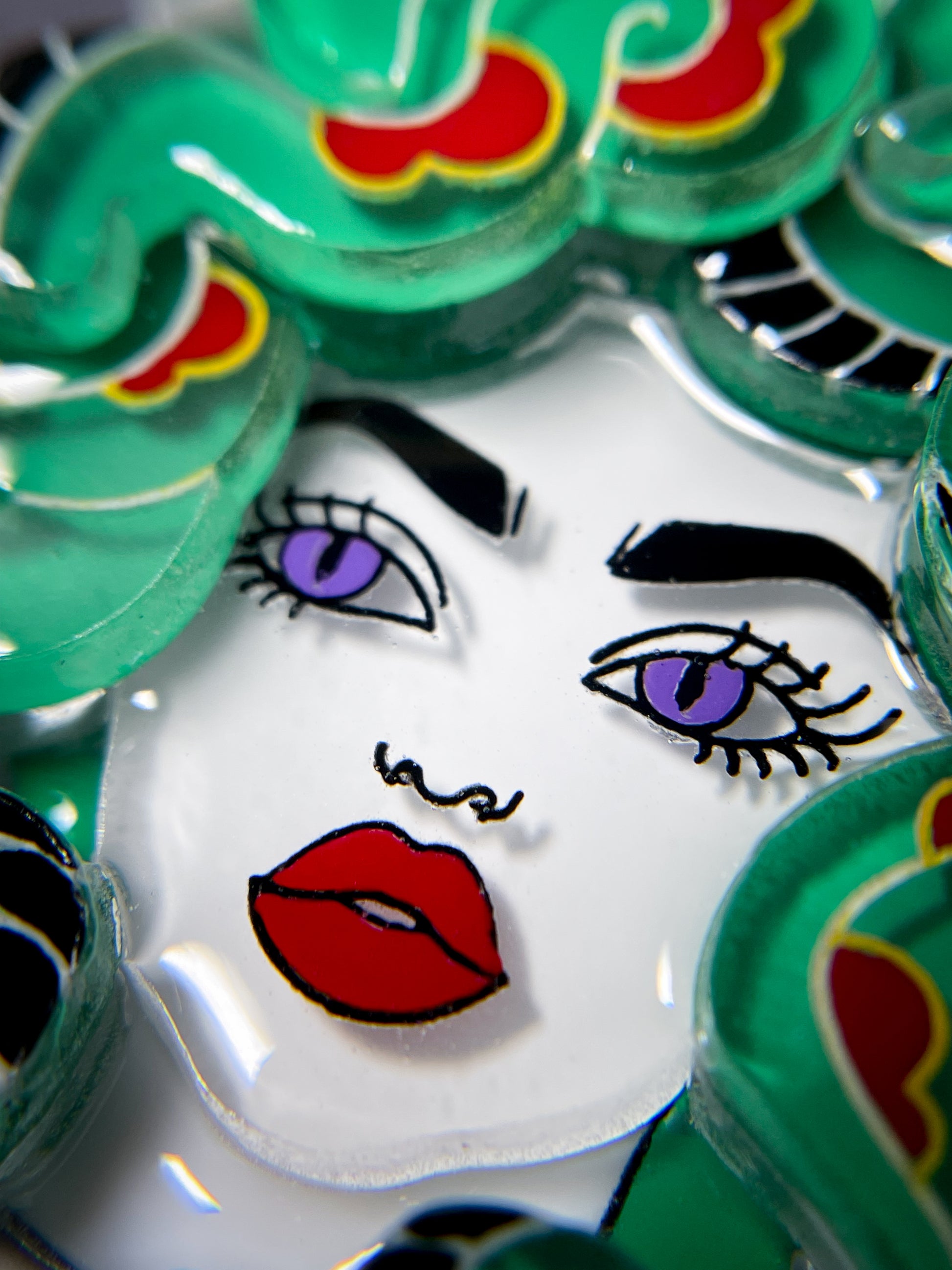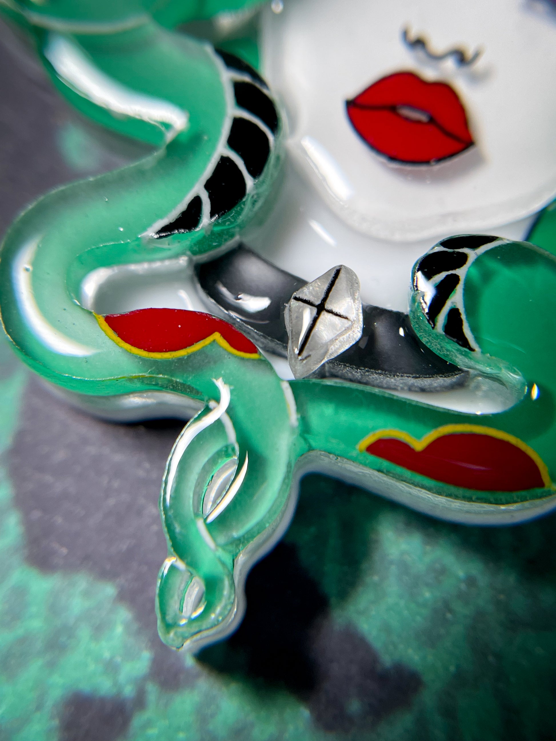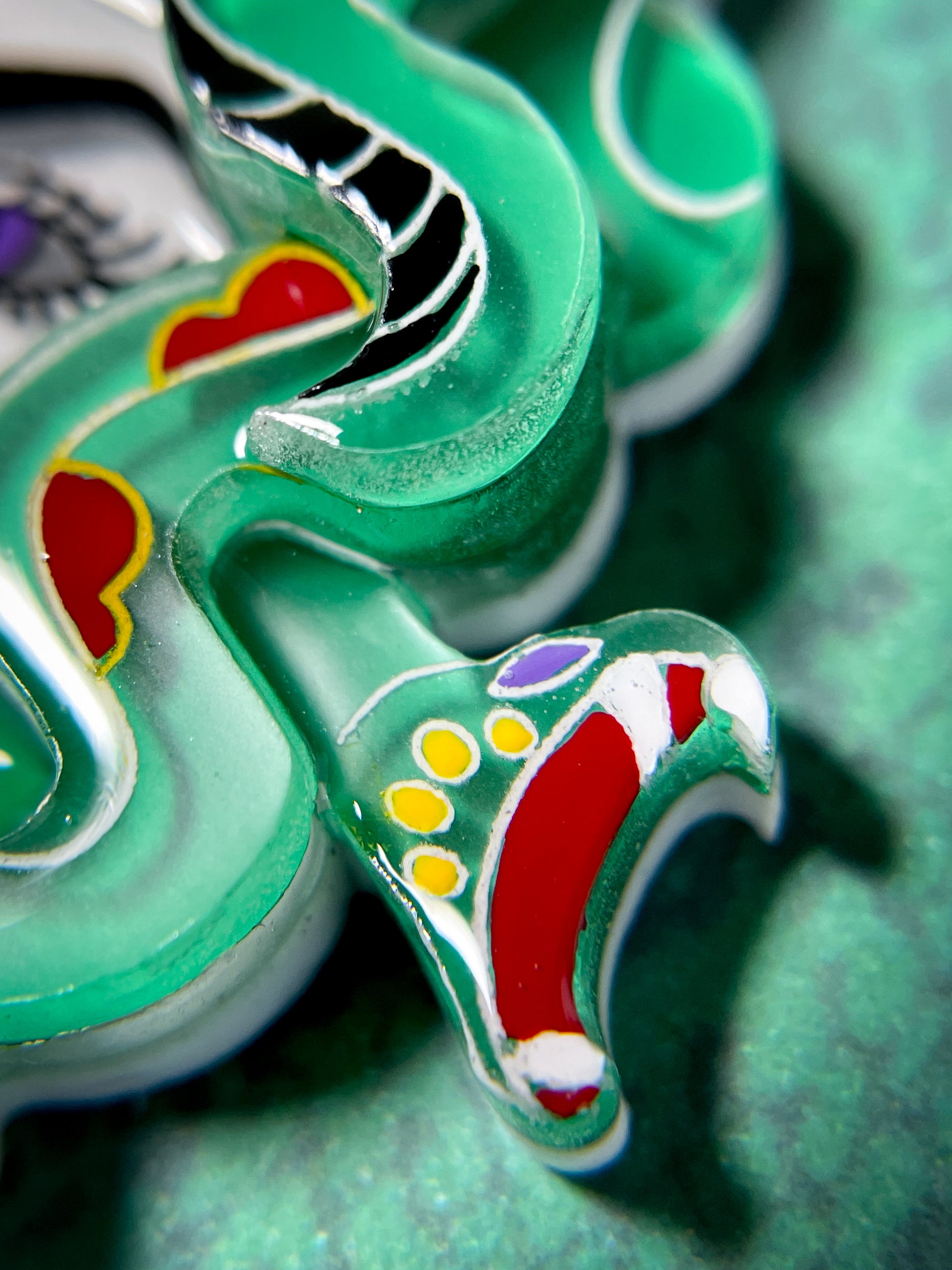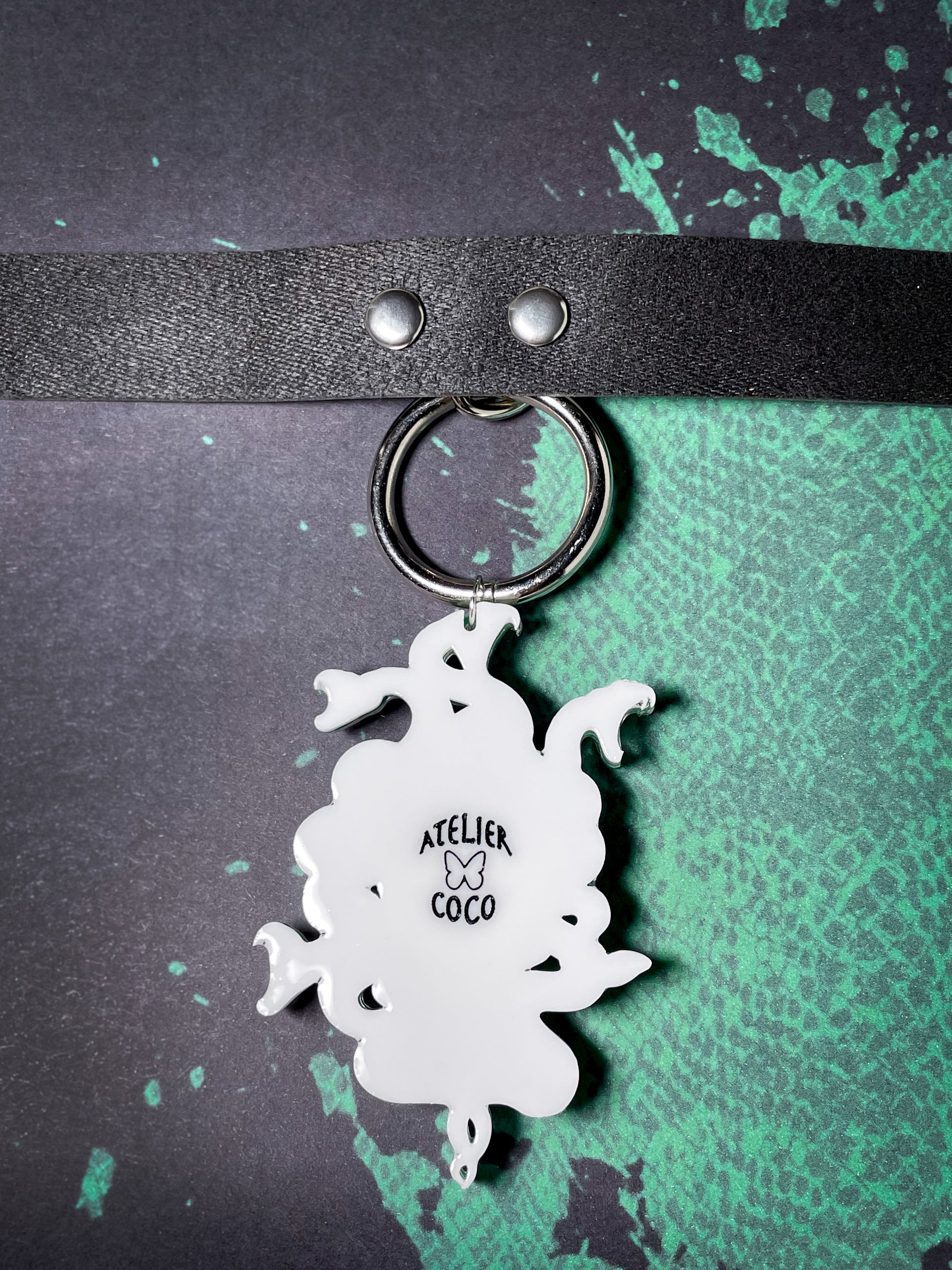 This necklace is made from 8 pieces of hand-painted acrylic plates, assembled and coated with acrylic UV/LED resin and finished with a silver surgical stainless steel chain with an extender or a black leather choker that can be adjusted to four levels.