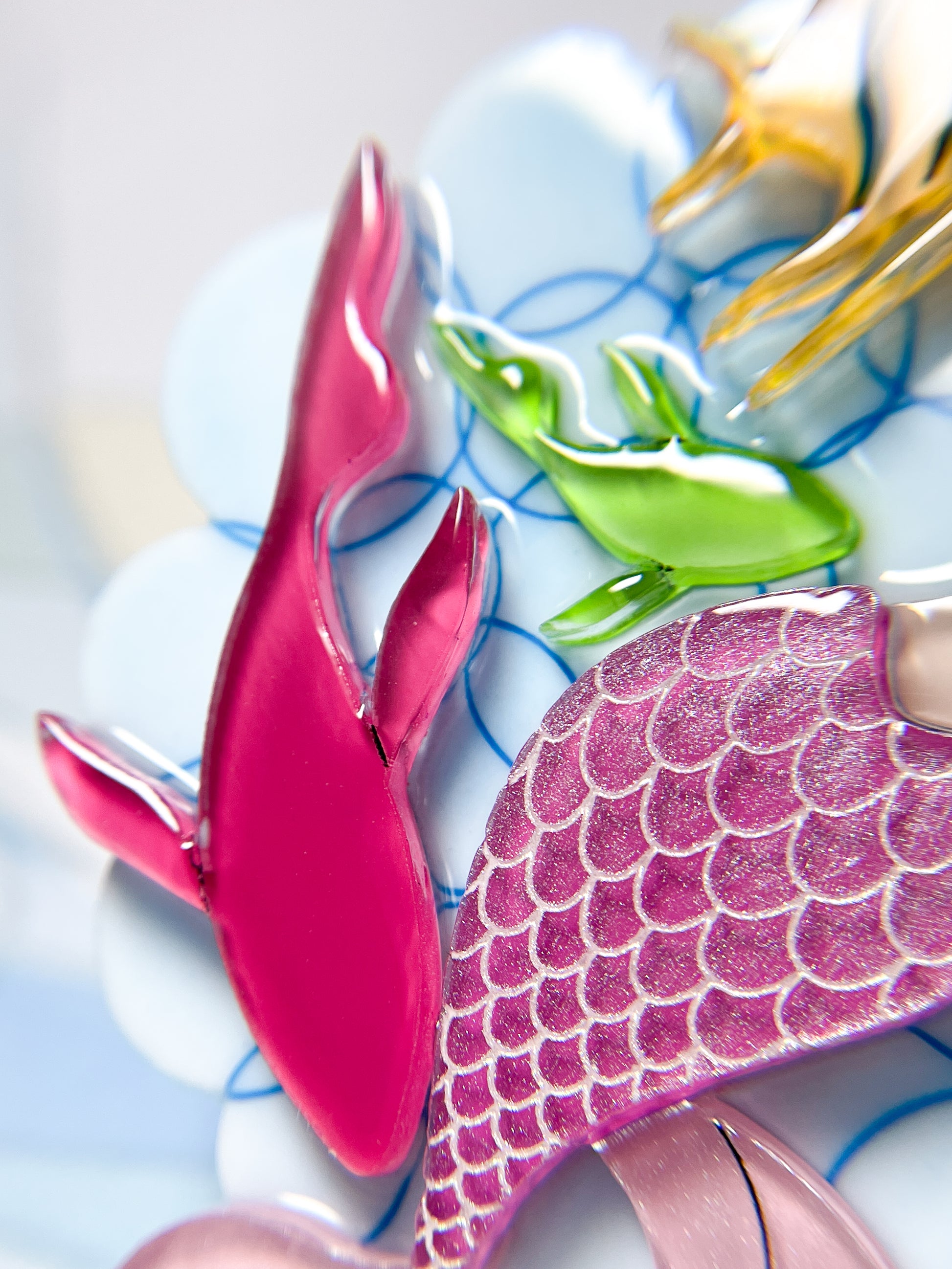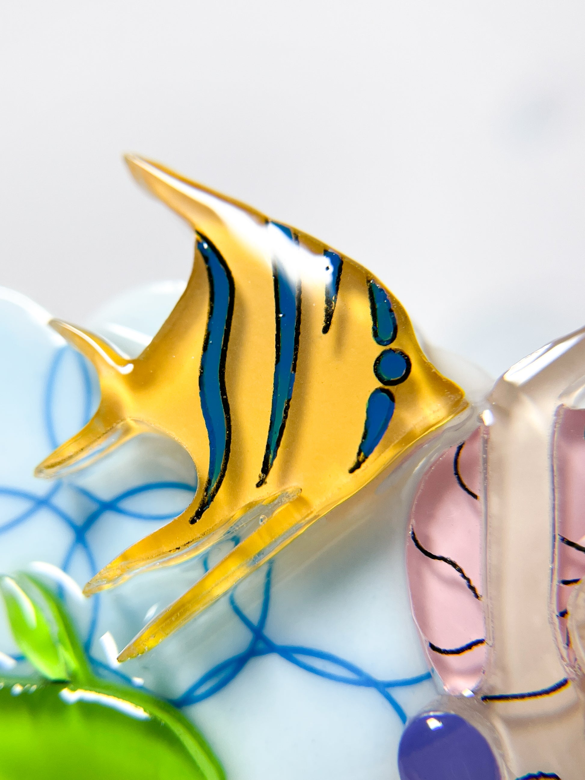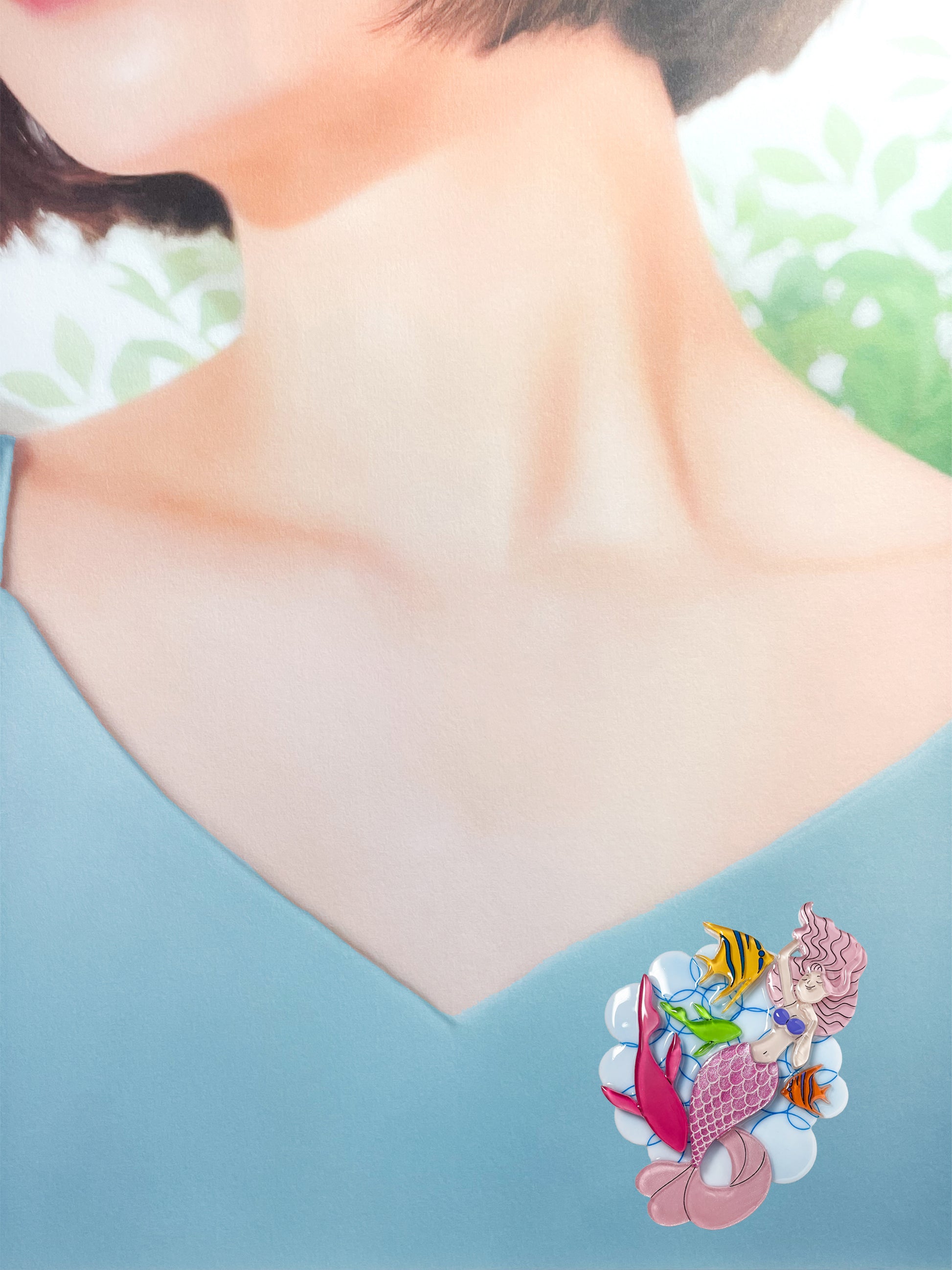 This brooch is made from 19 pieces of hand-painted acrylic plates, assembled and coated with acrylic UV/LED resin and backed with a silver brooch pin.