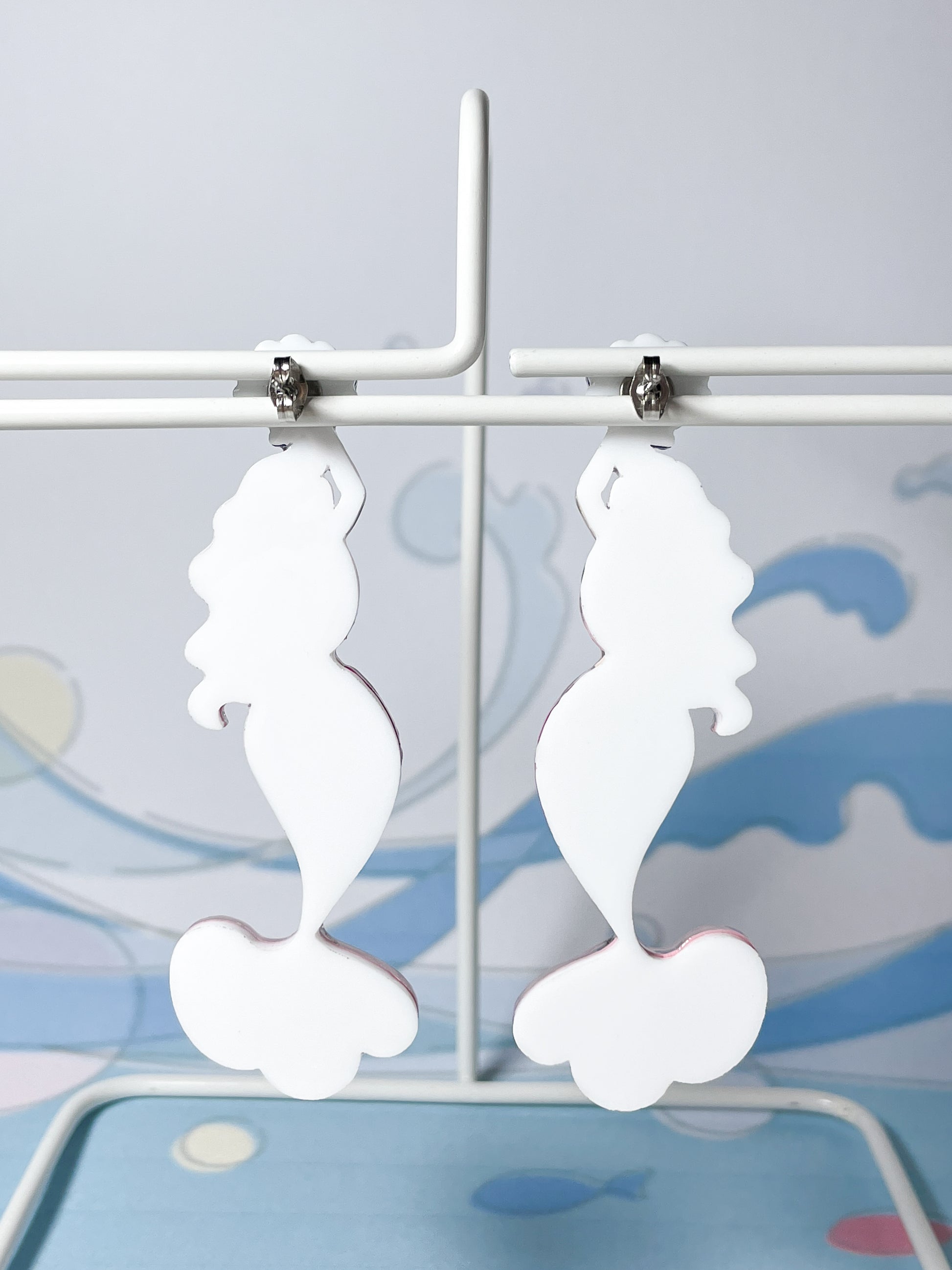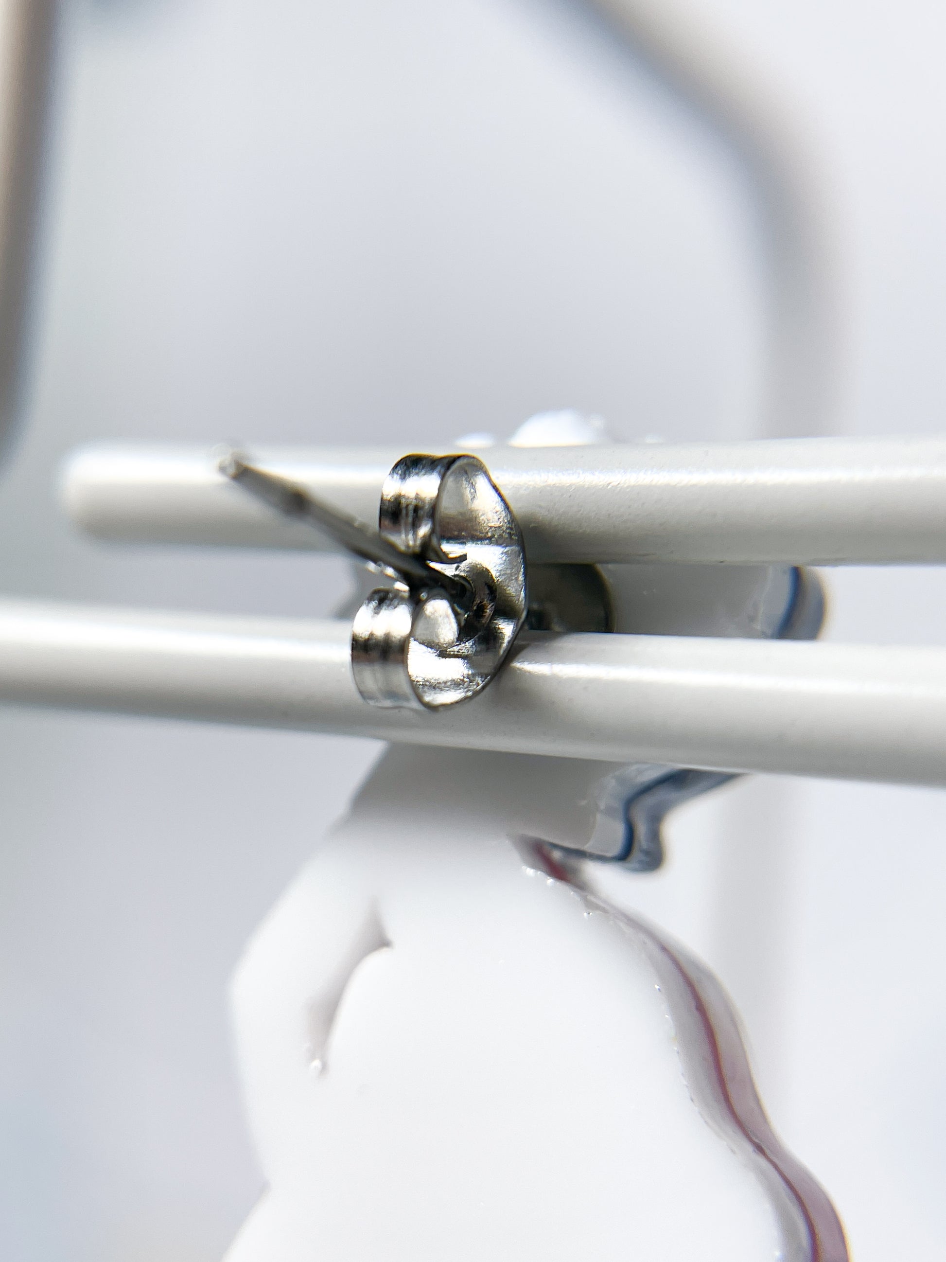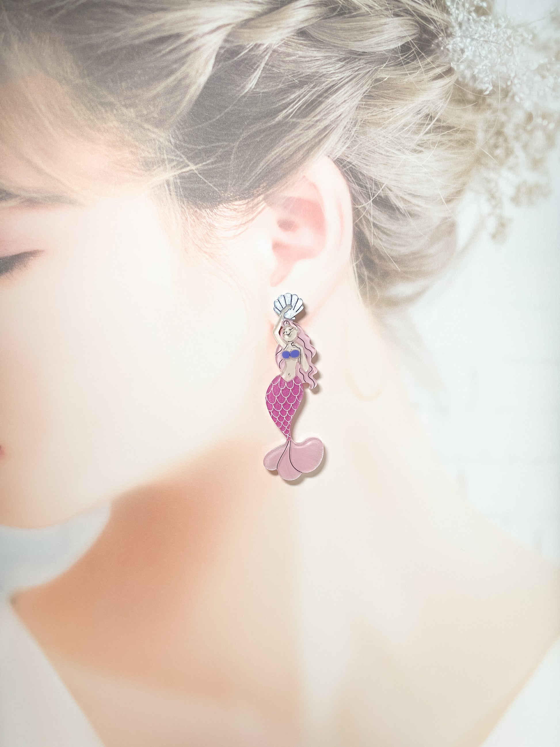 These earrings are made from 18 pieces of acrylic plates, hand-painted and coated with acrylic UV/LED resin and finished with silver-plated surgical stainless steel studs.