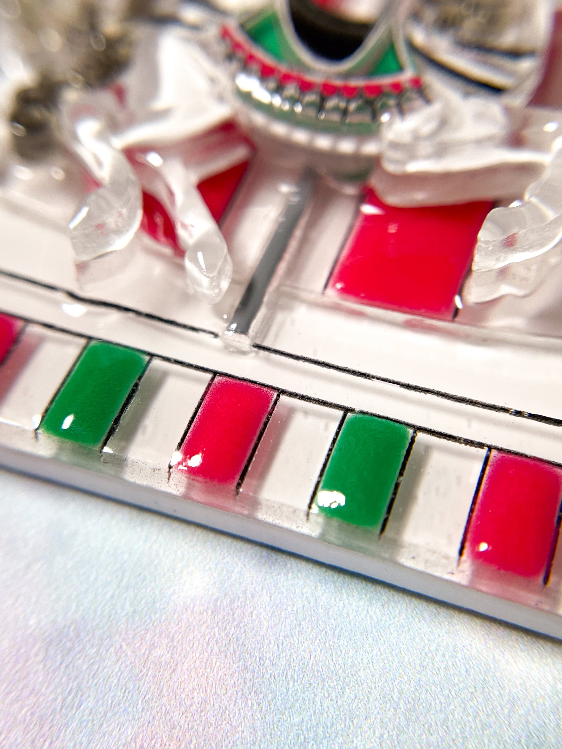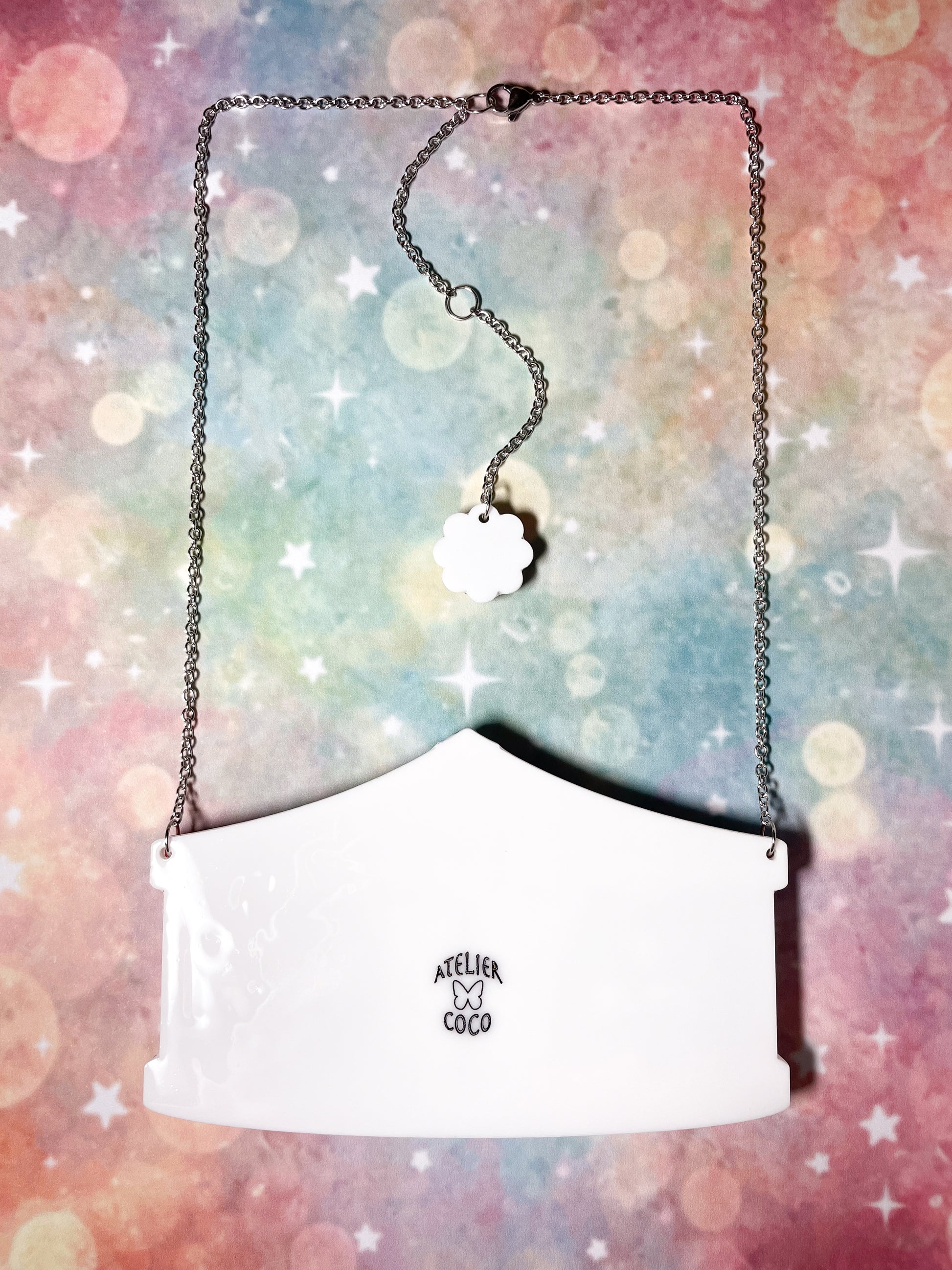 This necklace is made from 36 pieces of hand-painted acrylic plates and pearls, assembled and coated with acrylic UV/LED resin and finished with a silver surgical stainless steel chain with an extender.