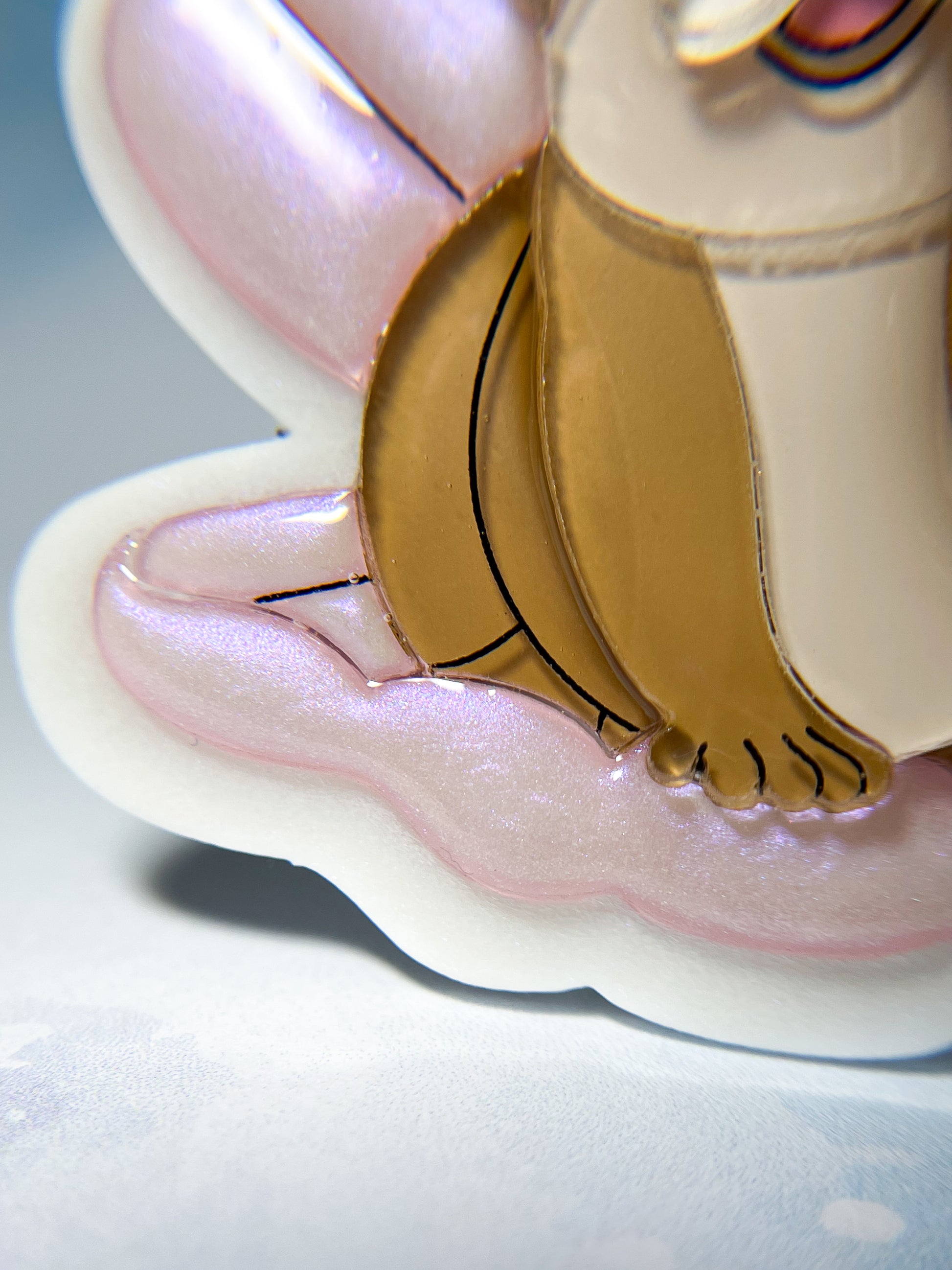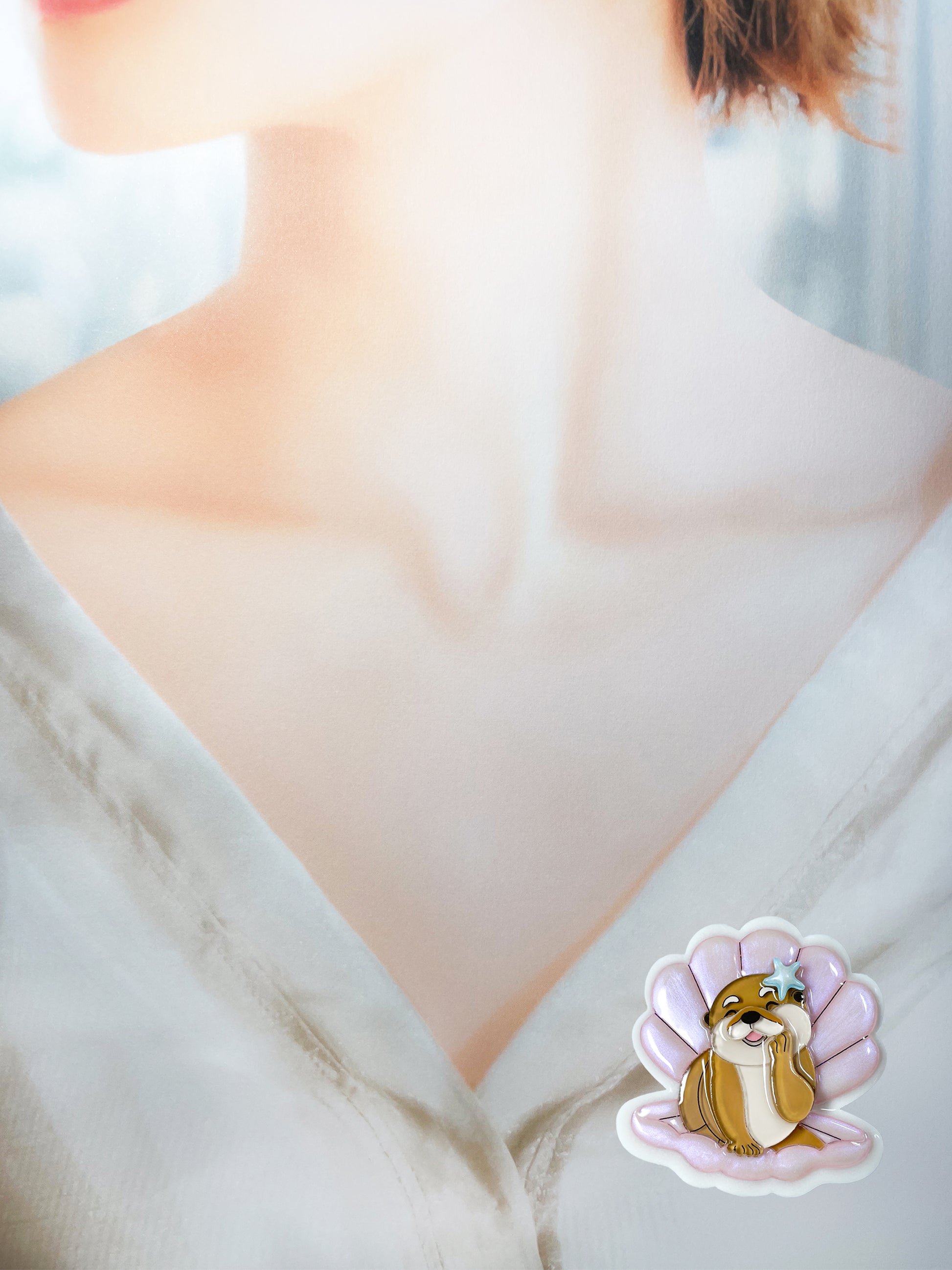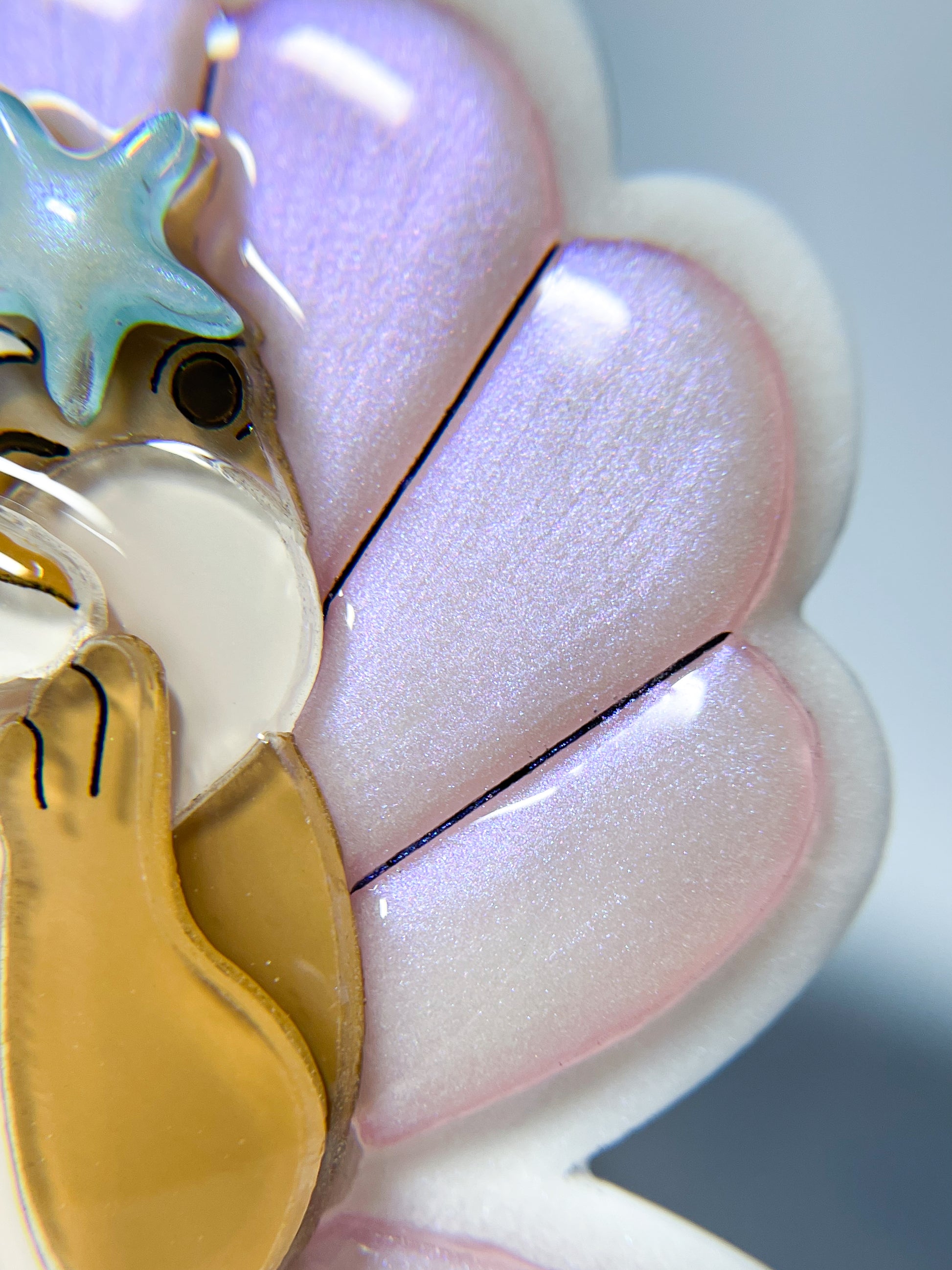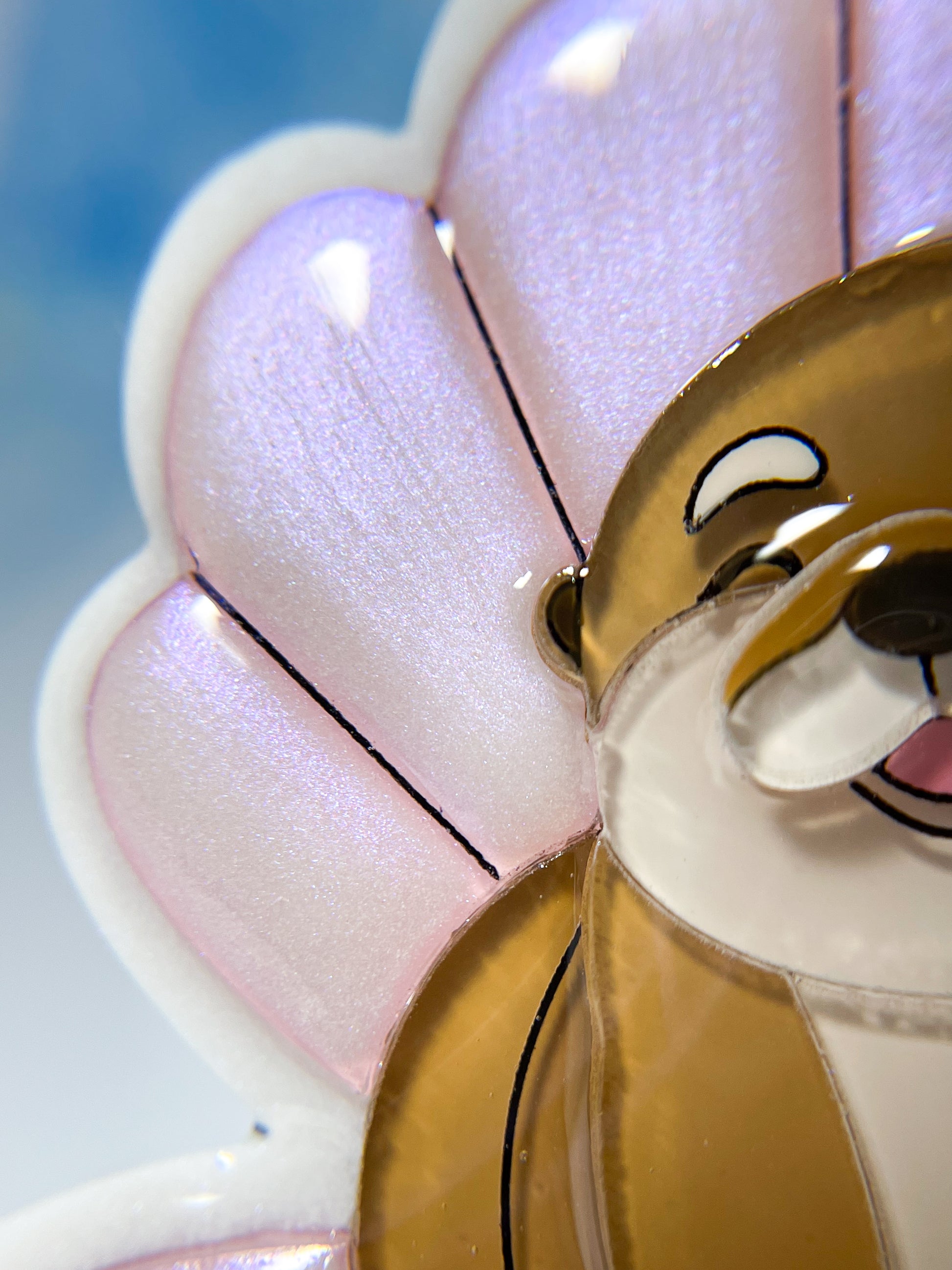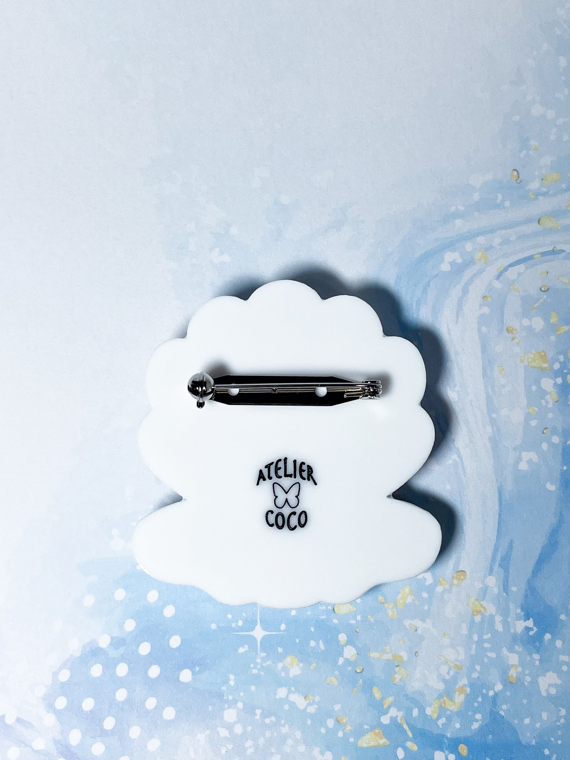 This brooch is made from 12 pieces of hand-painted acrylic plates, assembled and coated with acrylic UV/LED resin and backed with a silver brooch pin.