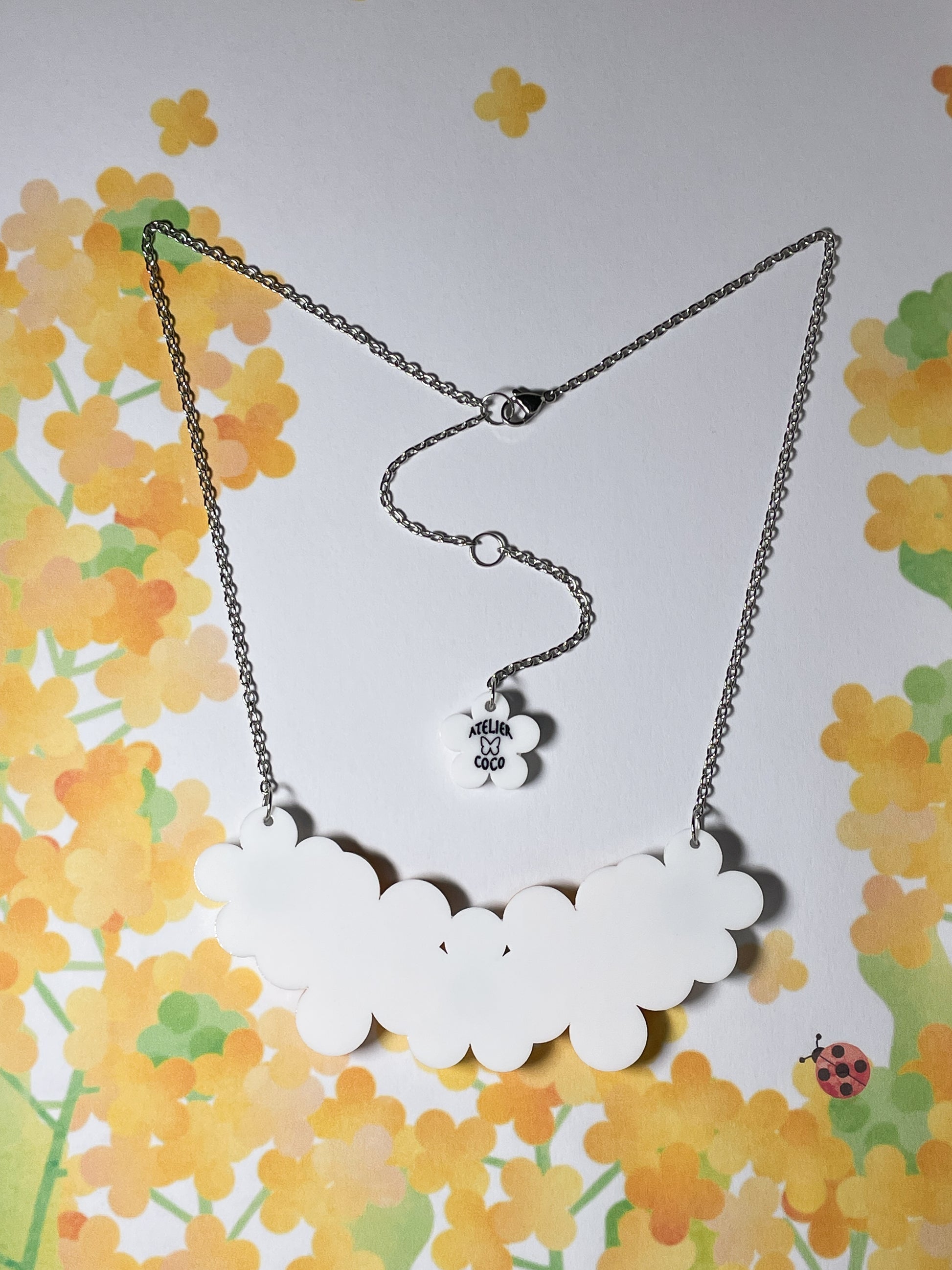 This necklace is made from 11 pieces of hand-painted acrylic plates, assembled and coated with acrylic UV/LED resin and finished with a silver surgical stainless steel chain with an extender.