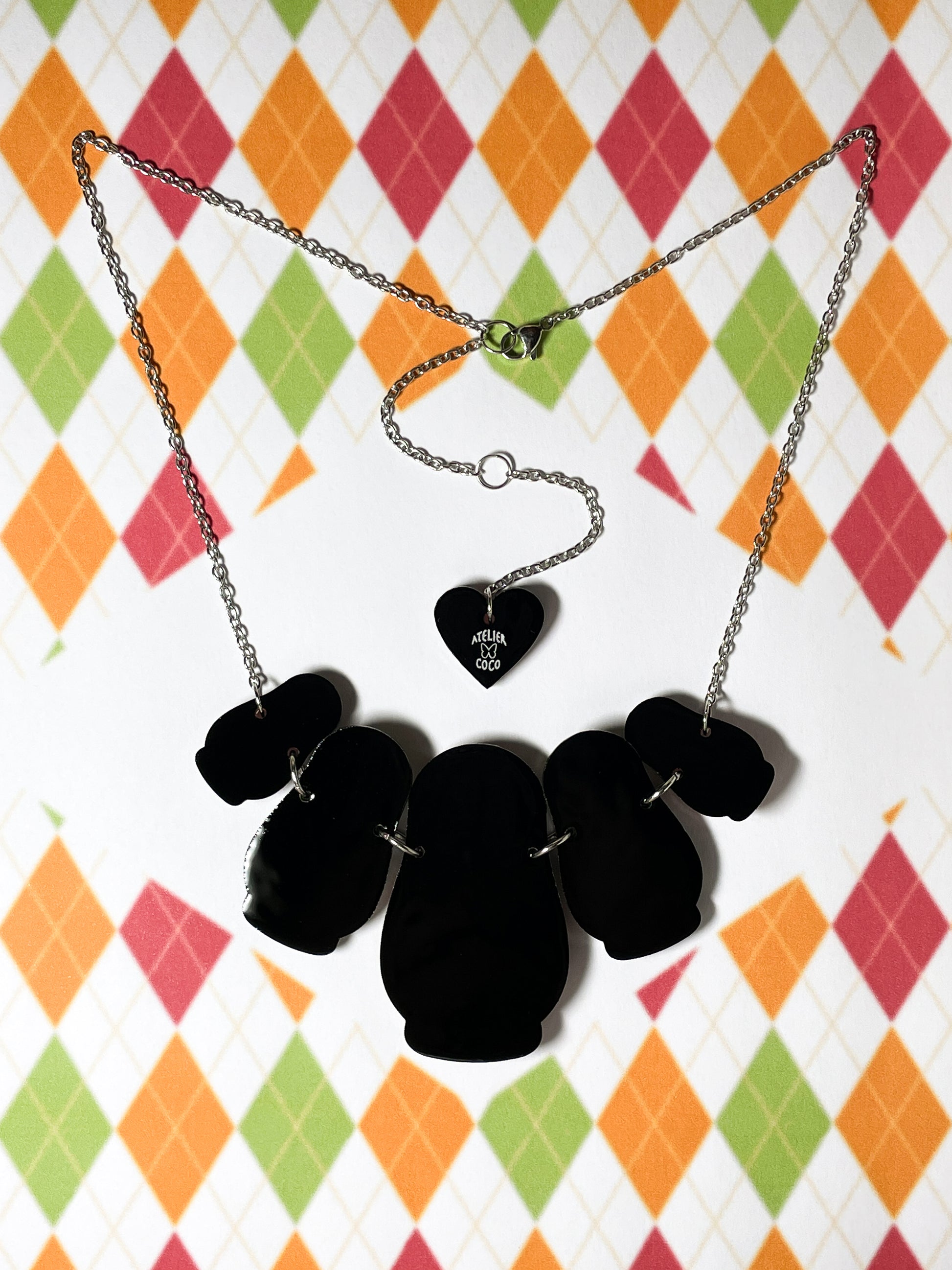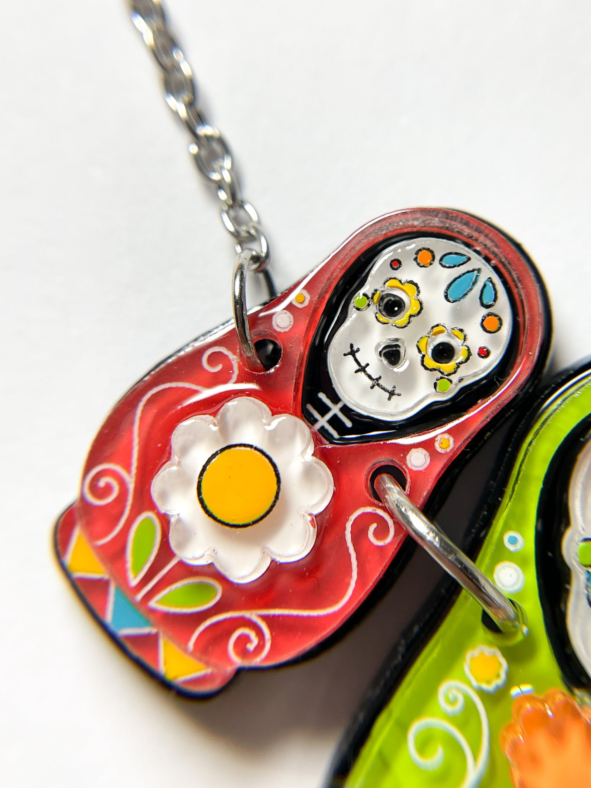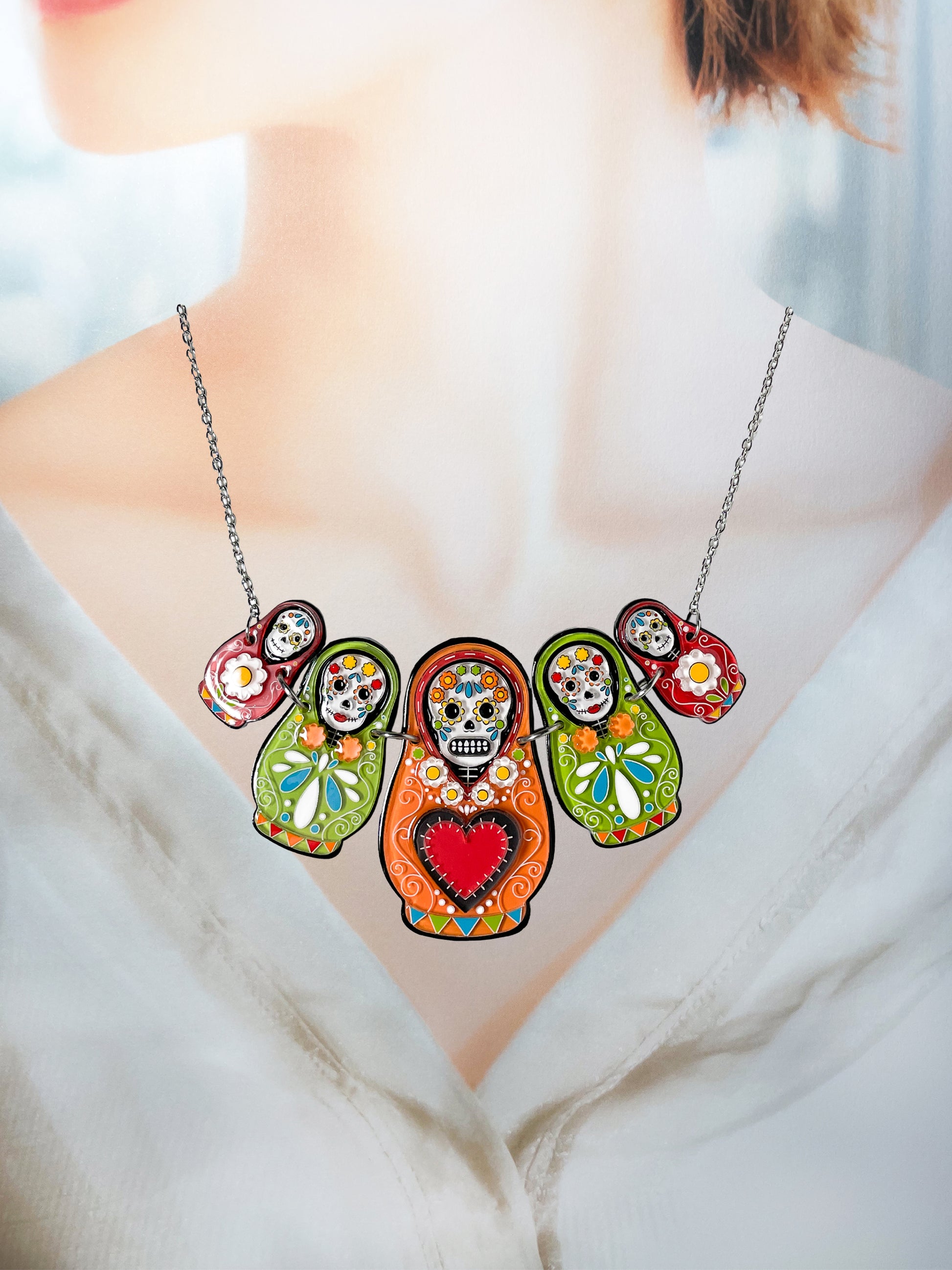 This necklace is made from 37 pieces of hand-painted acrylic plates, assembled and coated with acrylic UV/LED resin and finished with a silver surgical stainless steel chain with an extender.