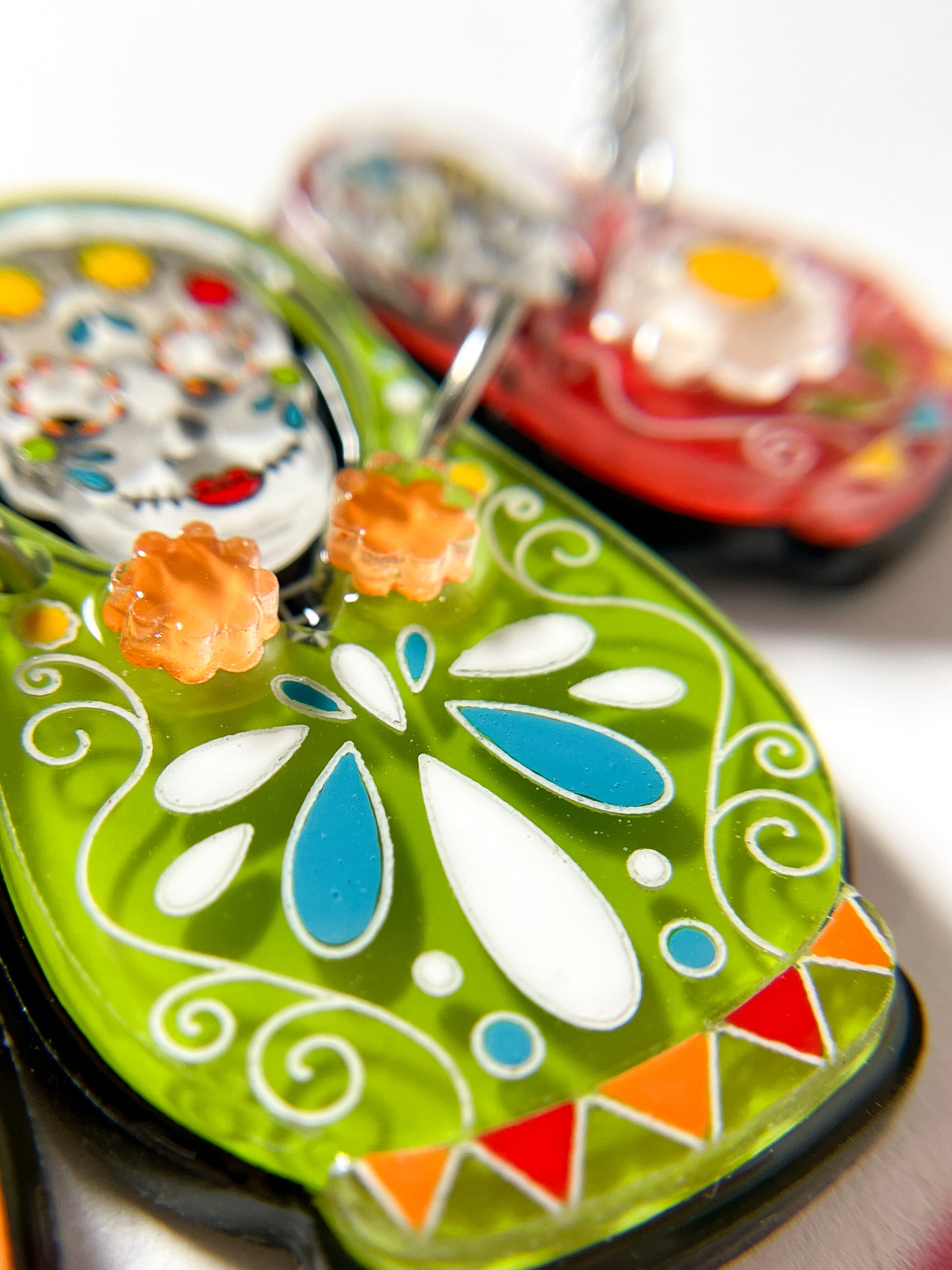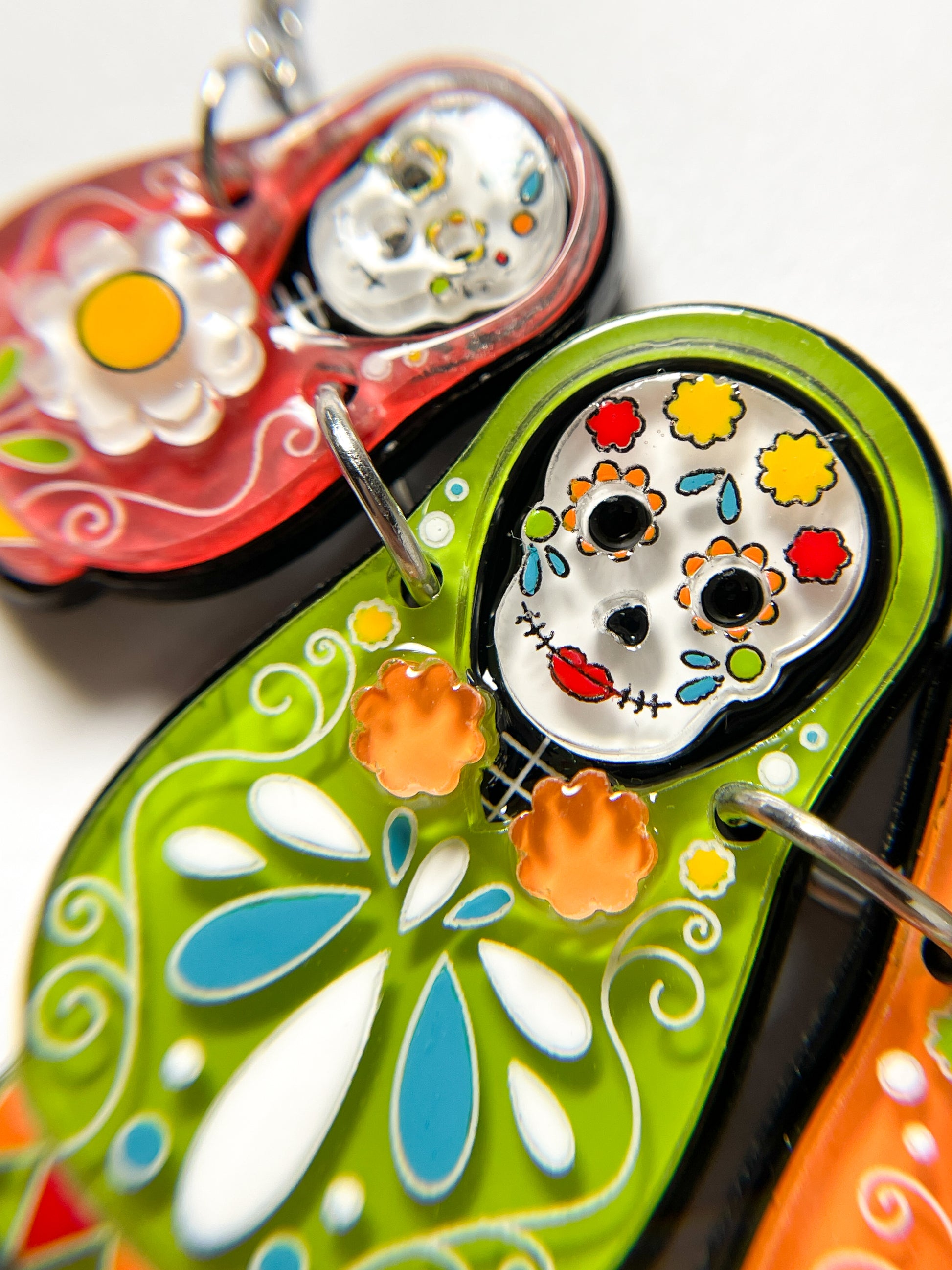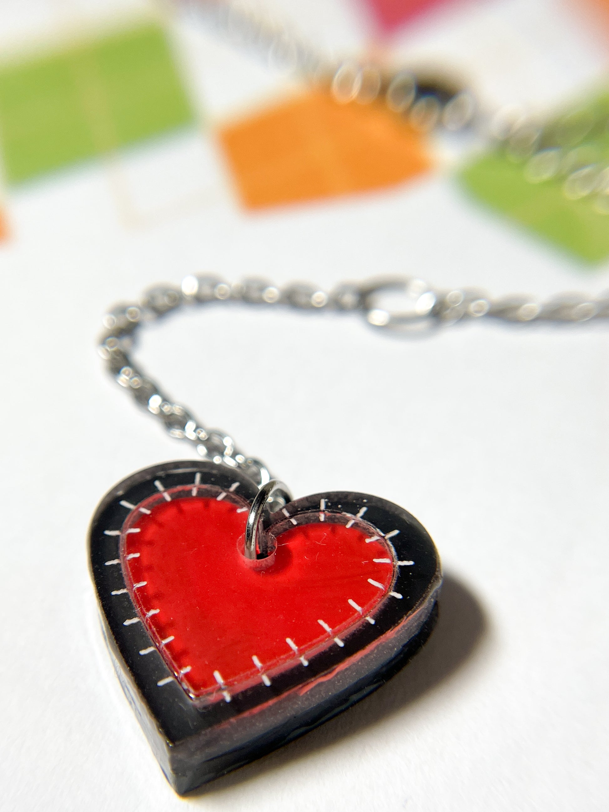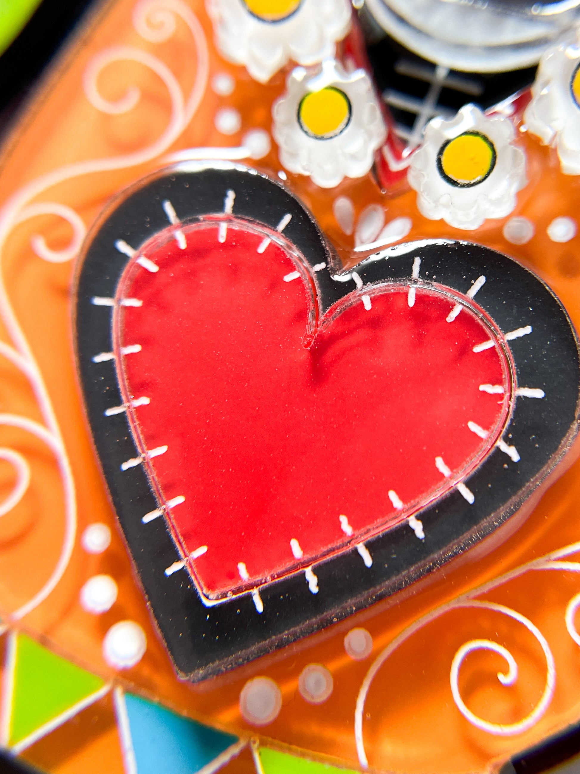 This necklace is made from 37 pieces of hand-painted acrylic plates, assembled and coated with acrylic UV/LED resin and finished with a silver surgical stainless steel chain with an extender.