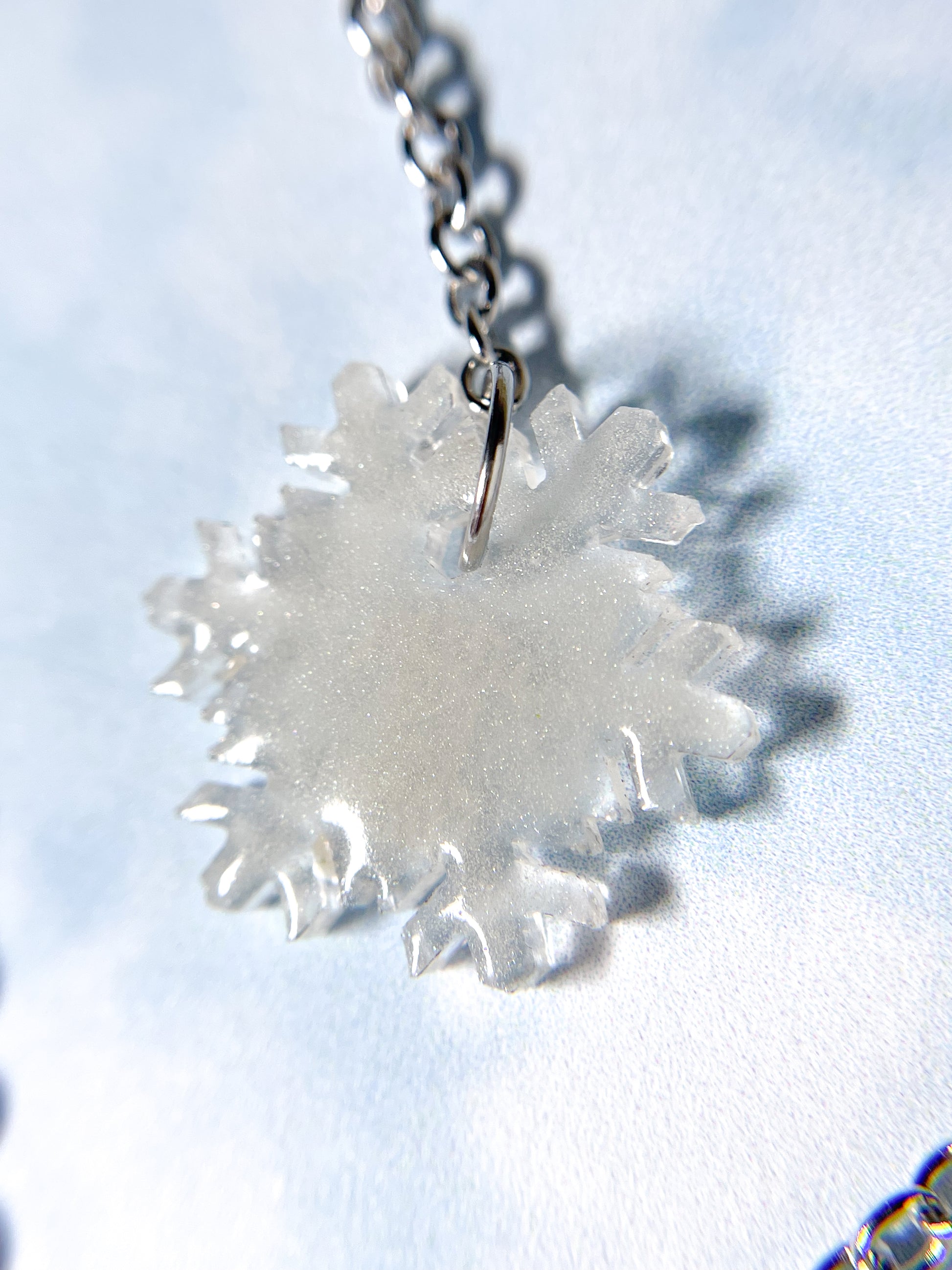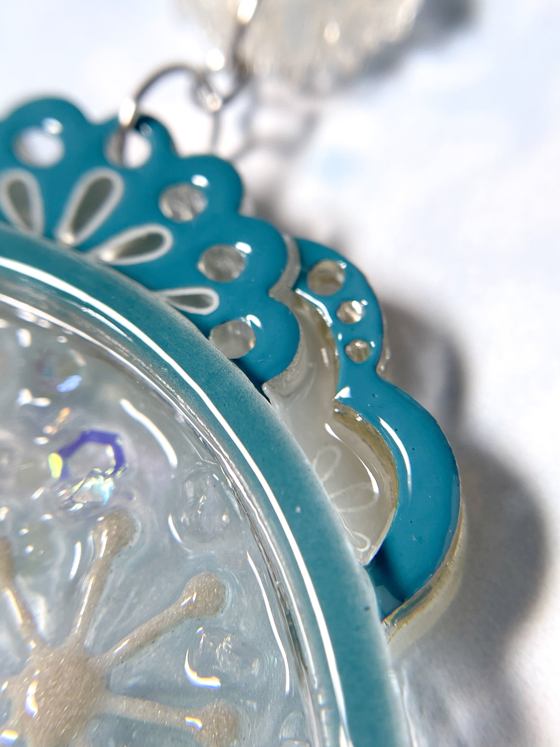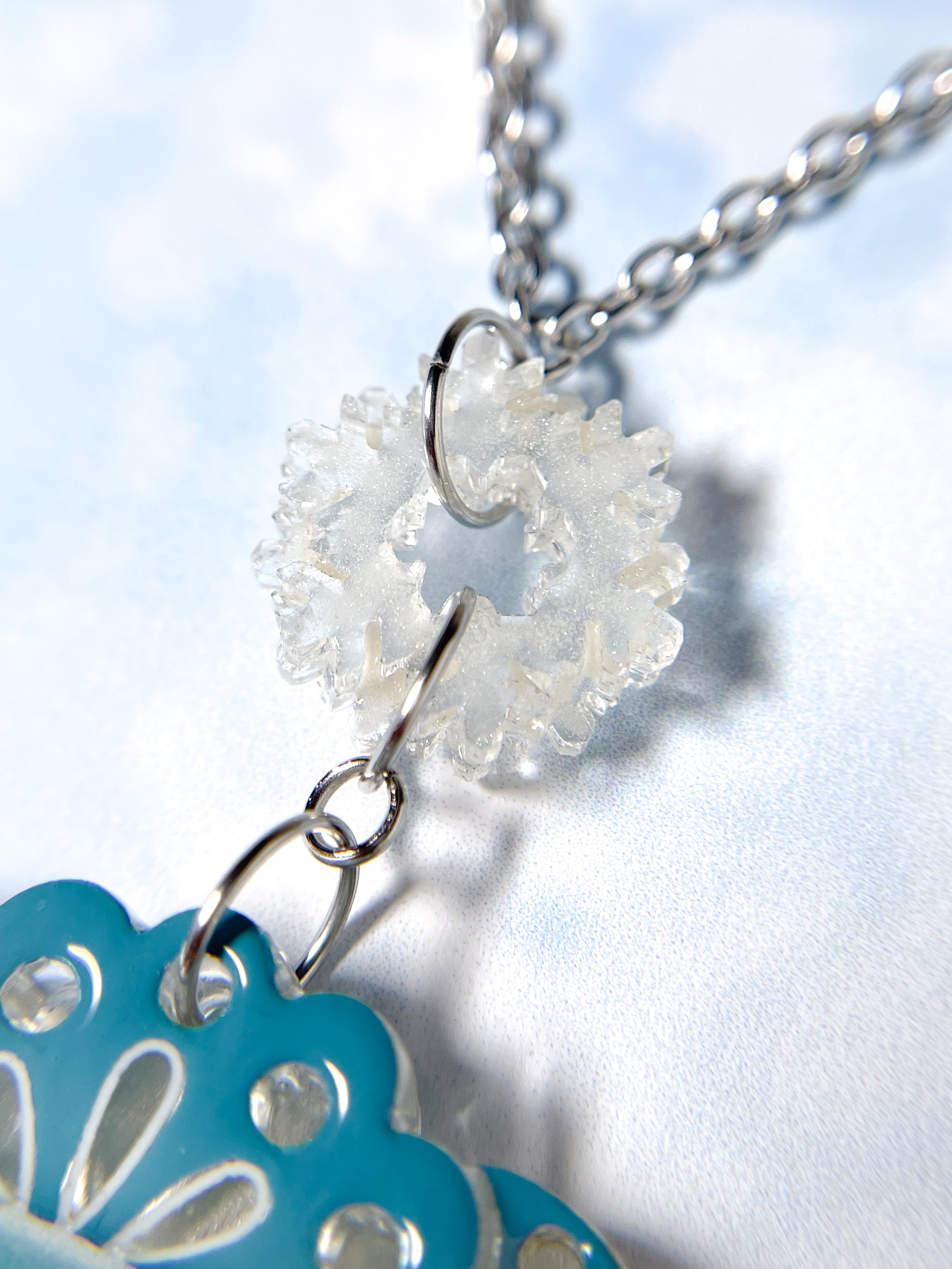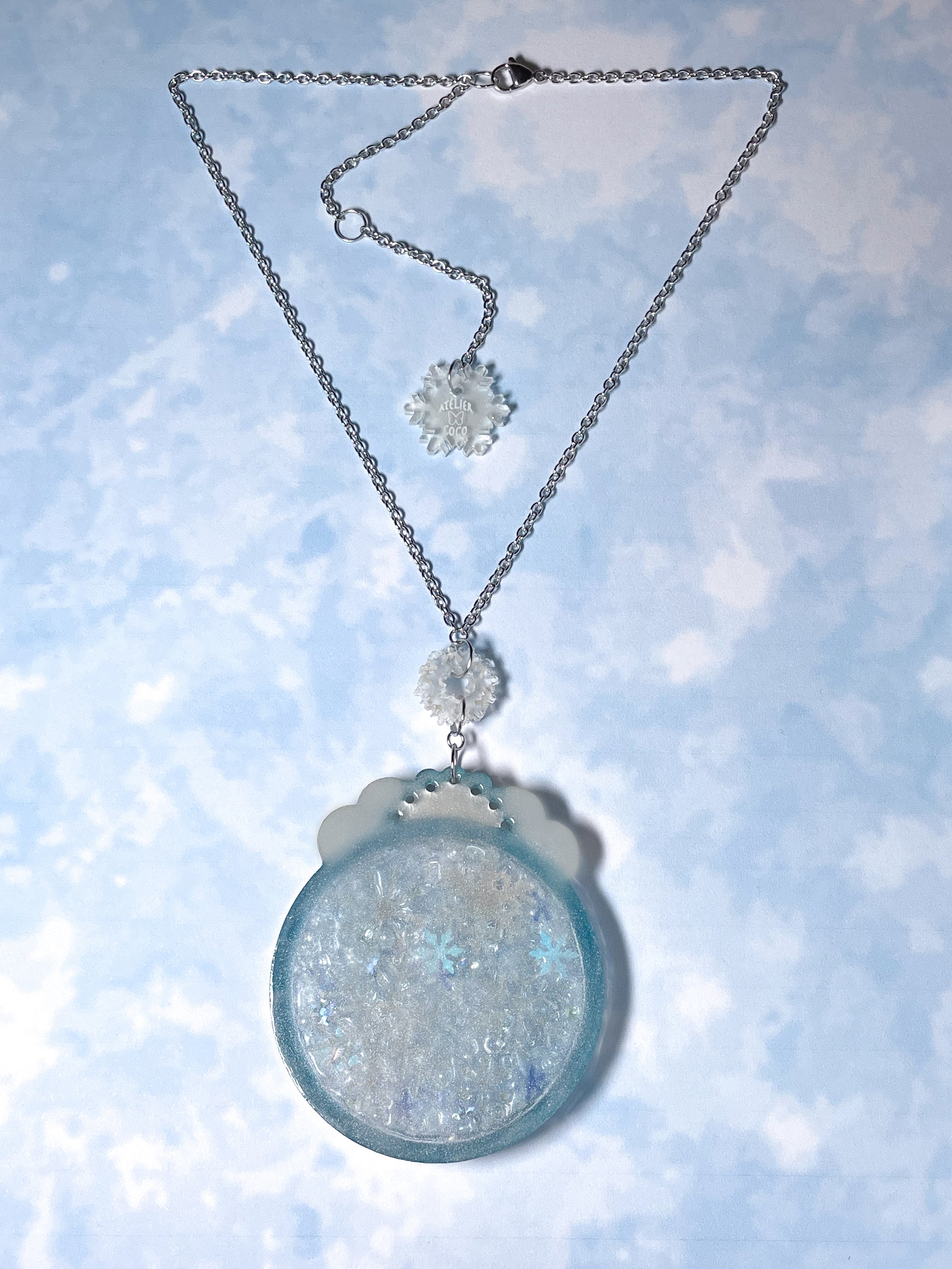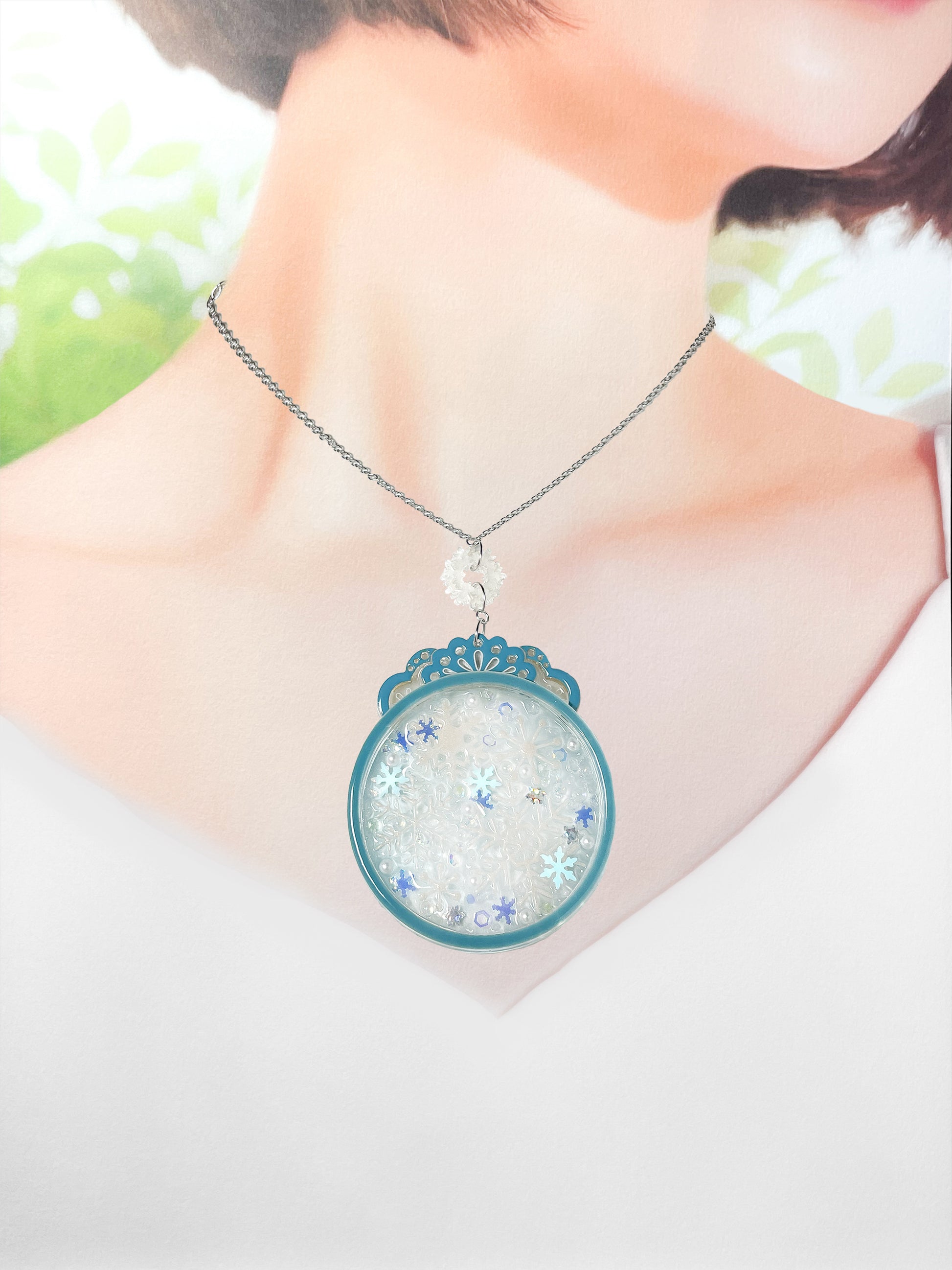 This necklace is made from 14 pieces of hand-painted acrylic plates, 1 transparent sheet and decoration mix  (phosphorescent sand, glitters, snowflakes, pearls, bullion, etc.), assembled and coated with acrylic UV/LED resin and finished with a silver surgical stainless steel chain with an extender.