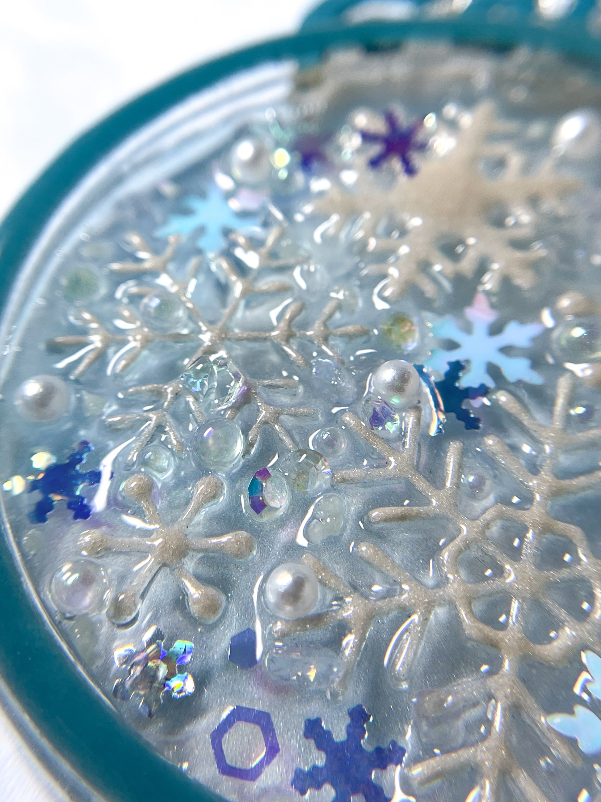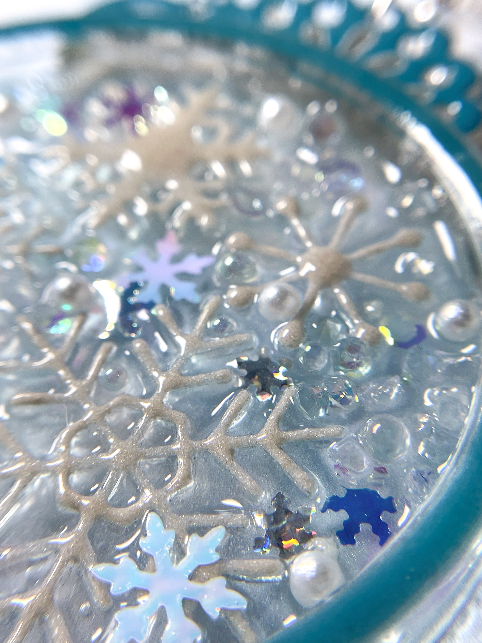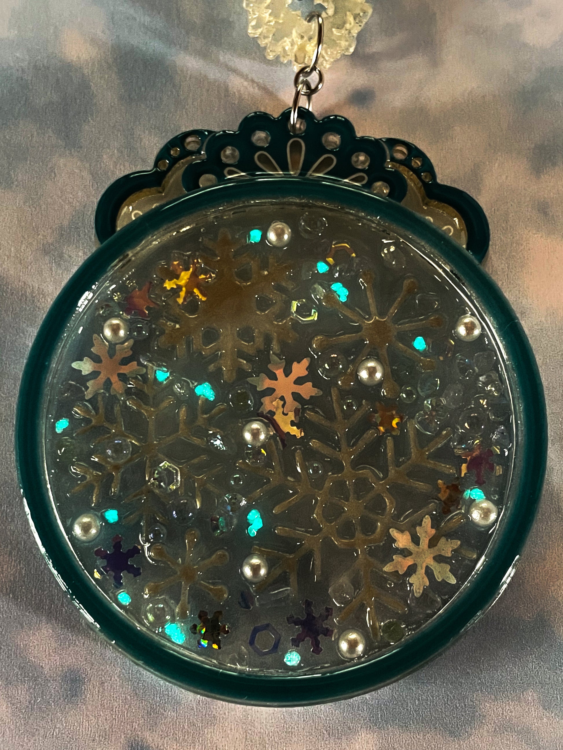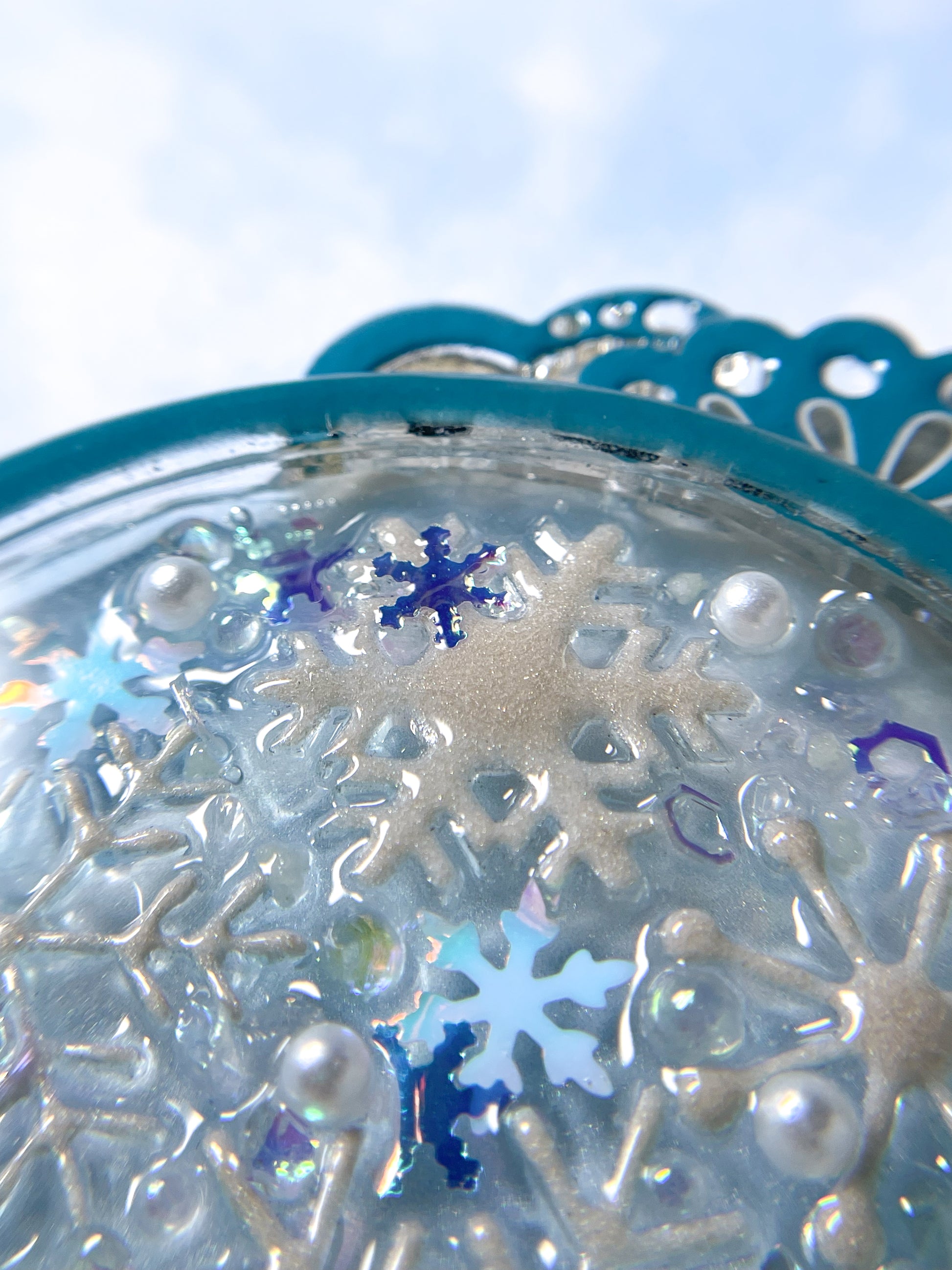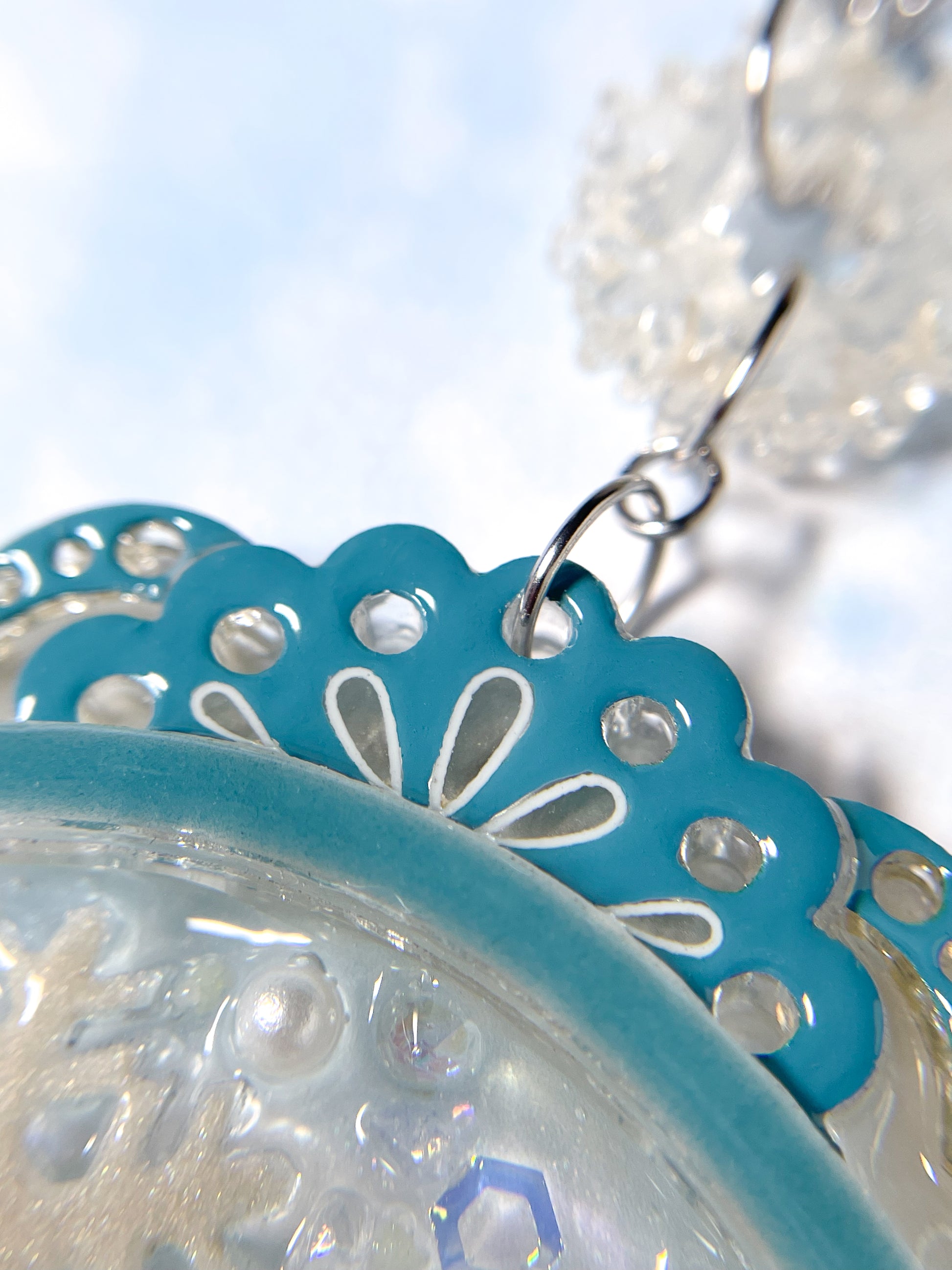 This necklace is made from 14 pieces of hand-painted acrylic plates, 1 transparent sheet and decoration mix  (phosphorescent sand, glitters, snowflakes, pearls, bullion, etc.), assembled and coated with acrylic UV/LED resin and finished with a silver surgical stainless steel chain with an extender.