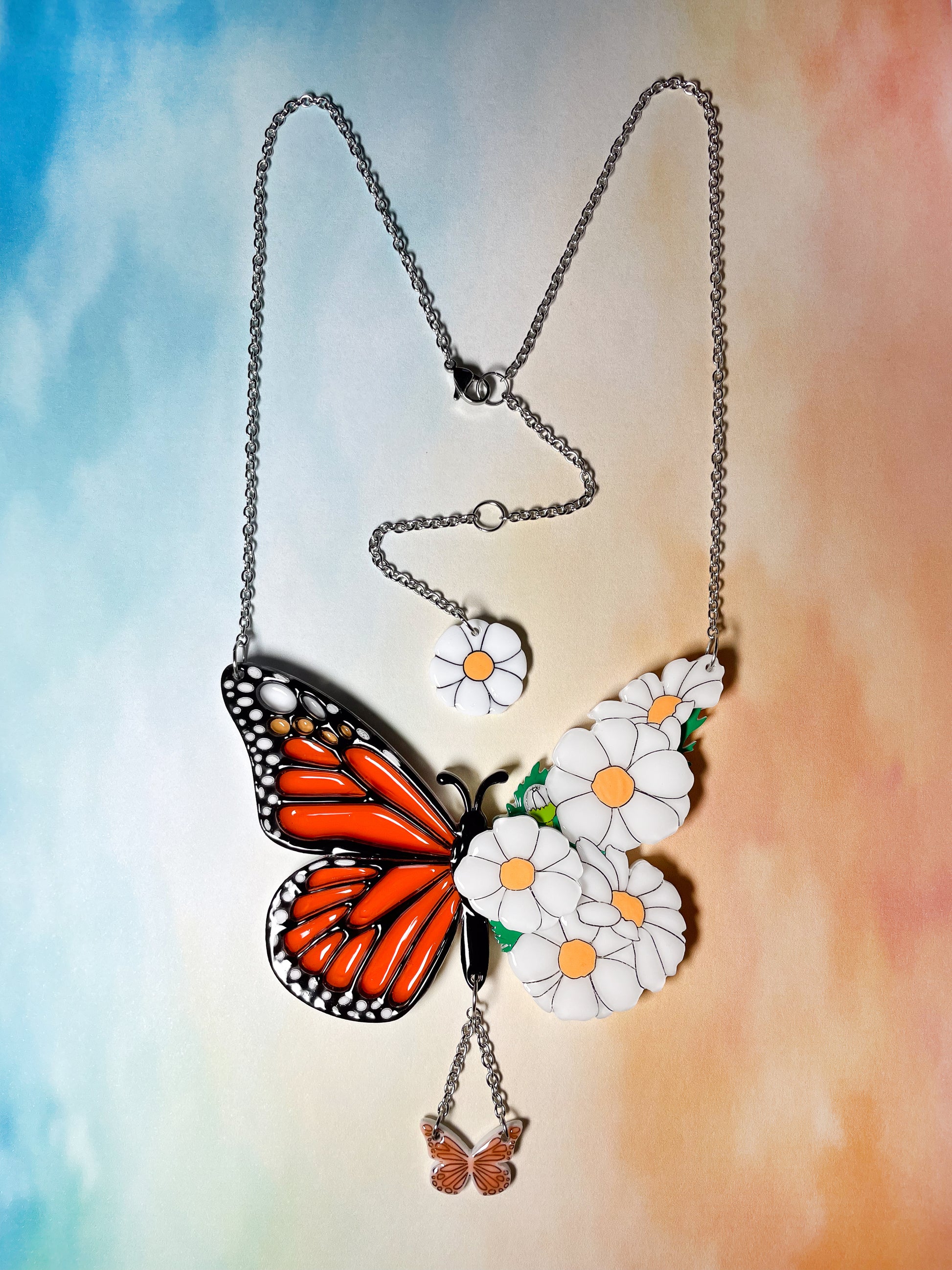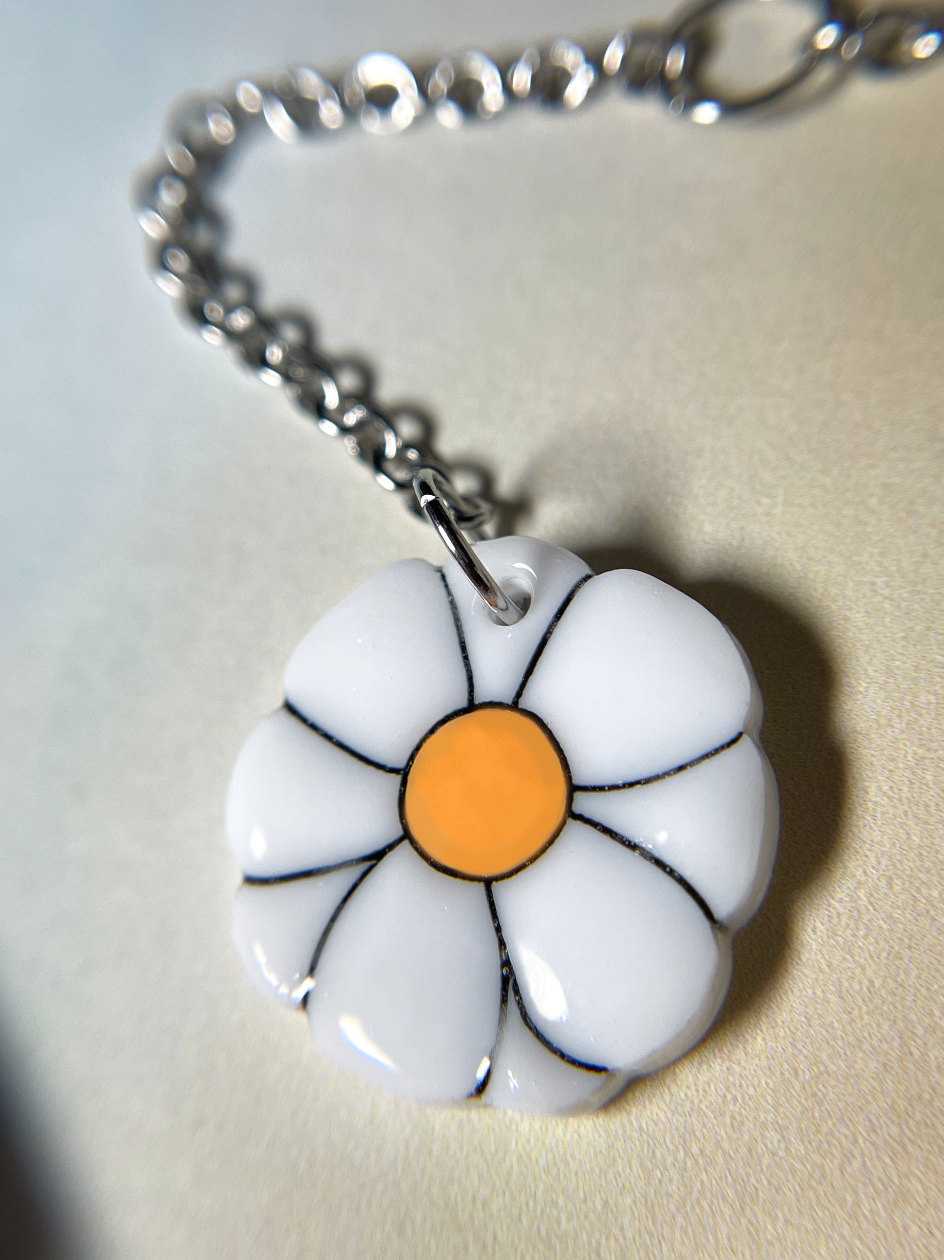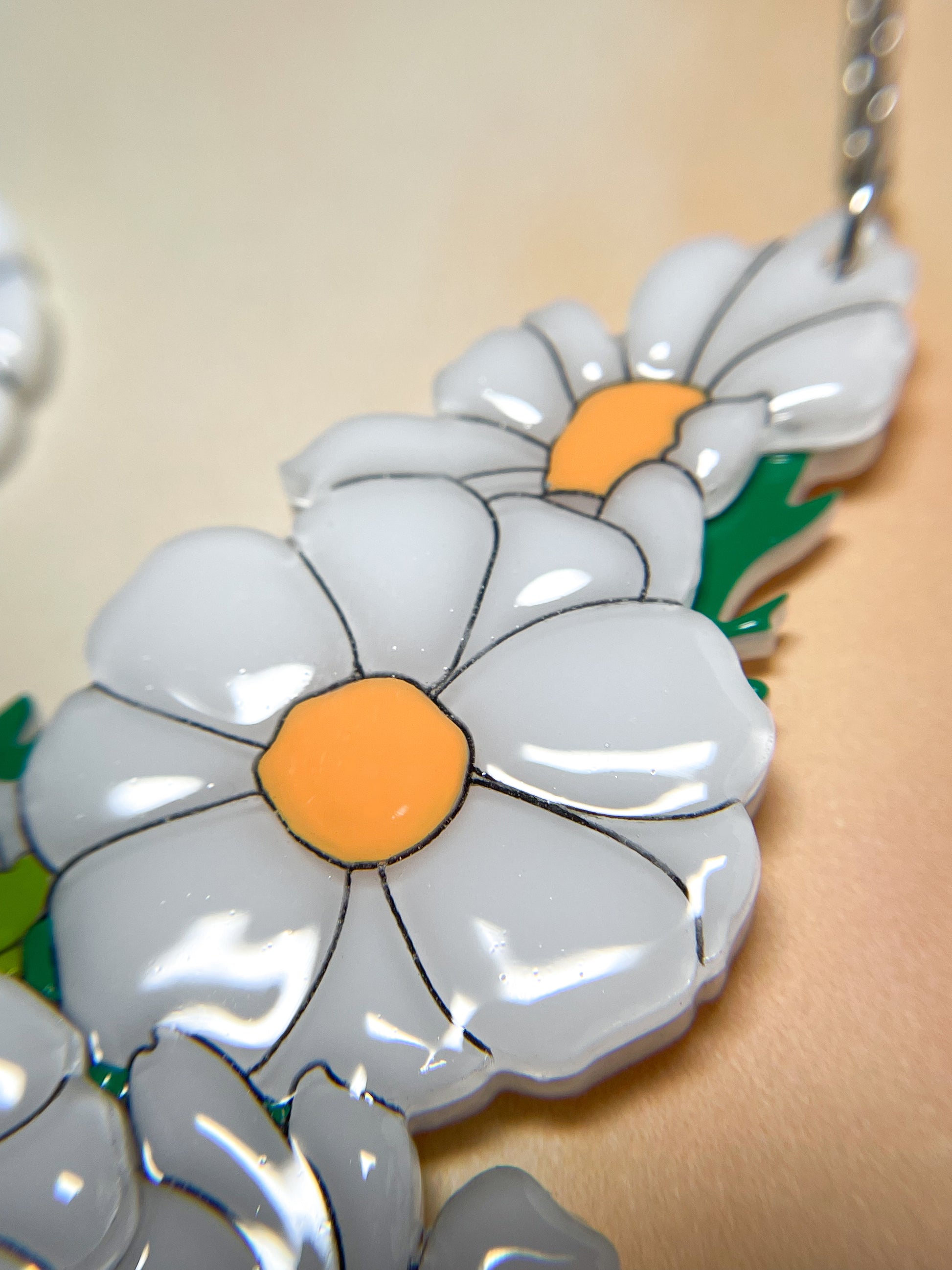 This necklace is made from 7 pieces of hand-painted acrylic plates, assembled and coated with acrylic UV/LED resin and finished with a silver surgical stainless steel chain with an extender.