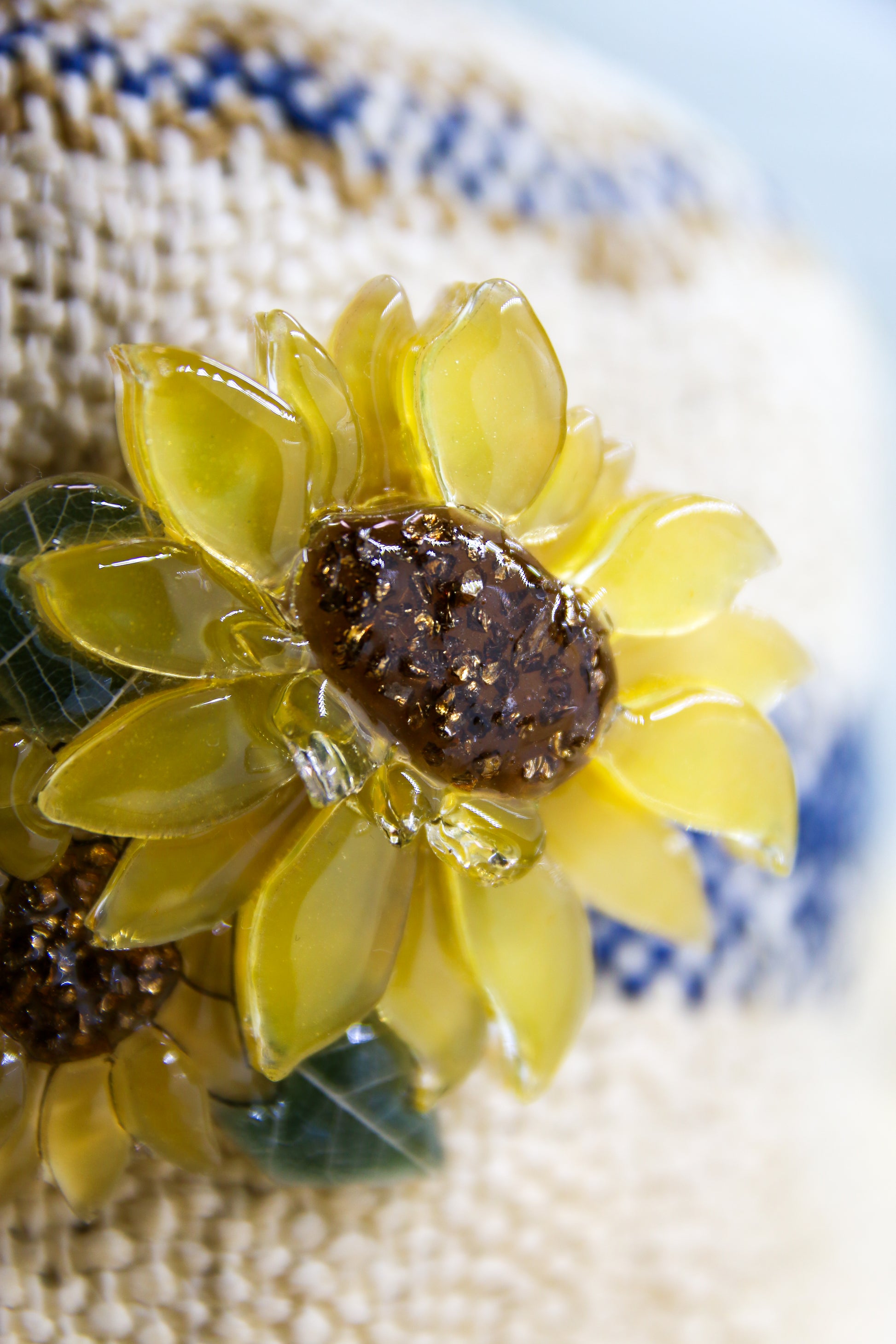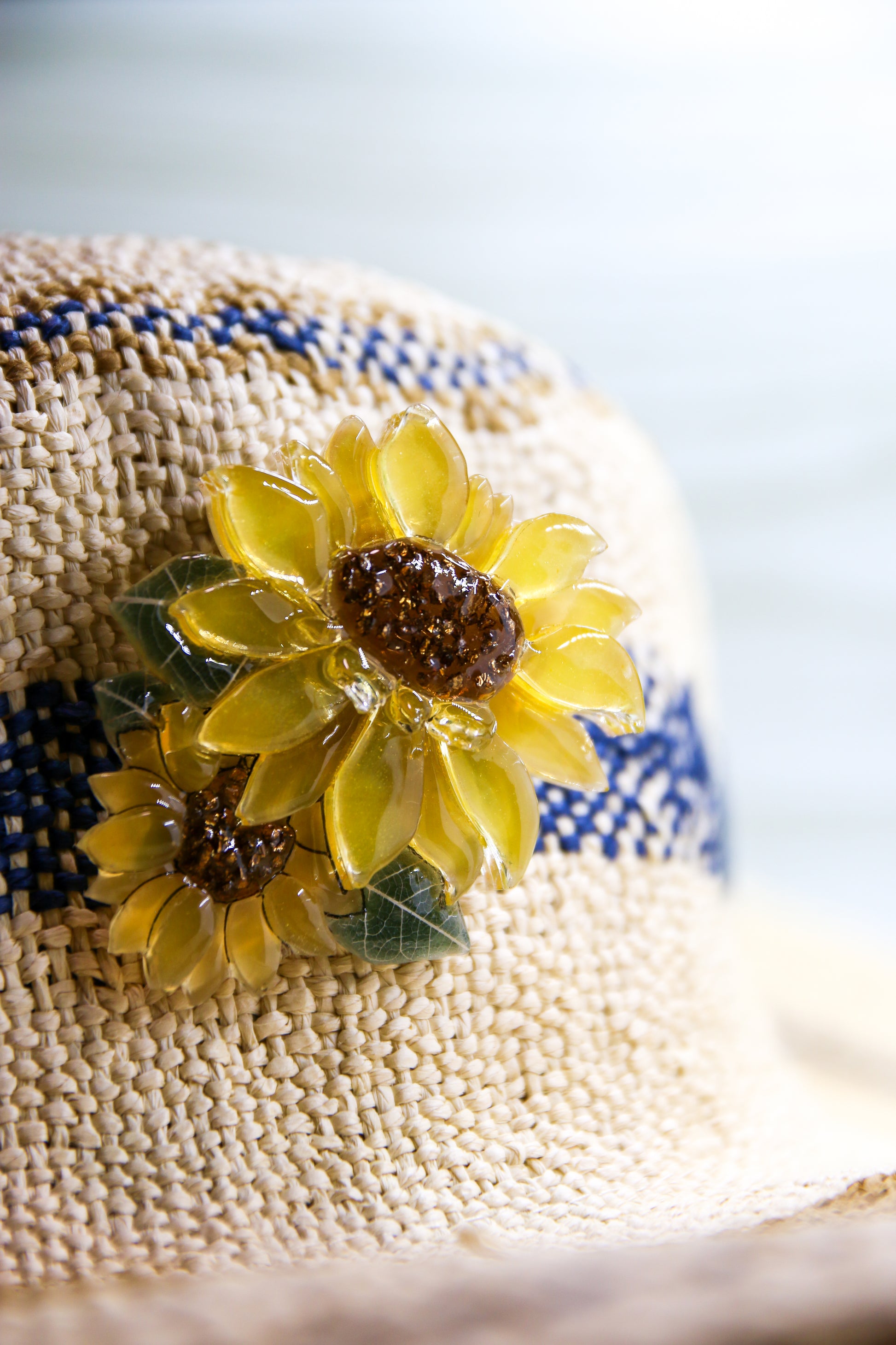 This brooch is made from 12 pieces of hand-painted acrylic plates and skeleton leafs, assembled those materials and coated with acrylic UV/LED resin and backed with a gold brooch pin.