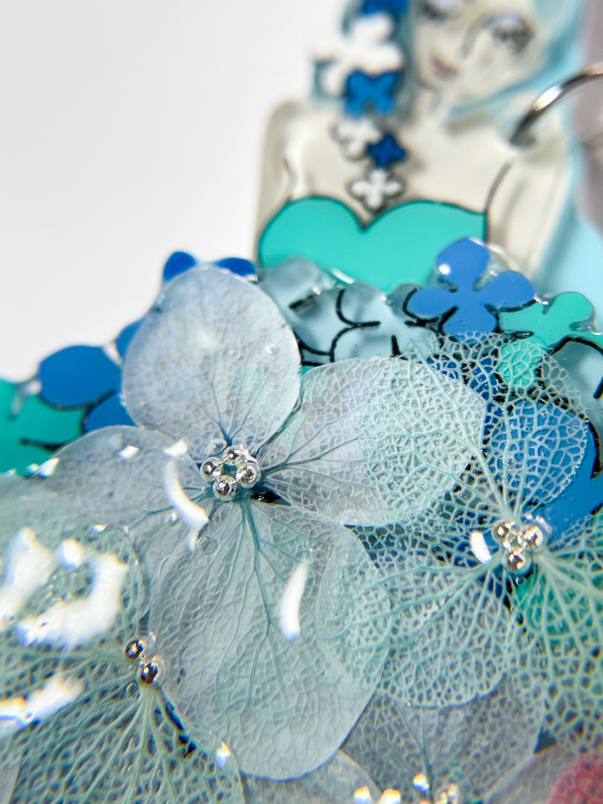This necklace is made from 14 pieces of hand-painted acrylic plates, dry hydrangeas and silver nail bullions, assembled and coated with acrylic UV/LED resin and finished with a silver surgical stainless steel chain with an extender.