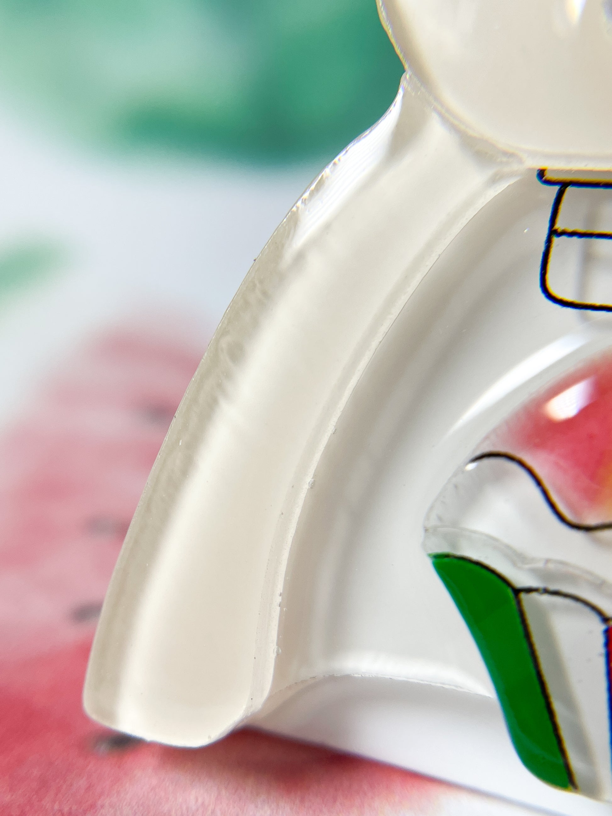 This brooch is made from 11 pieces of hand-painted acrylic plates, assembled and coated with acrylic UV/LED resin and backed with a silver brooch pin.